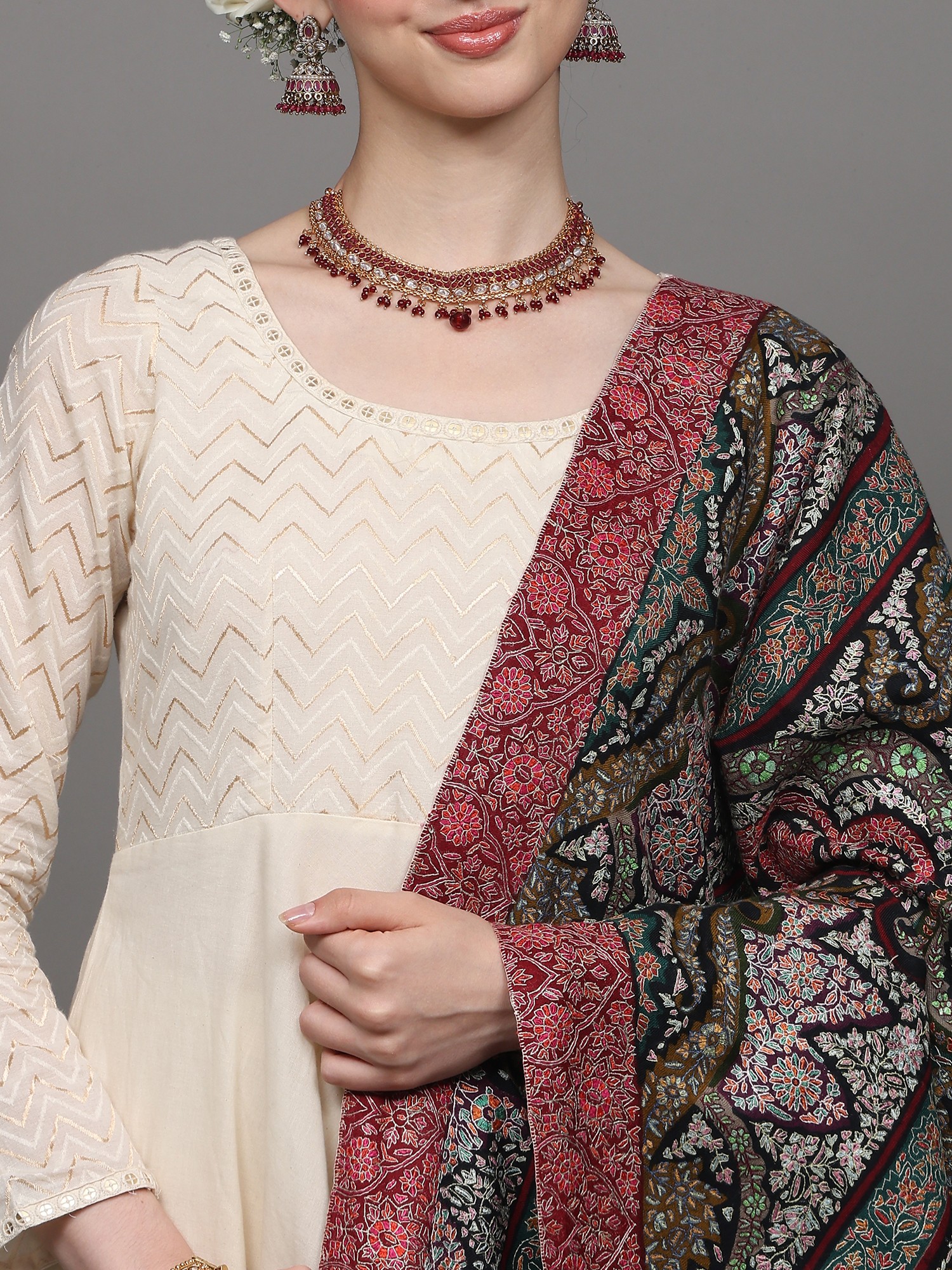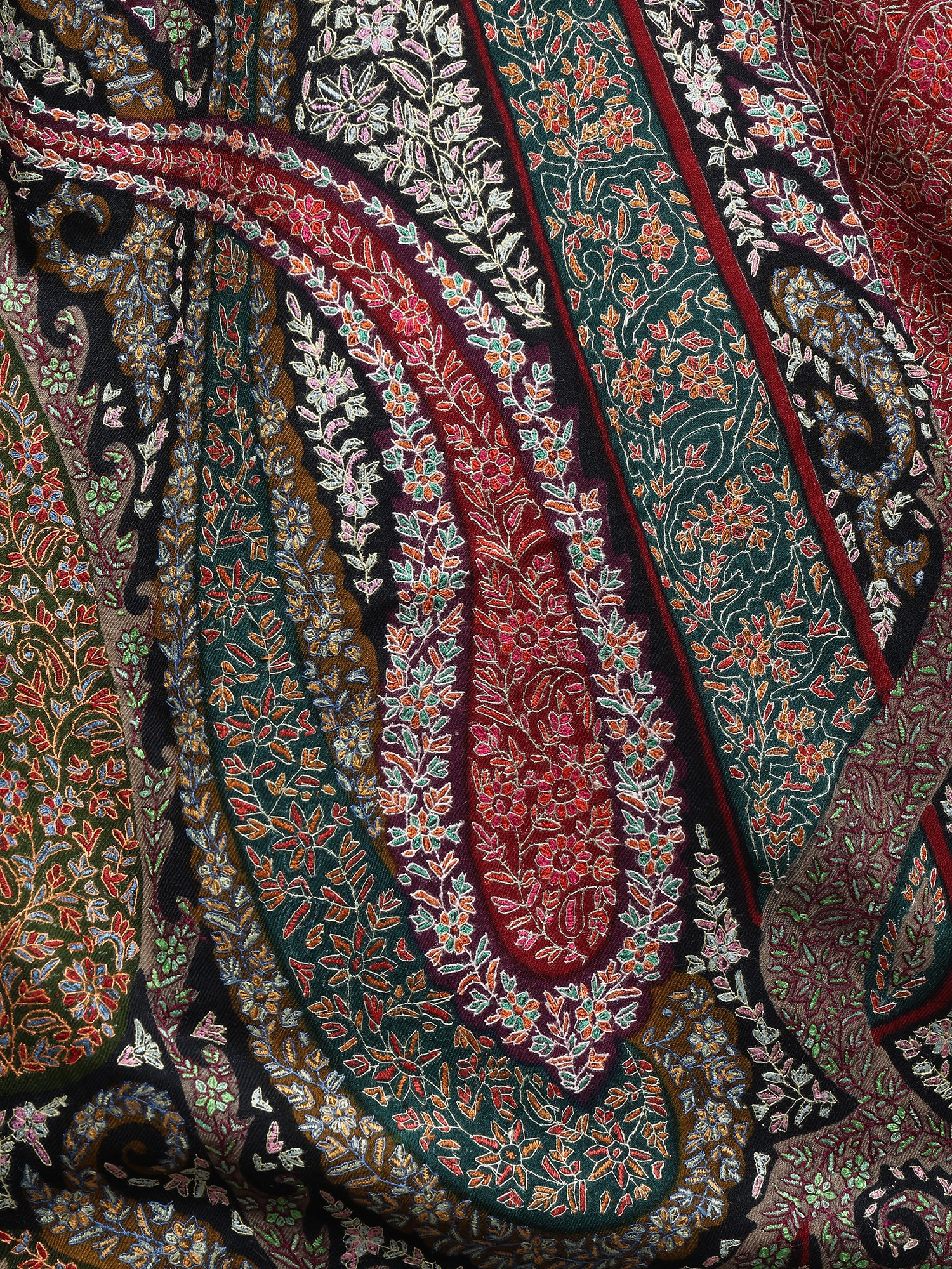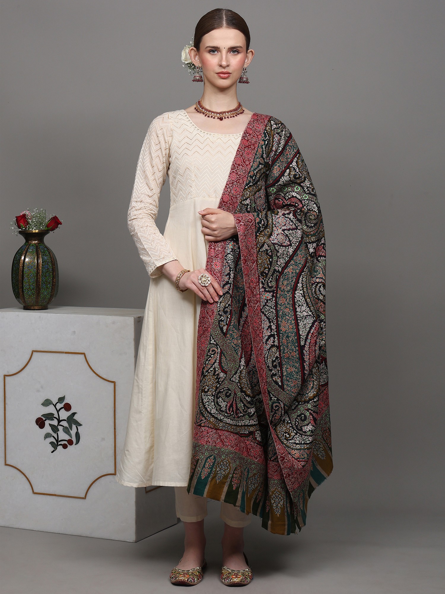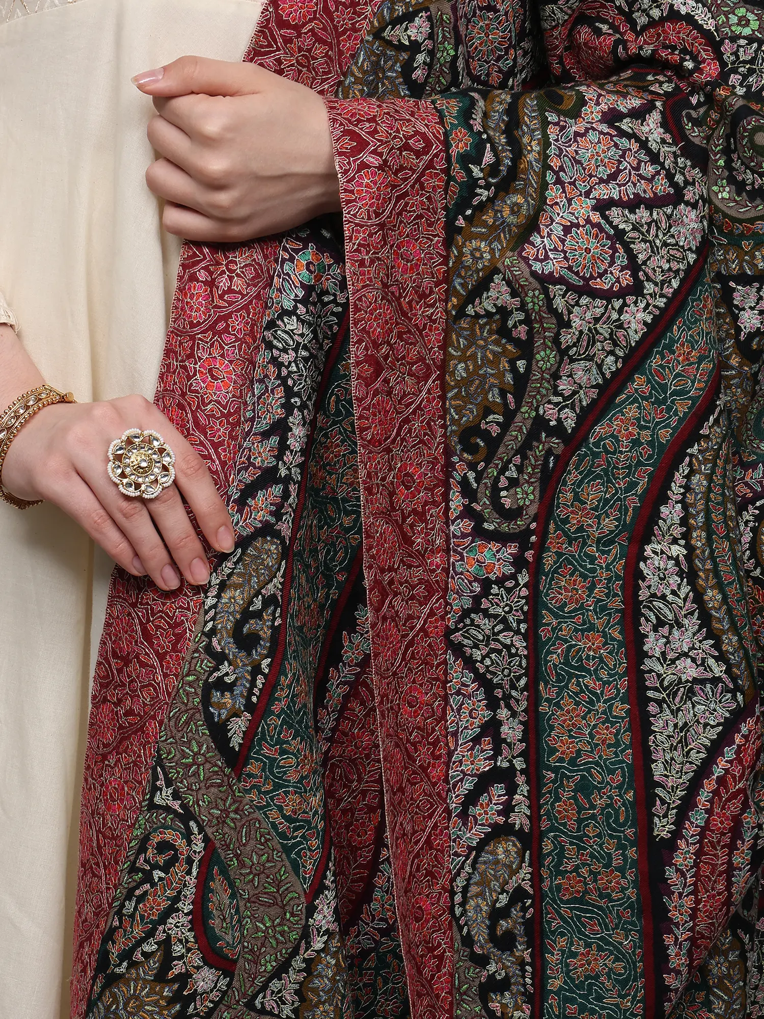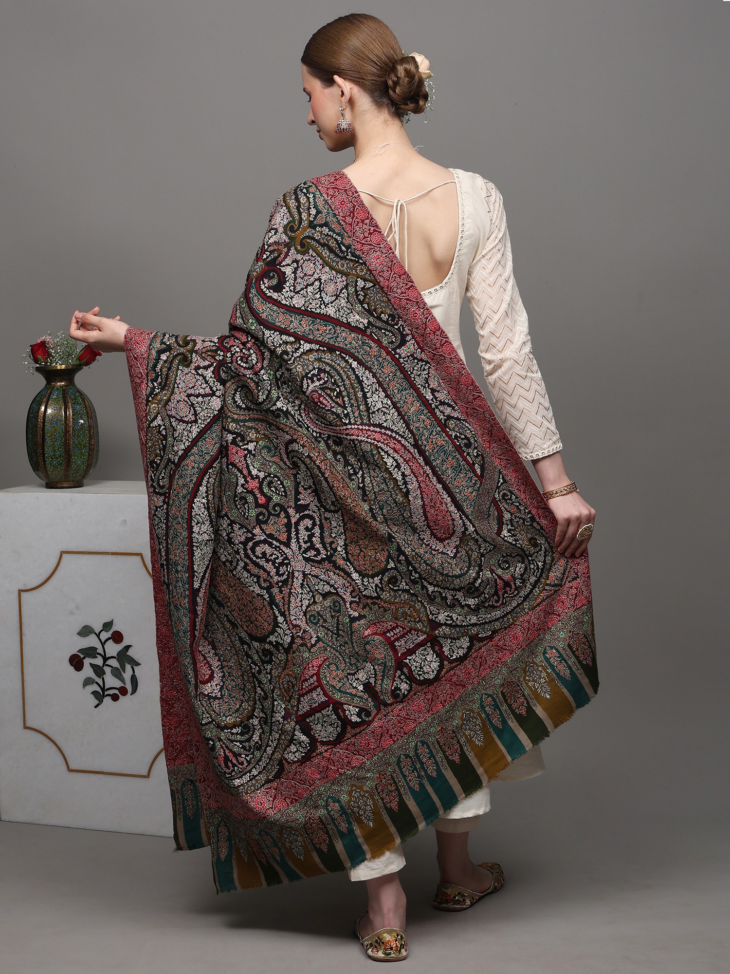 This Pashmina Multicolored Shawl is an extravagance of art and tradition. It is adorned with large but upside-down paisley patterns, traditionally known as Badam Tarah, embroidered using intricate Jamawar work. In this regard, golden and silver threads are employed to produce a stunning drama, enhanced with numerous colors in different hues. The spaces graciously filled with floral motifs complete the overall design. Using the Kalamkari method, the artistic fabric patterns are hand printed in the first place, and secondly, they are sewn with the help of the finest of needles, forming an art that represents the combination of culture and sophistication, thus making this shawl an epitome of excellent craftsmanship.