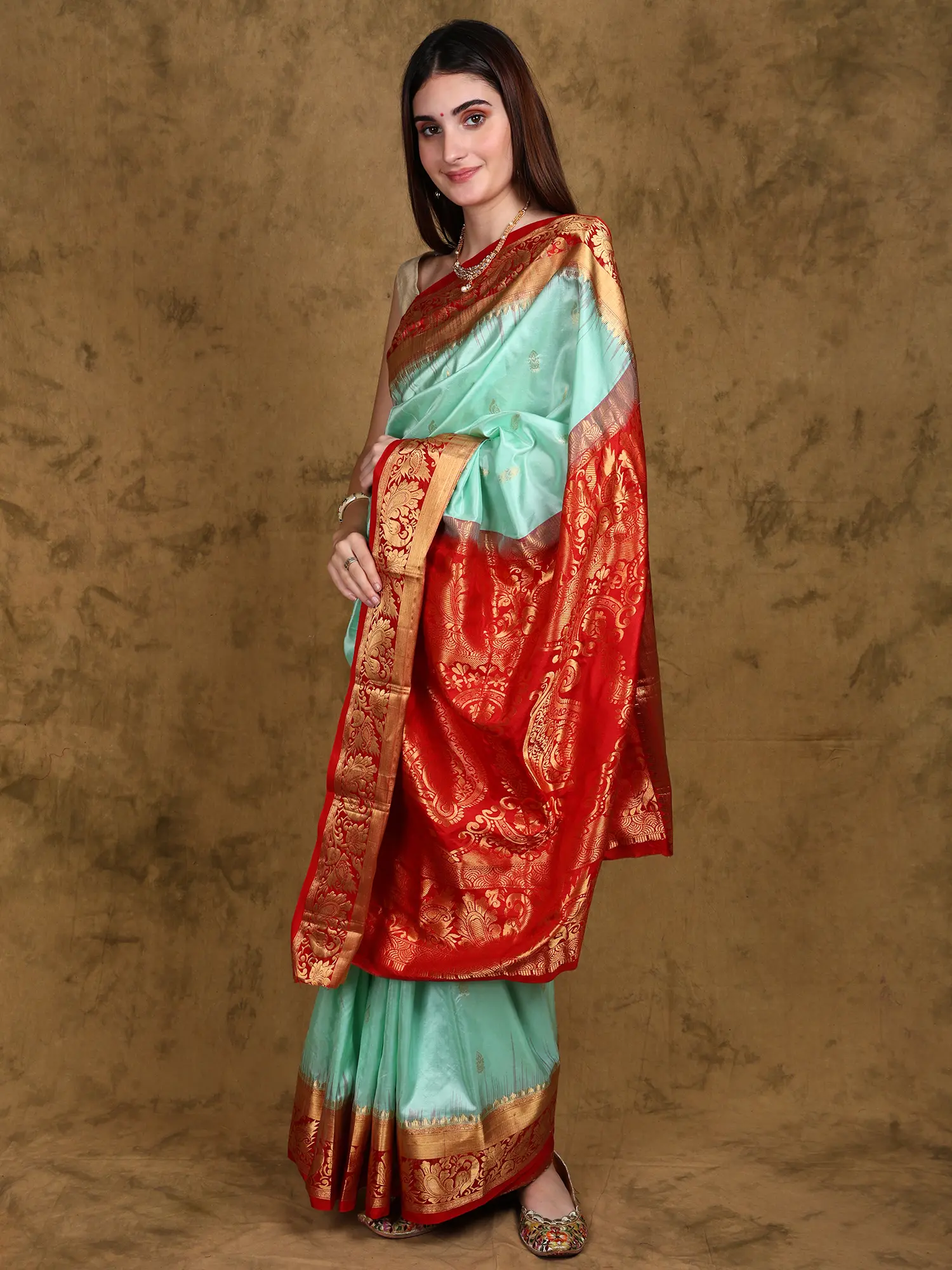 Crafted from 100% pure silk, this saree drapes effortlessly, offering a luxurious feel against the skin. The intricate golden threadwork is a testament to the dedication and skill of the artisans who created it. Each thread is carefully placed, reflecting the commitment to quality that defines this exceptional piece. The drape, weight, and overall feel of this saree will make you feel confident and effortlessly glamorous.
