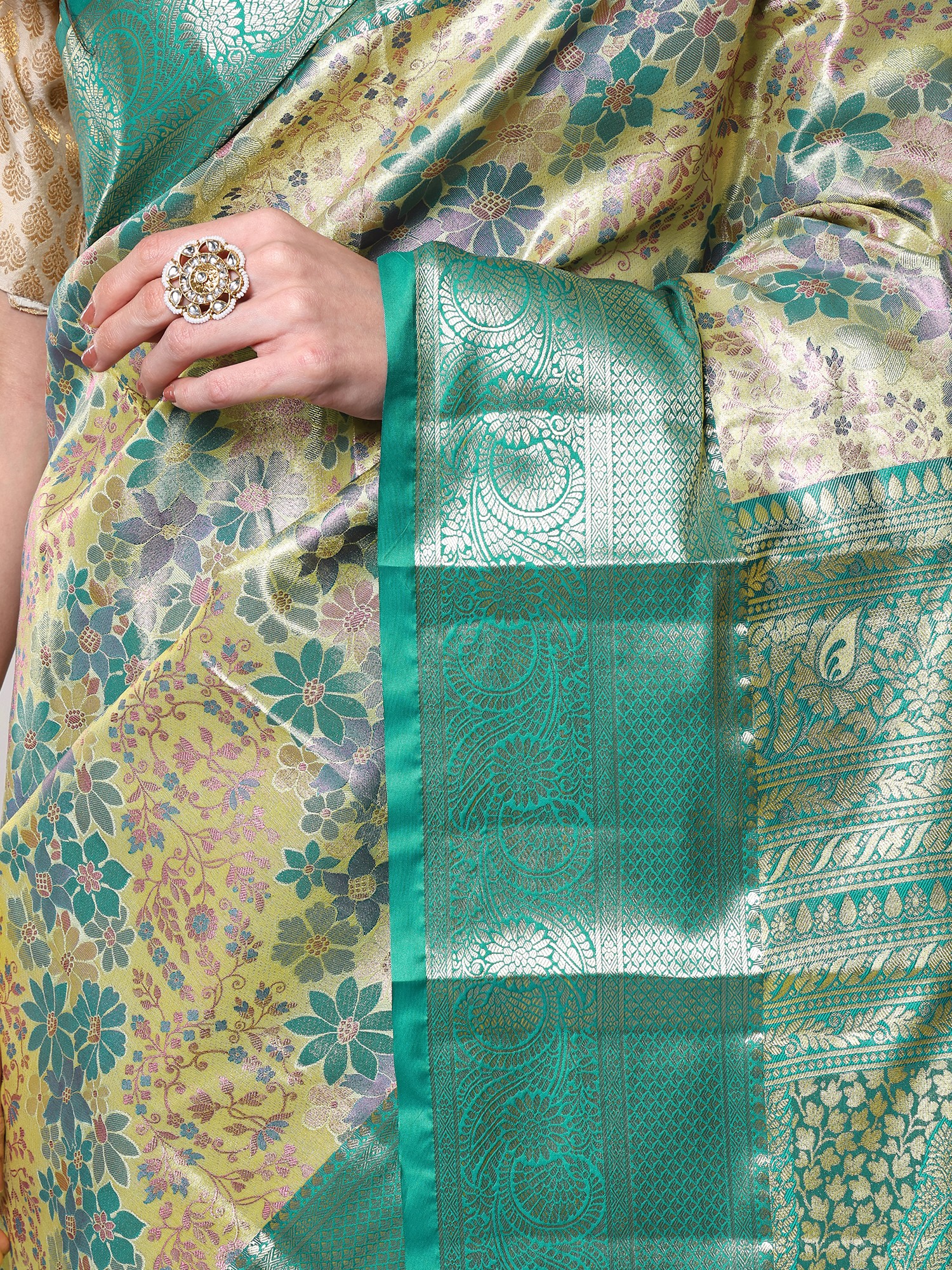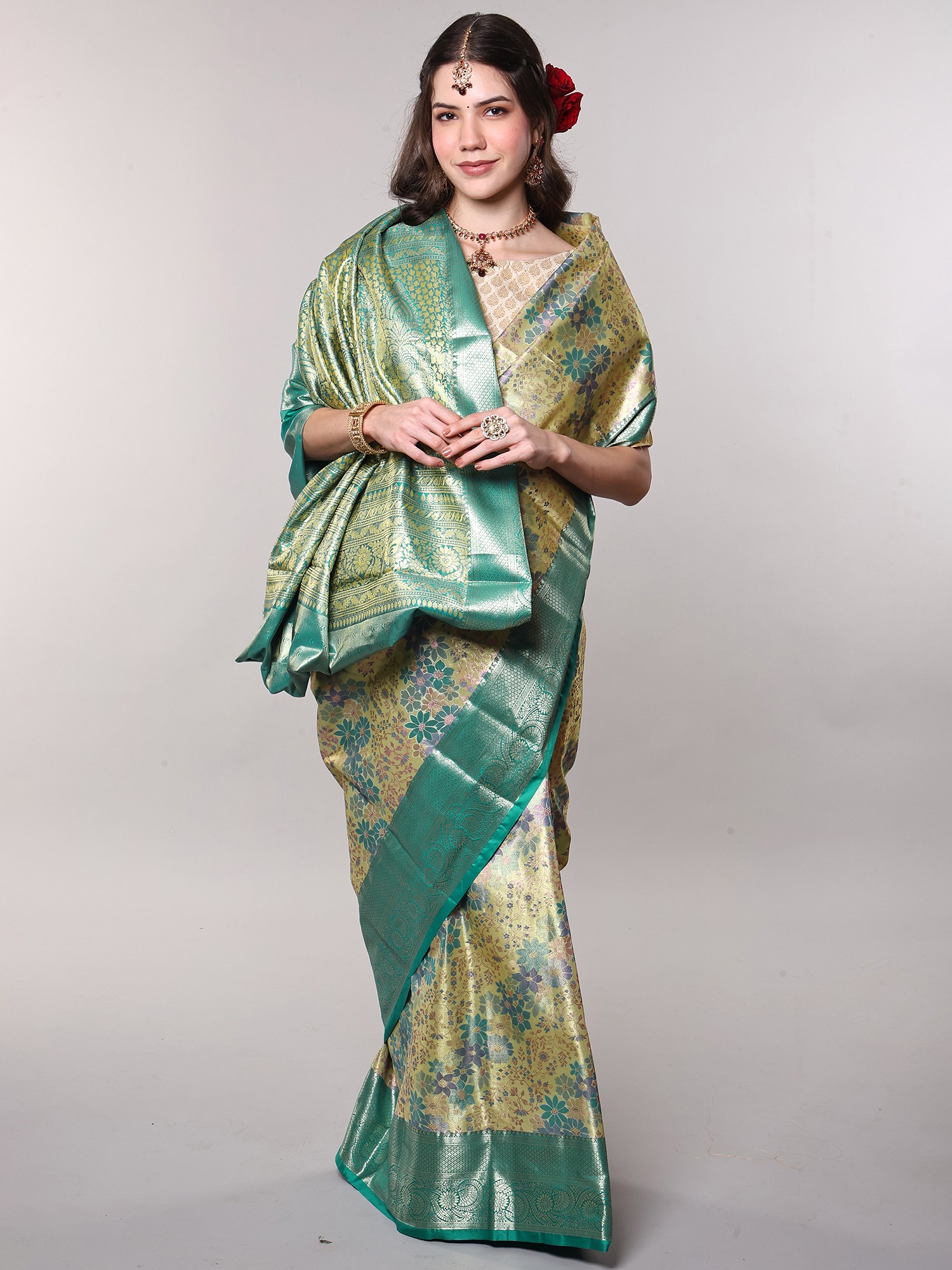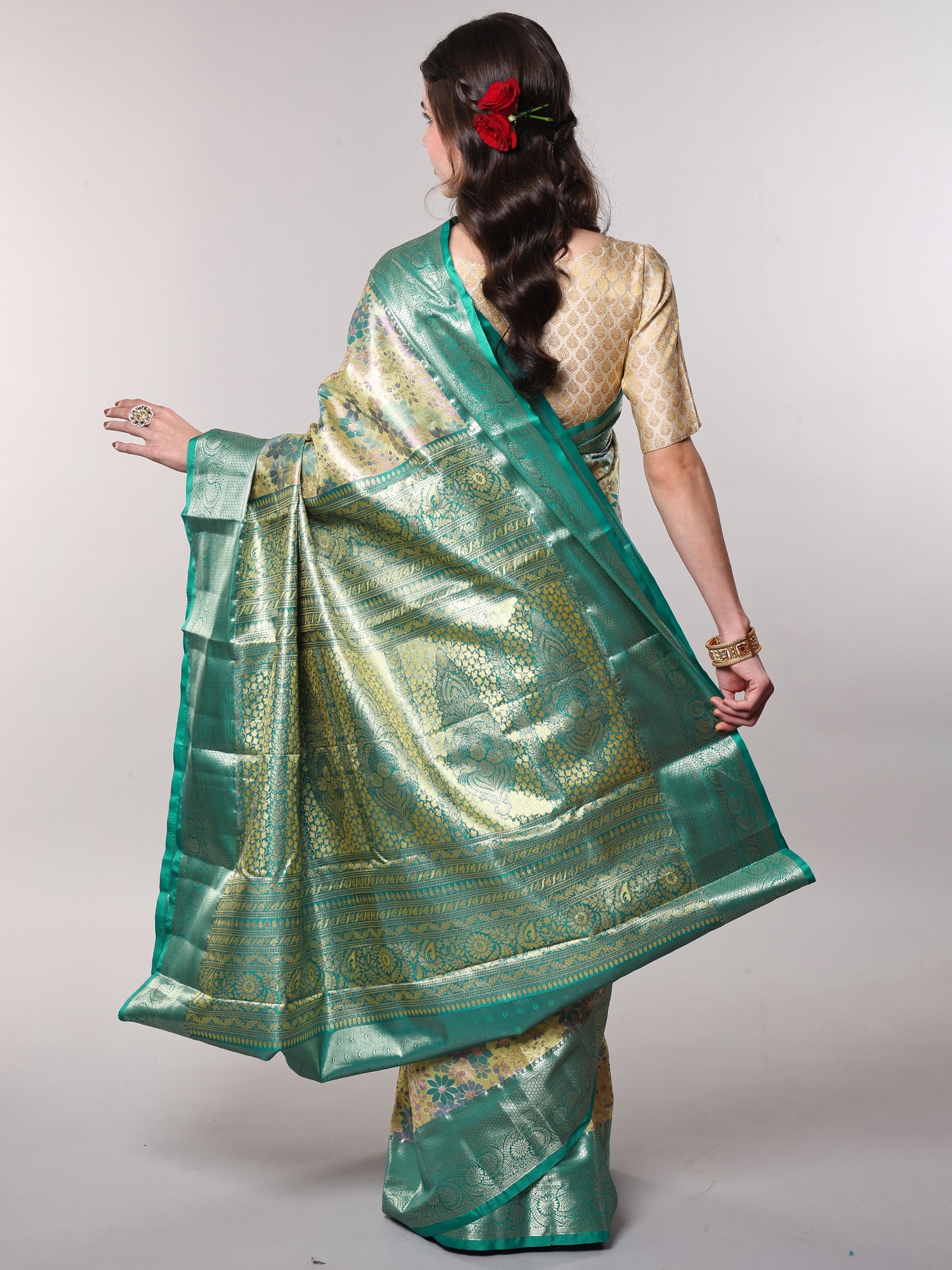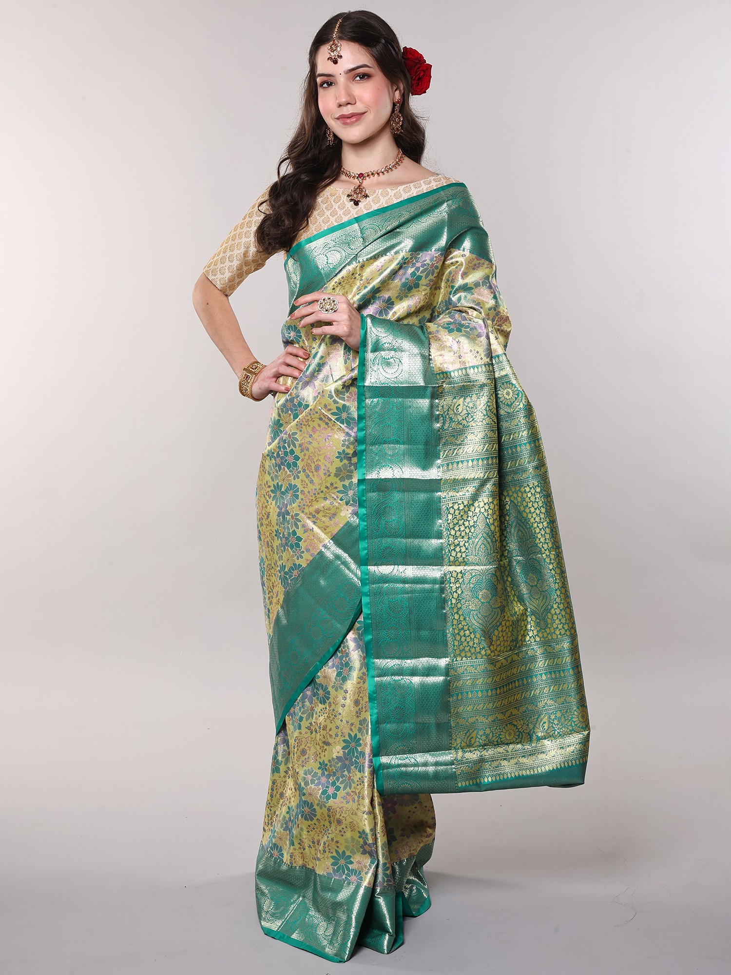 The body of the saree is adorned with a delicate and enchanting floral vine motif, intricately woven into the silk. These blossoms, rendered in subtle hues of blue and lavender, appear to dance across the lustrous ivory and gold base, creating a captivating visual symphony. Complementing this floral artistry is the opulent zari weave, which adds a touch of regal splendor. The zari threads, shimmering with a radiant golden glow, are expertly woven to form intricate patterns that catch the light with every movement, bestowing an air of sophisticated grandeur.