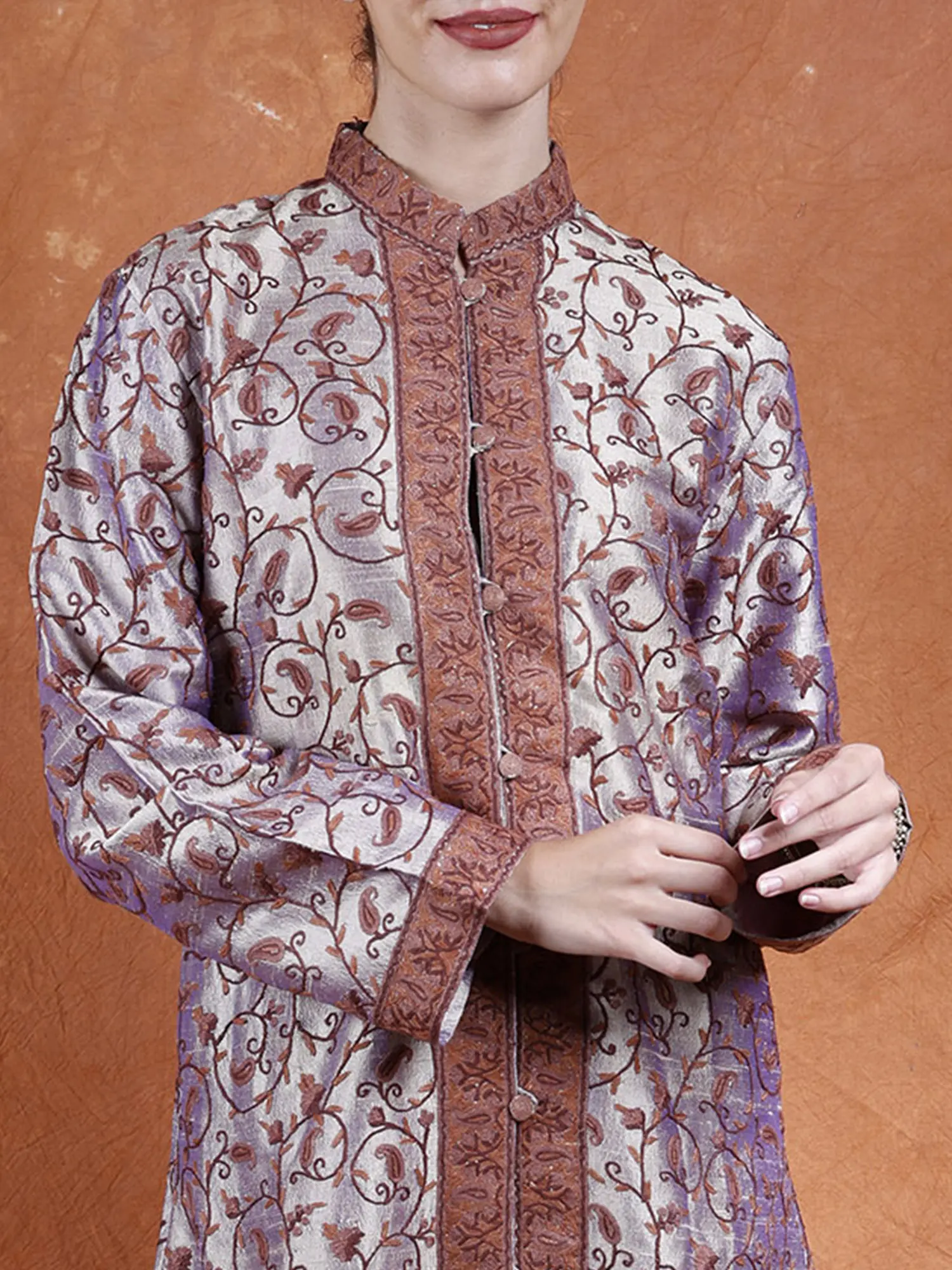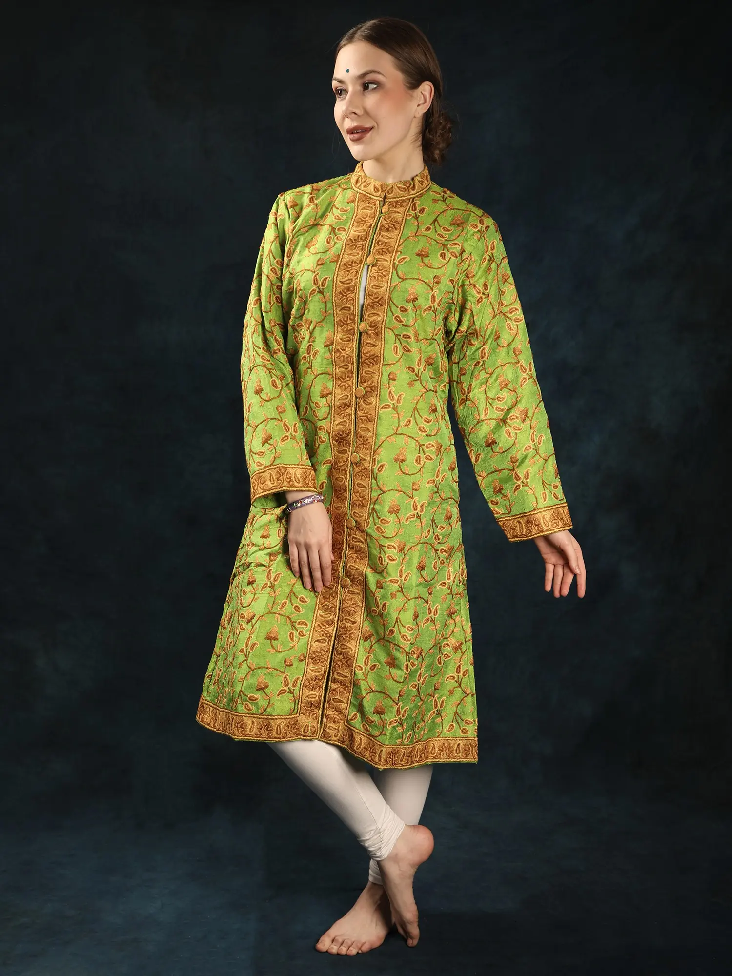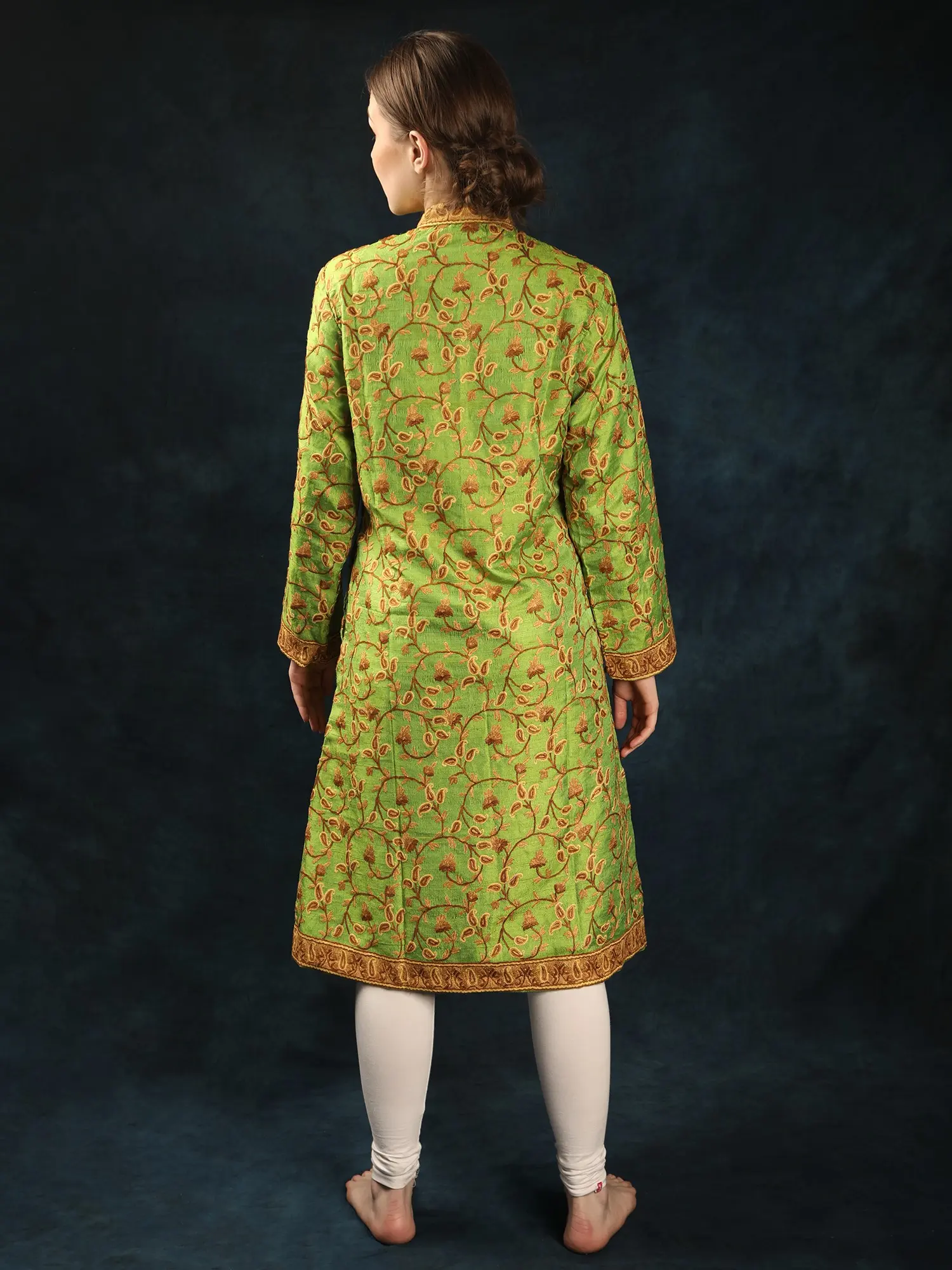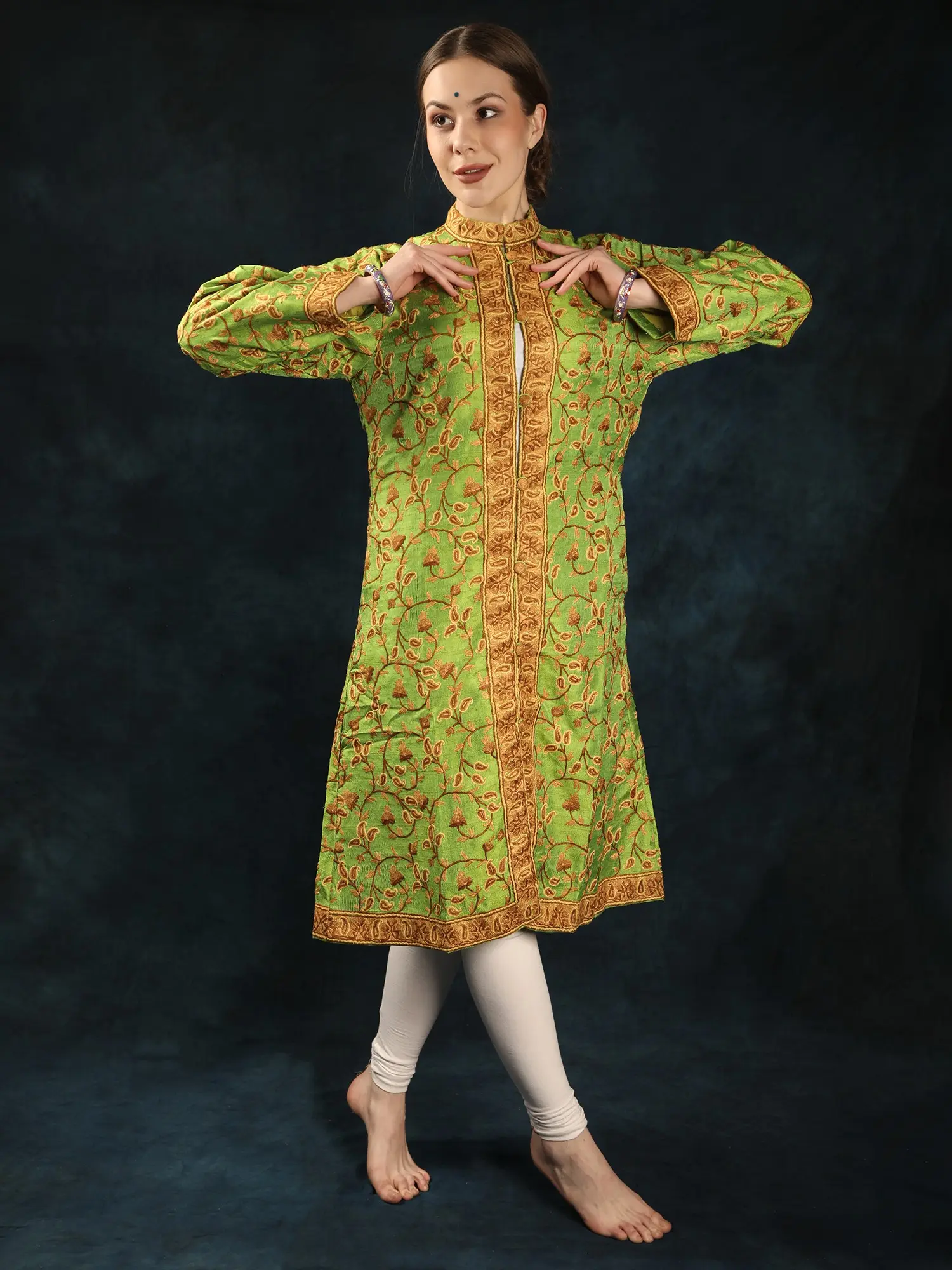 Vanilla-Custard Pure Silk Long Jacket from Kashmir with Paisleys Jaal Aari Embroidery by Hand