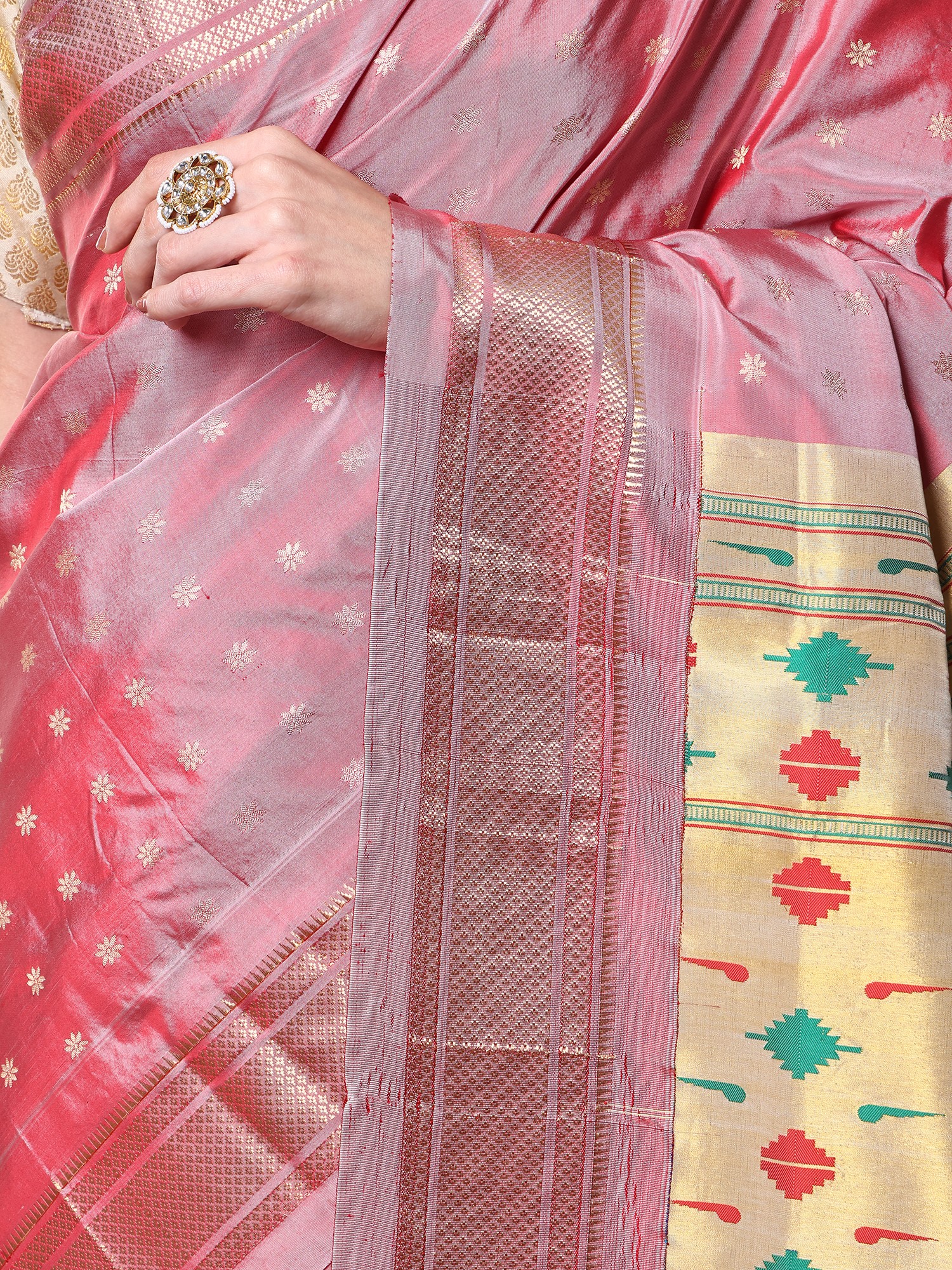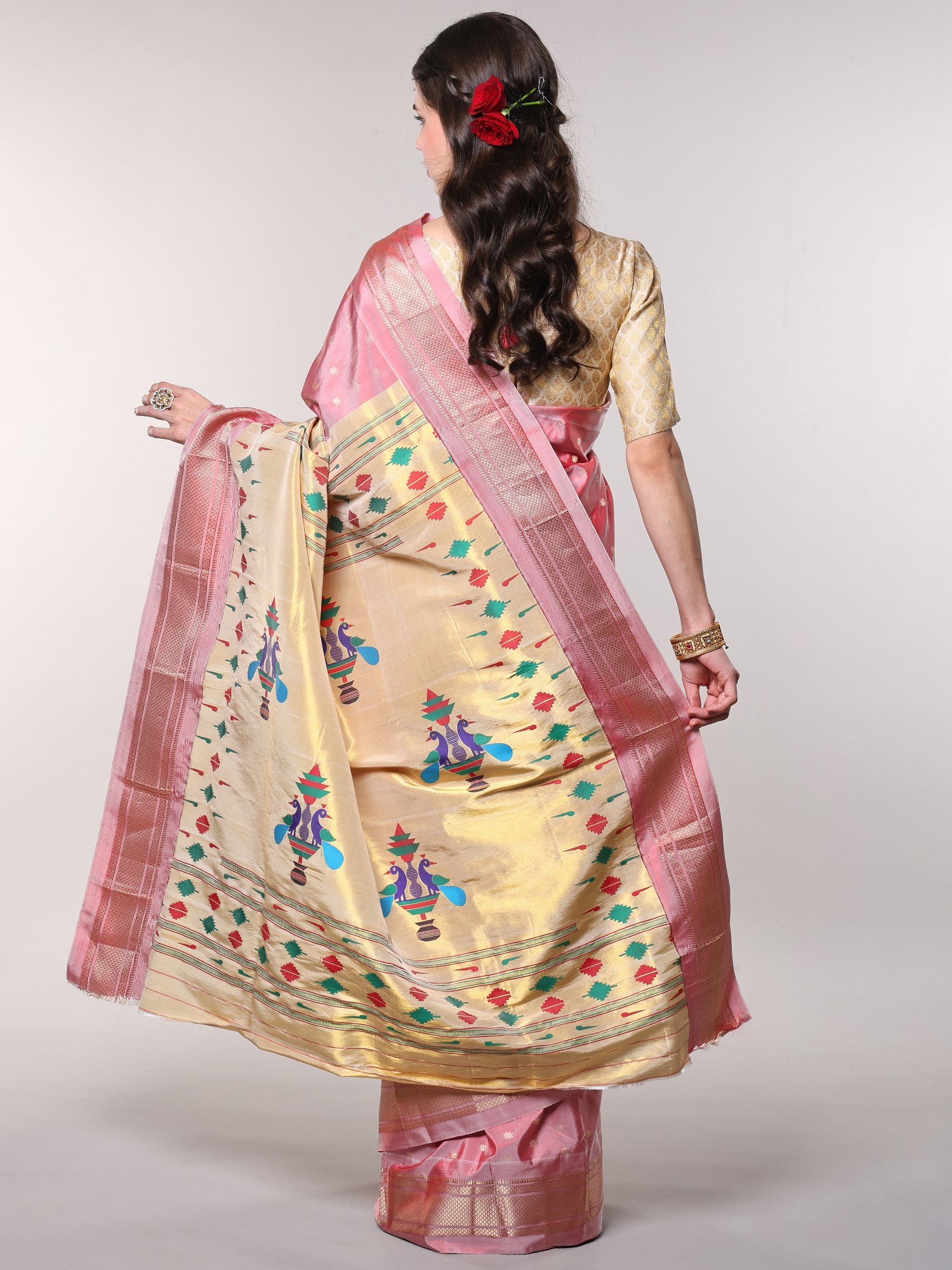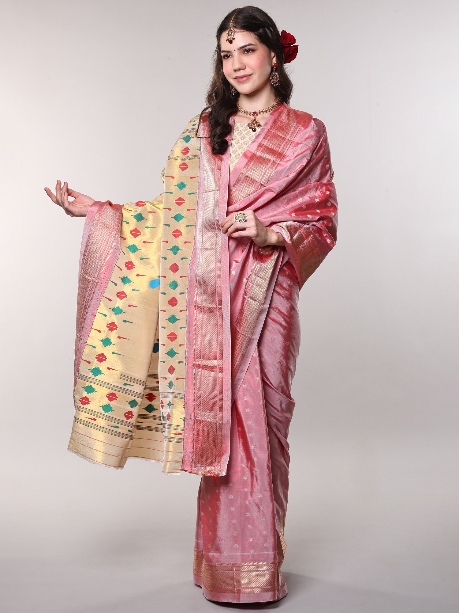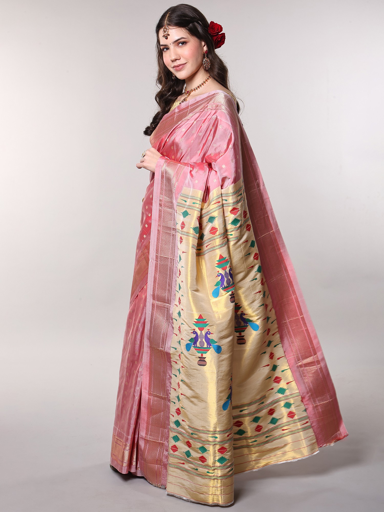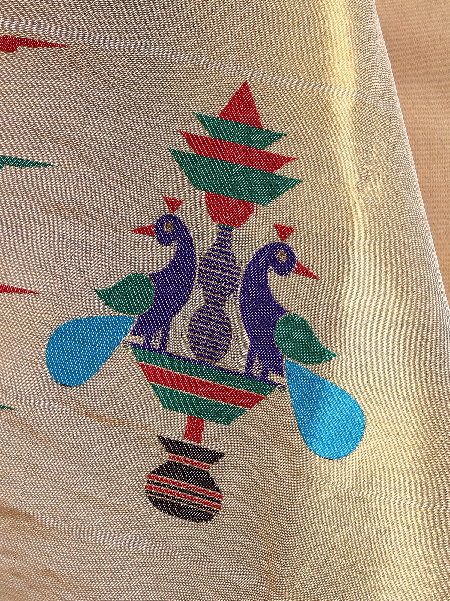 Pure Silk Paithani Saree from Bangalore with Golden Thread woven Bootis and Peacocks on Pallu