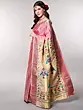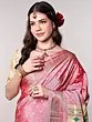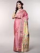 The body of the saree is adorned with delicate, golden-threaded bootis, scattered artfully like tiny stars against the gentle pink expanse. These subtle yet captivating motifs catch the light with every movement, adding a touch of understated glamour. Complementing the overall design is a broad border, meticulously woven with intricate patterns that speak volumes of the weaver's skill. The interplay of golden threads against the rich silk creates a visual symphony that is both opulent and refined.