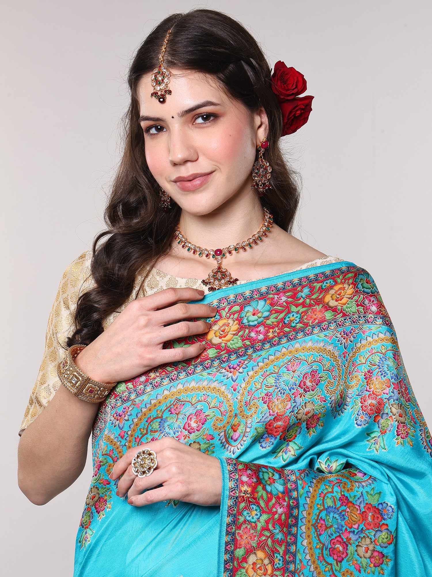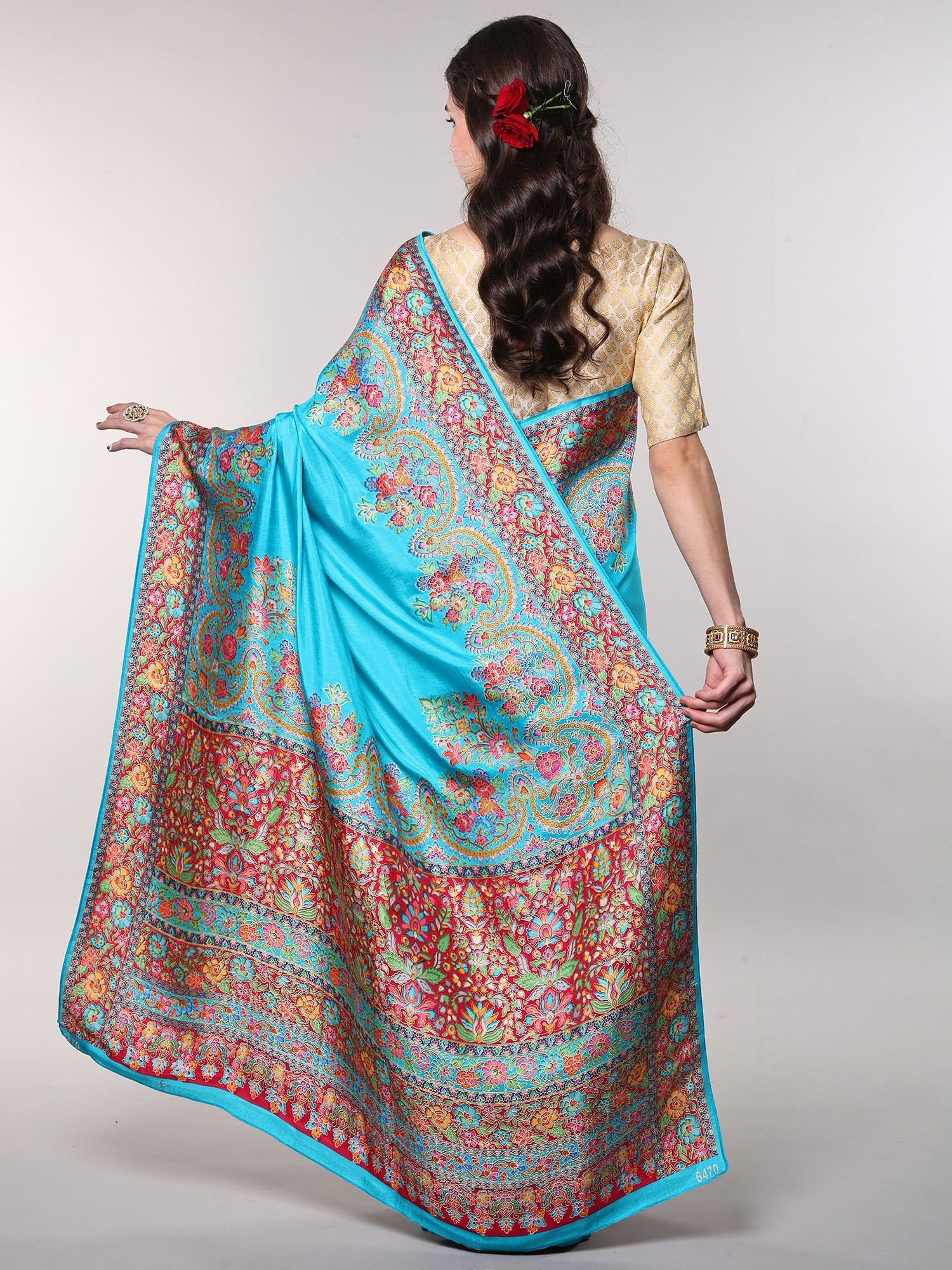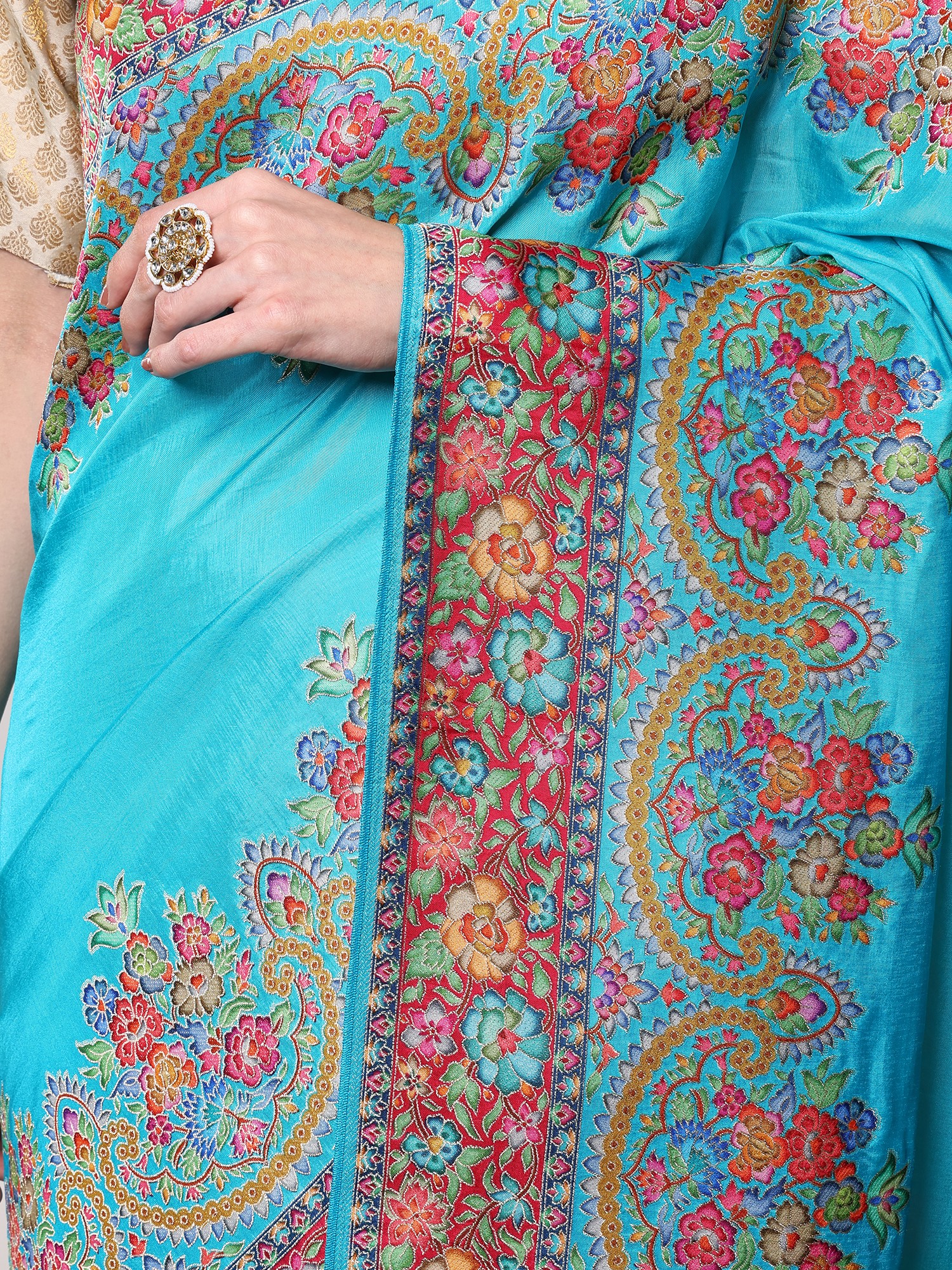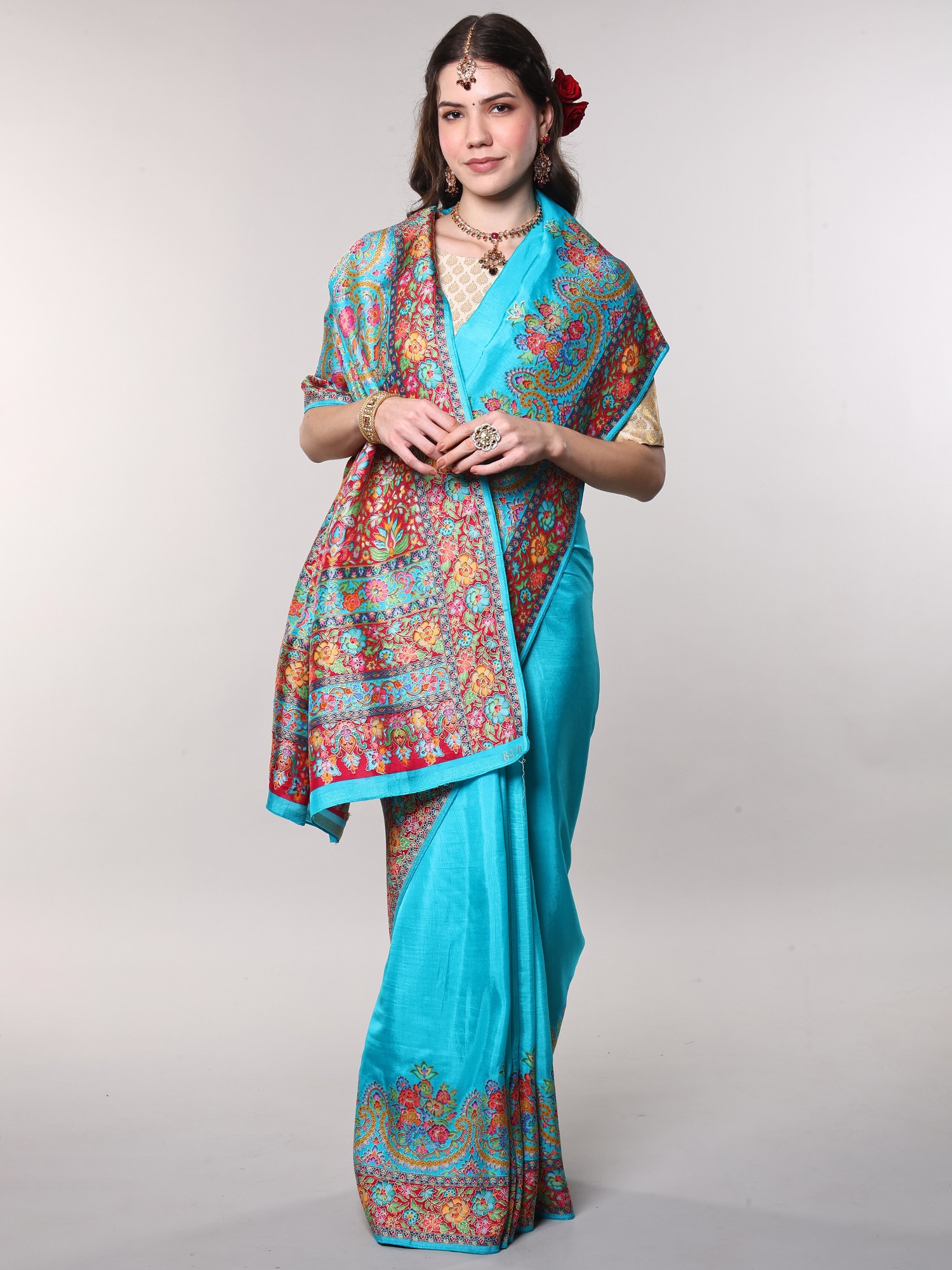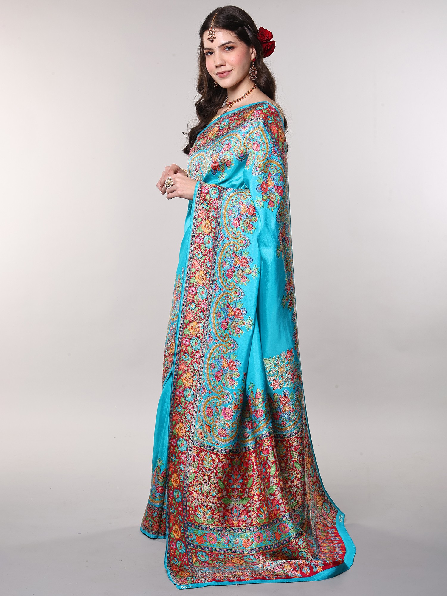 The true masterpiece of this saree lies in its resplendent border, a vibrant explosion of multicolor floral motifs meticulously woven with Zari. Each floral element is rendered with incredible detail, showcasing a spectrum of blues, pinks, reds, greens, and yellows, all intertwined with golden threads that catch the light beautifully. The intricate paisley patterns nestled amongst the blossoms add another layer of depth and traditional charm, creating a visual spectacle that is both captivating and harmonious. This border is not merely an embellishment; it is a narrative woven in thread, telling stories of nature's beauty and artisanal dedication.