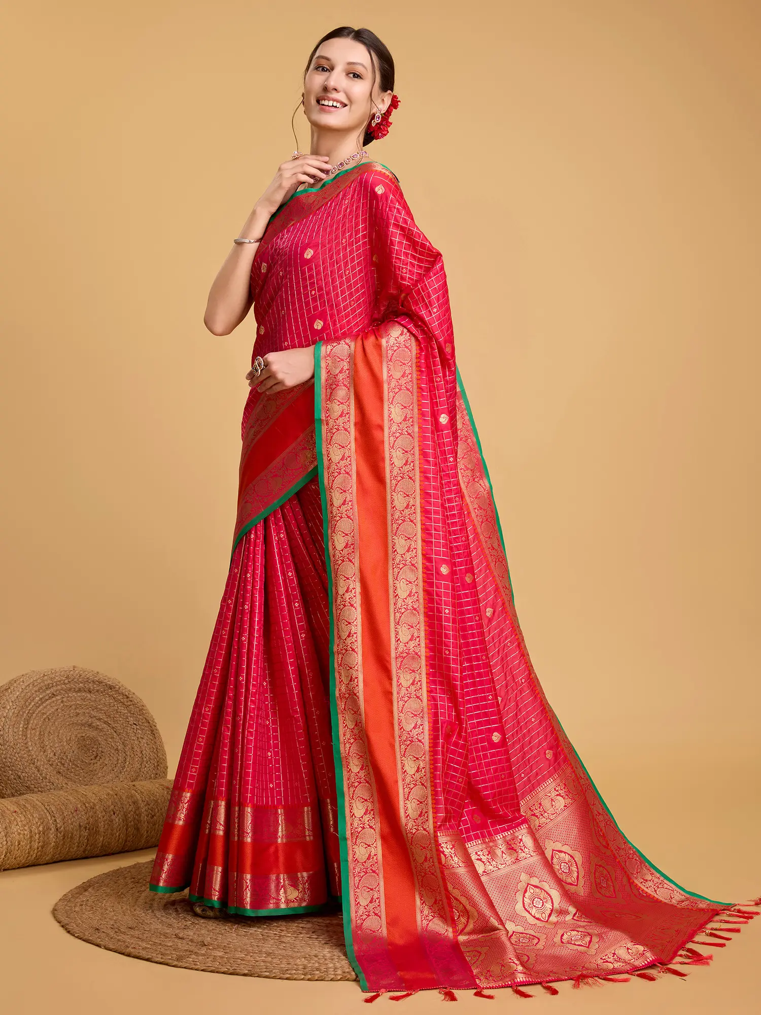 The body of the saree is intricately woven with a subtle yet captivating checkered pattern in a contrasting gold thread, creating a sophisticated texture. This meticulous design adds depth and visual interest, ensuring the saree catches the light beautifully with every movement.