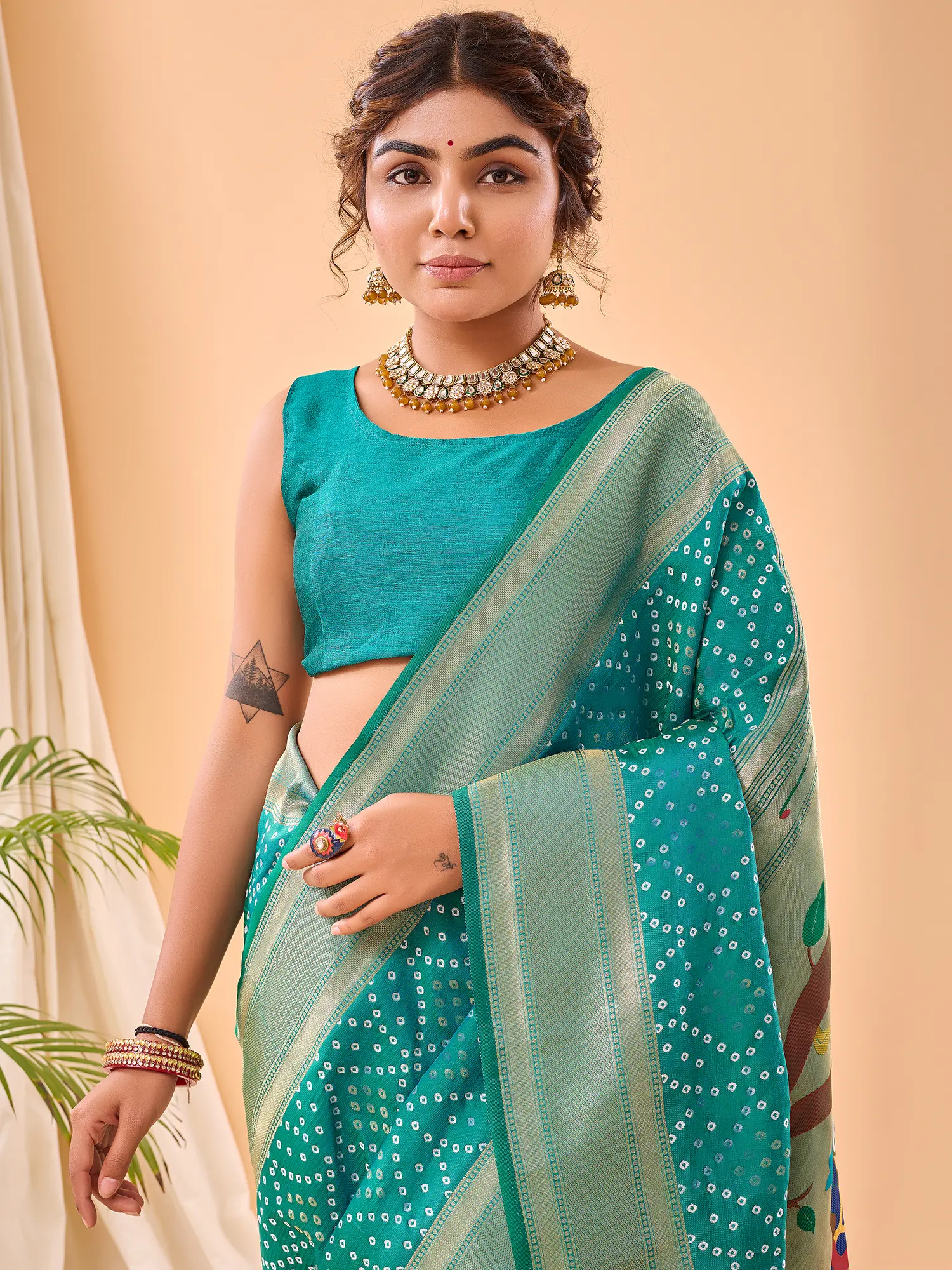 Features a vibrant blue pure silk saree adorned with a bandhani-inspired dot pattern.