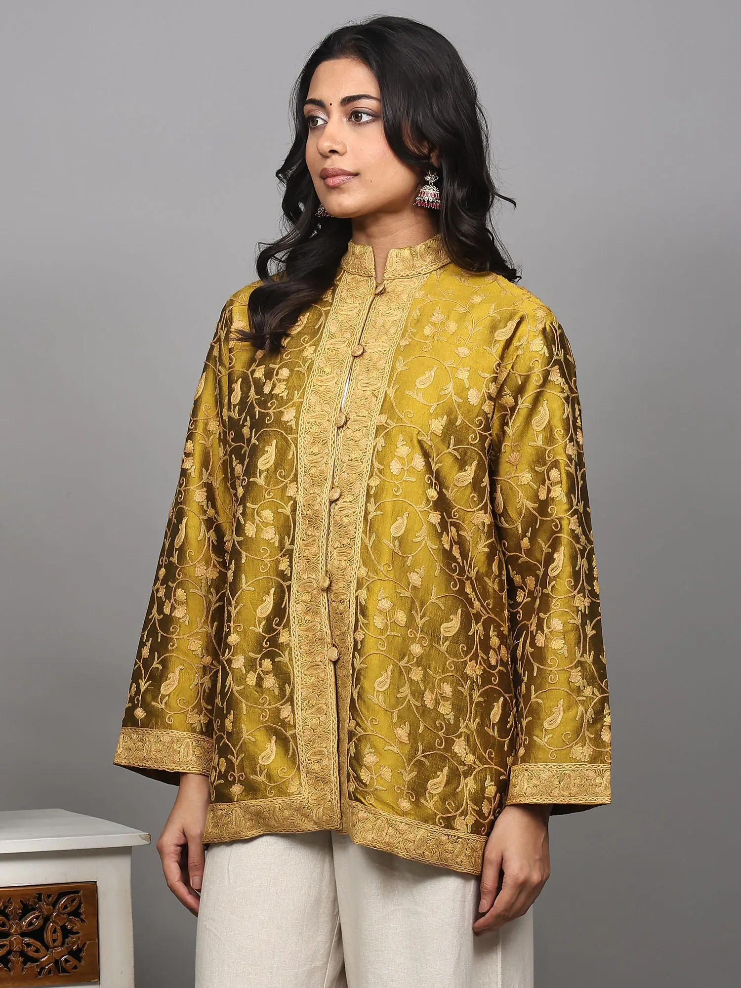 This short jacket is designed for the modern woman who appreciates enduring elegance and artisanal quality. Its versatile silhouette makes it a perfect layering piece, capable of elevating any ensemble. The slightly cropped length and three-quarter sleeves create a flattering profile, while the stand-up collar adds a touch of sophisticated charm. Wear it over a simple kurta and palazzo pants for a refined ethnic look, or pair it with a crisp white shirt and tailored trousers for a chic, fusion aesthetic. It’s ideal for festive occasions, cultural events, or simply when you wish to add a touch of opulence to your everyday style.