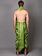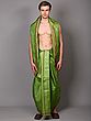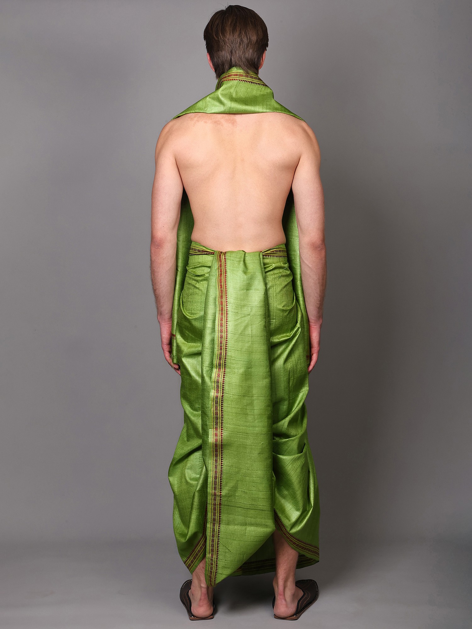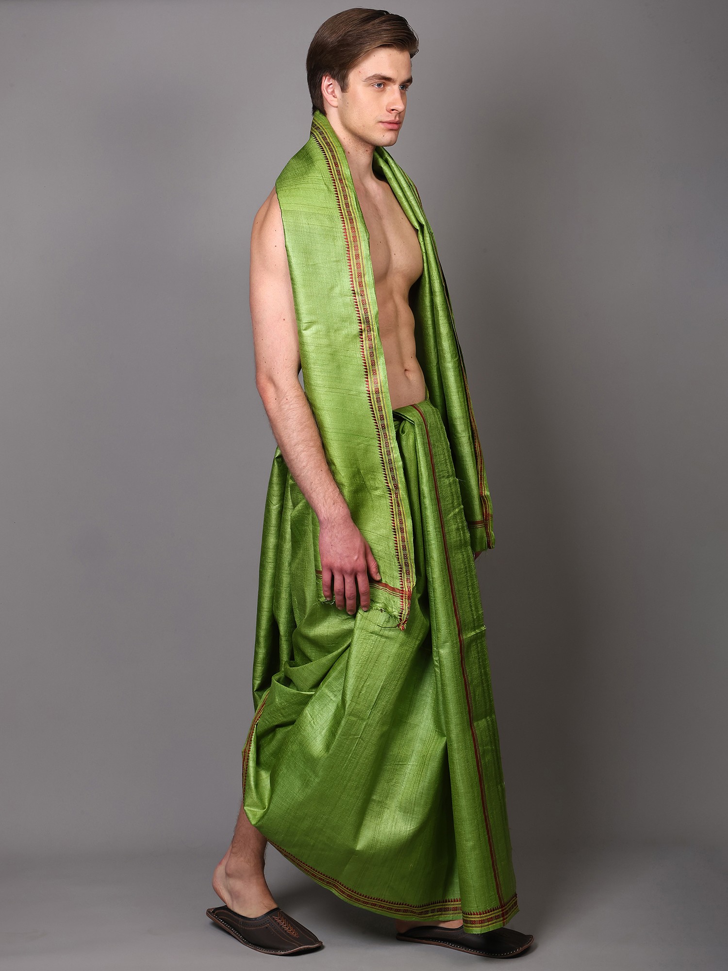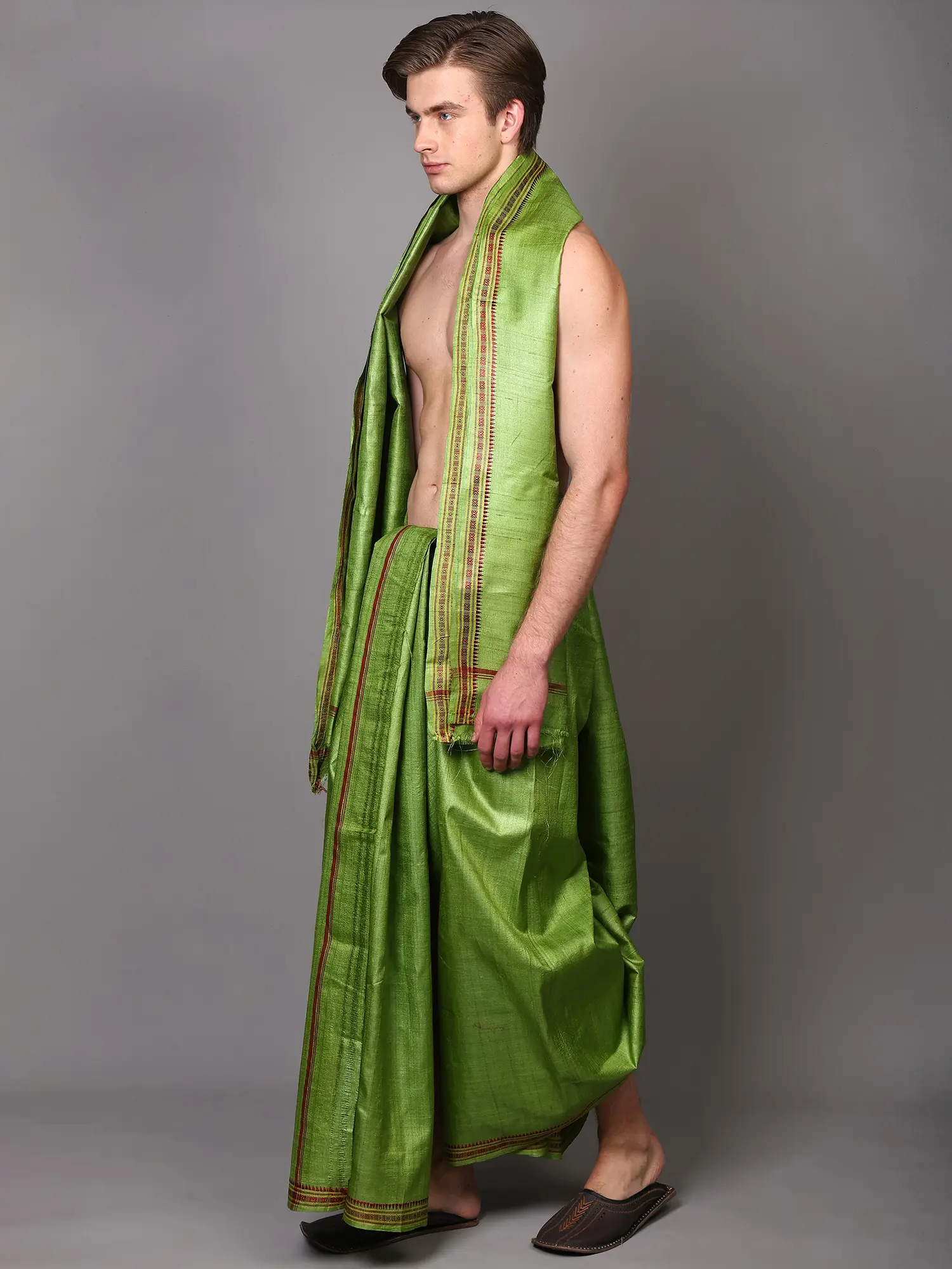 This dhoti and angavastram set is perfect for a myriad of occasions, from religious ceremonies and festivals to weddings and cultural gatherings. The dhoti offers a comfortable and elegant drape, allowing for freedom of movement while exuding an air of sophistication. The accompanying angavastram, draped over the shoulders, adds a layer of grace and completeness to the ensemble. It can be styled in various ways to suit personal preference and the formality of the event. The serene green hue of the silk evokes a sense of calm and purity, making it an ideal choice for moments of reflection and celebration.