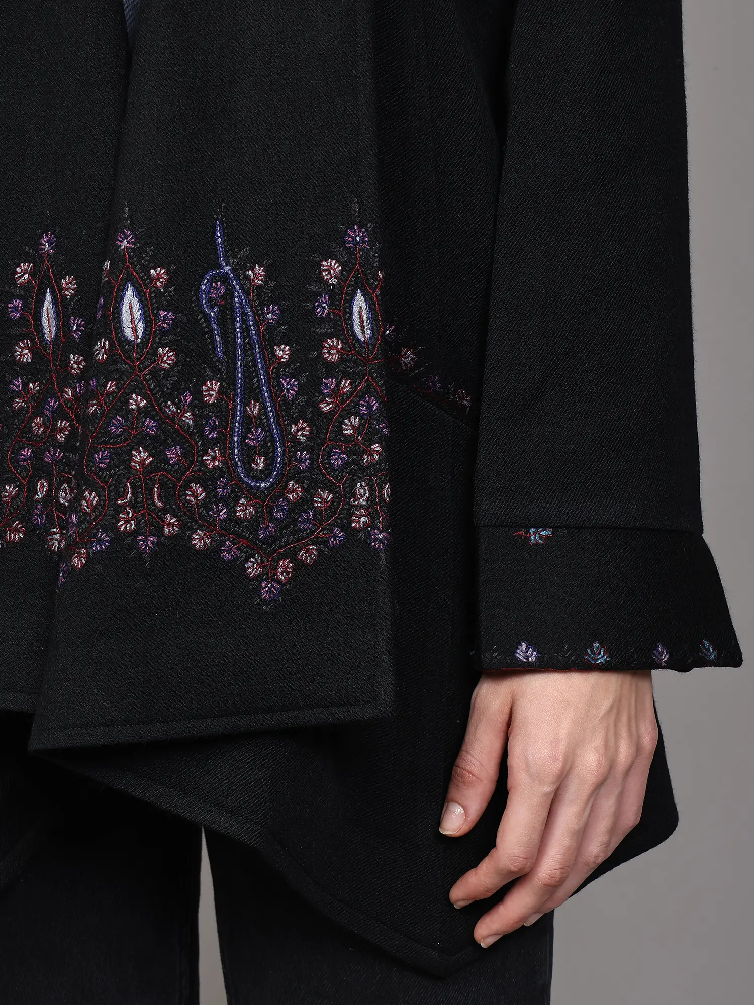 This pure wool cape jacket effortlessly bridges the gap between casual chic and sophisticated formalwear. Drape it over a simple top and jeans for an elevated everyday look, or pair it with a dress or tailored trousers for an evening out. The rich hue of the wool provides a deep, sophisticated base, allowing the intricate embroidery to truly shine. It’s a versatile addition to any wardrobe, offering a unique blend of traditional artistry and contemporary fashion. Embrace the luxurious feel and the captivating beauty of Kashmiri craftsmanship with this exceptional cape jacket.