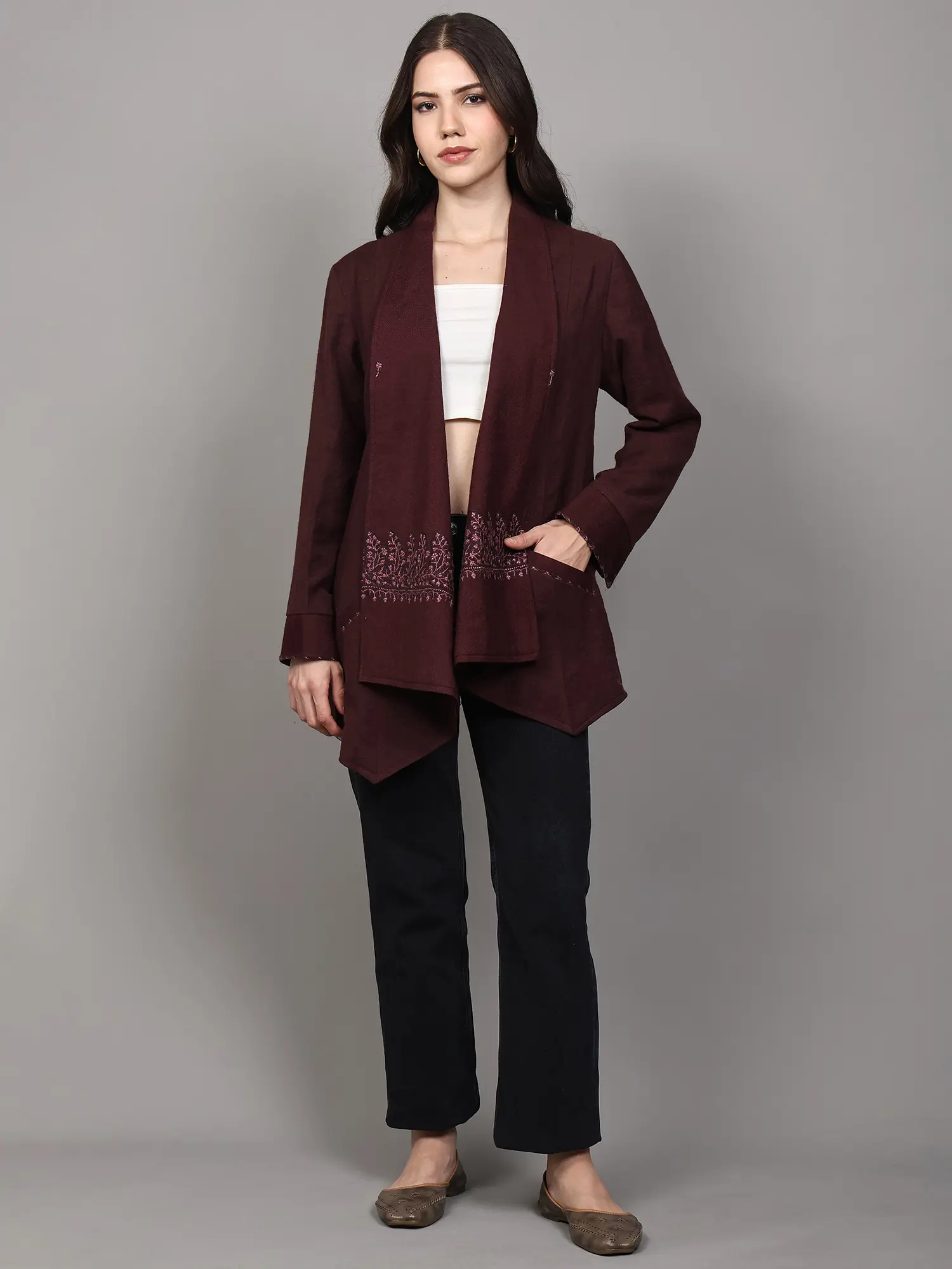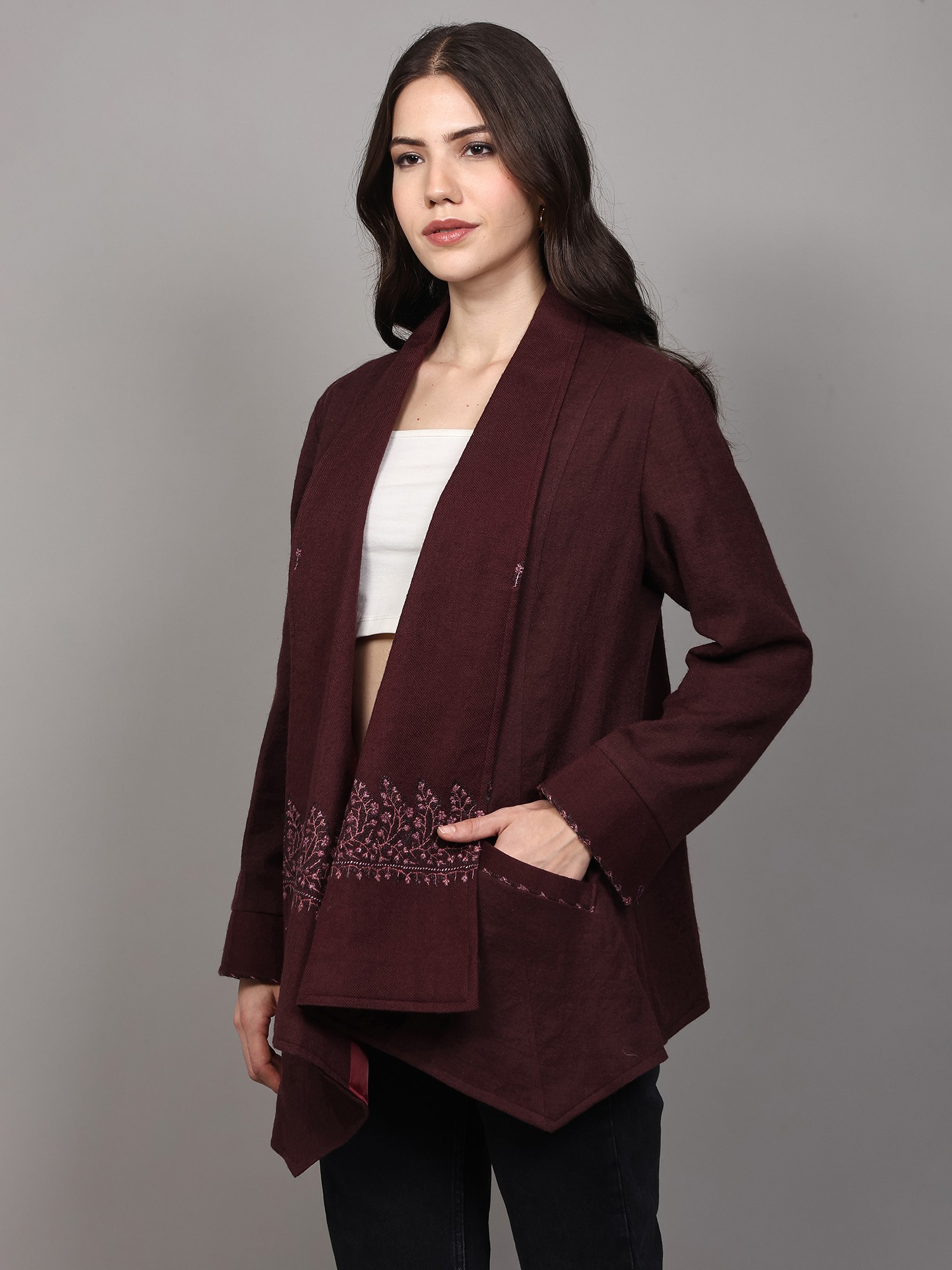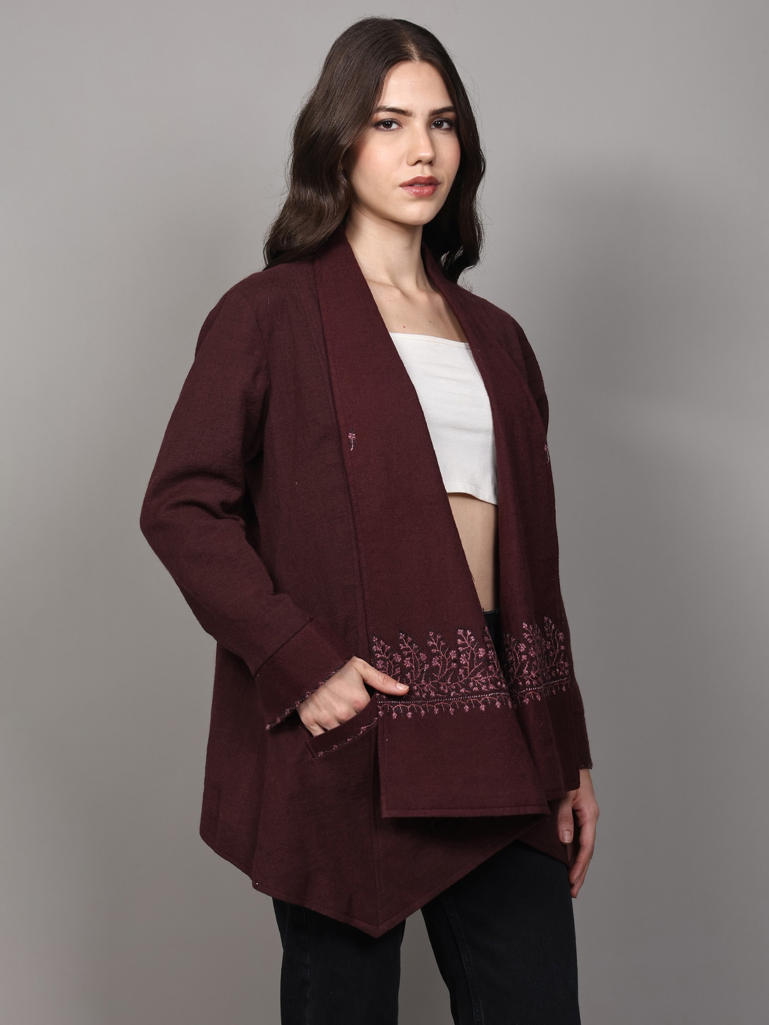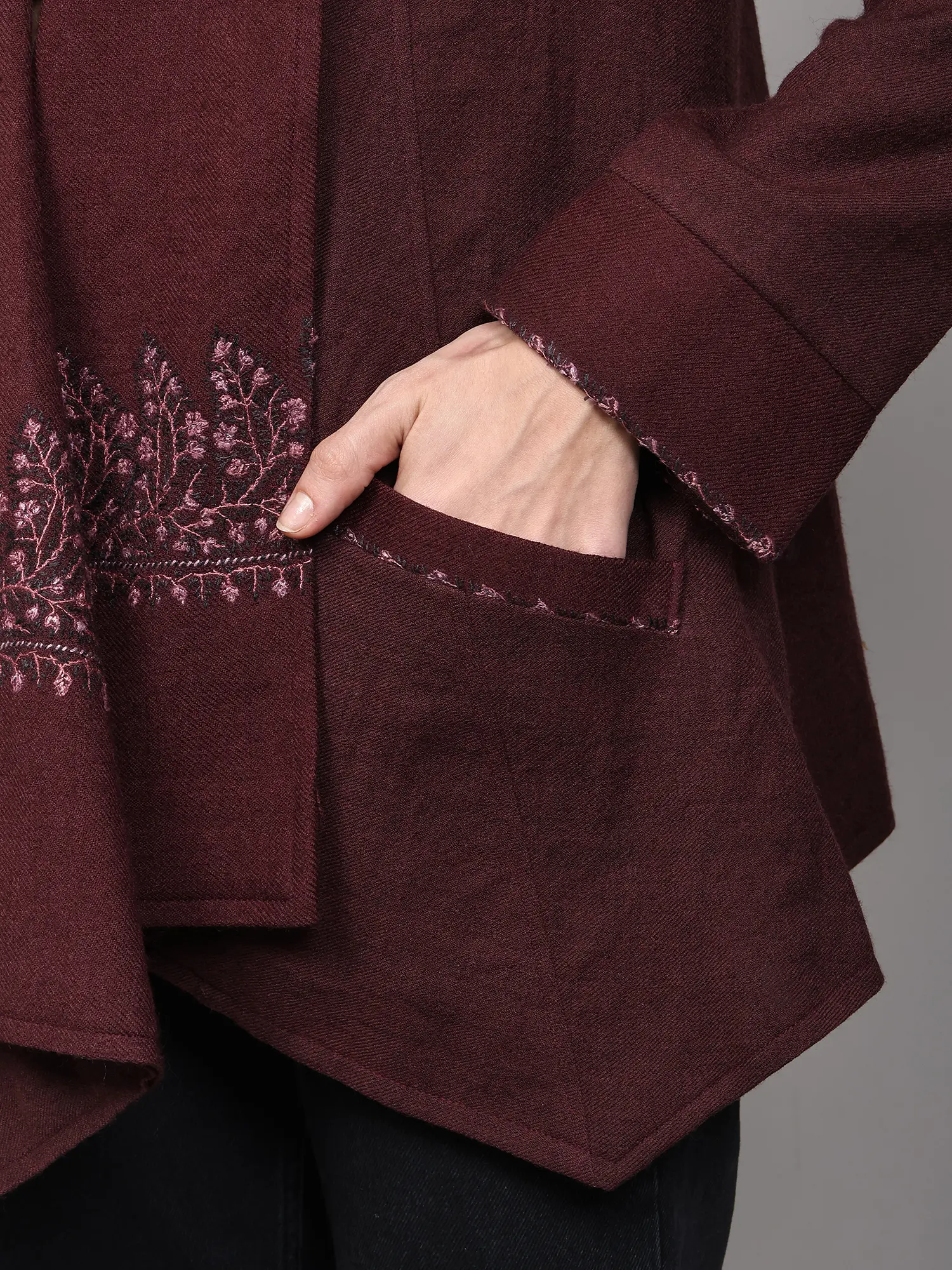 Red-Plum Kashmiri Short Jacket with Chain Stitch Aari Embroidered Floral Sprigs and Side Pockets