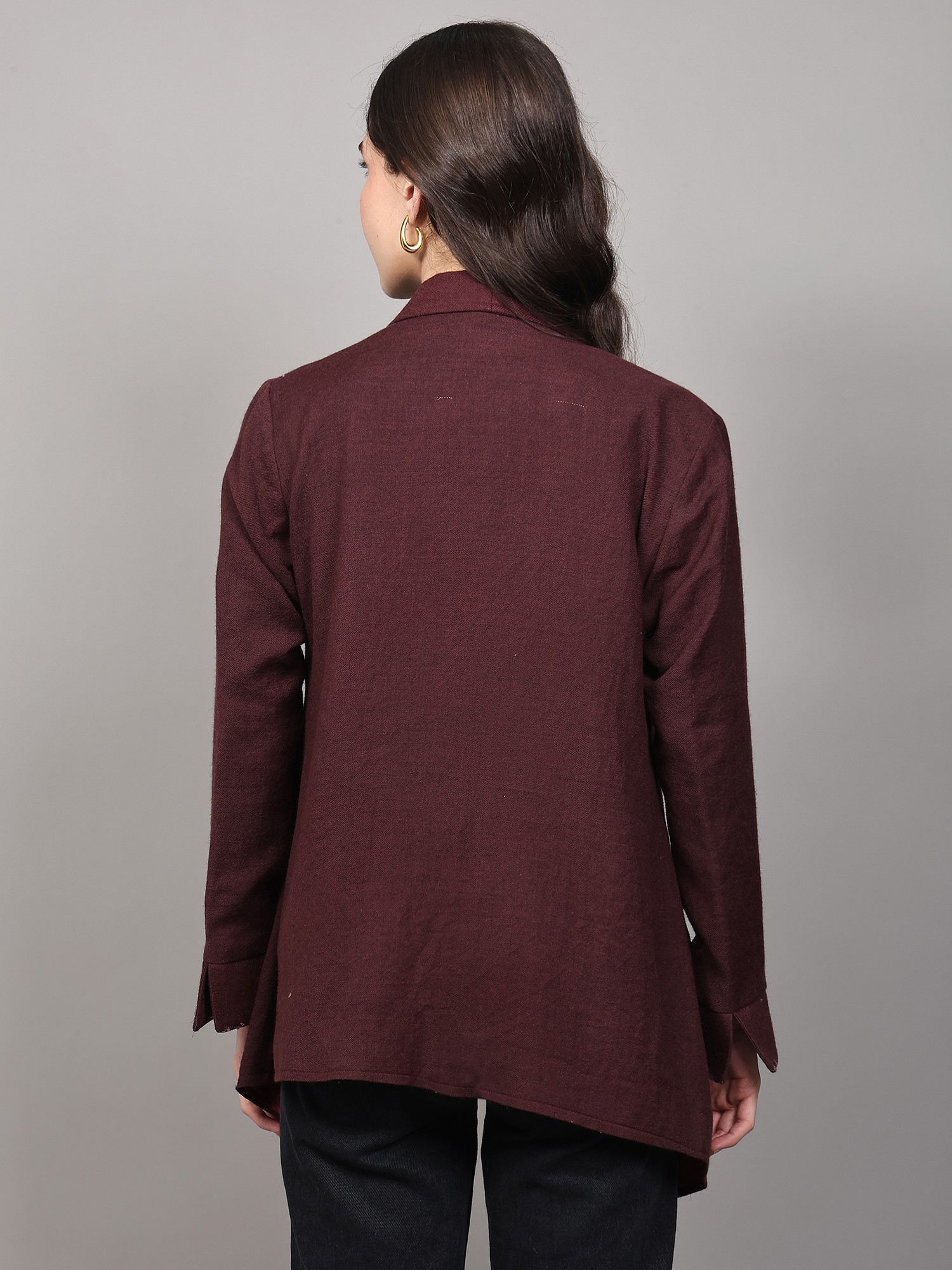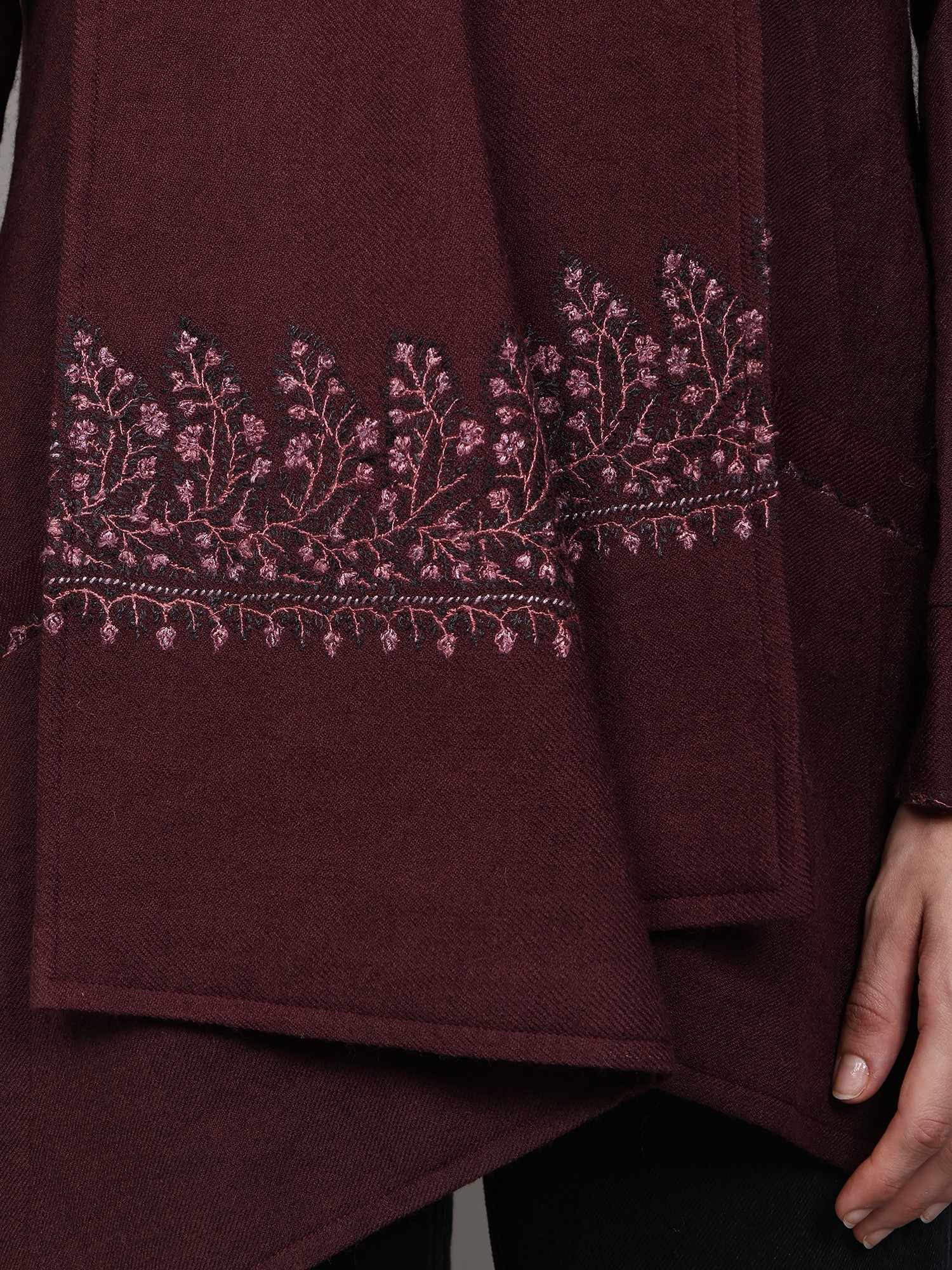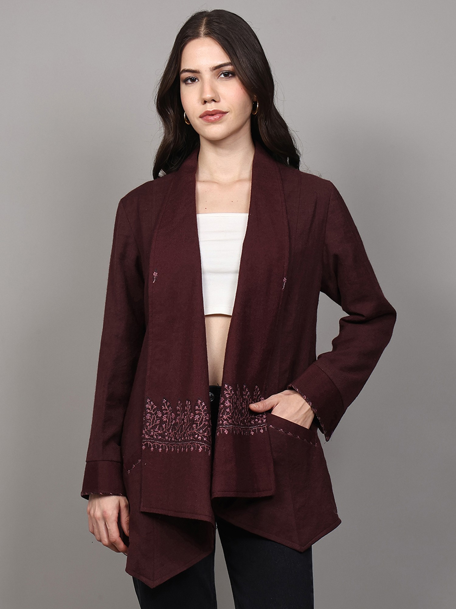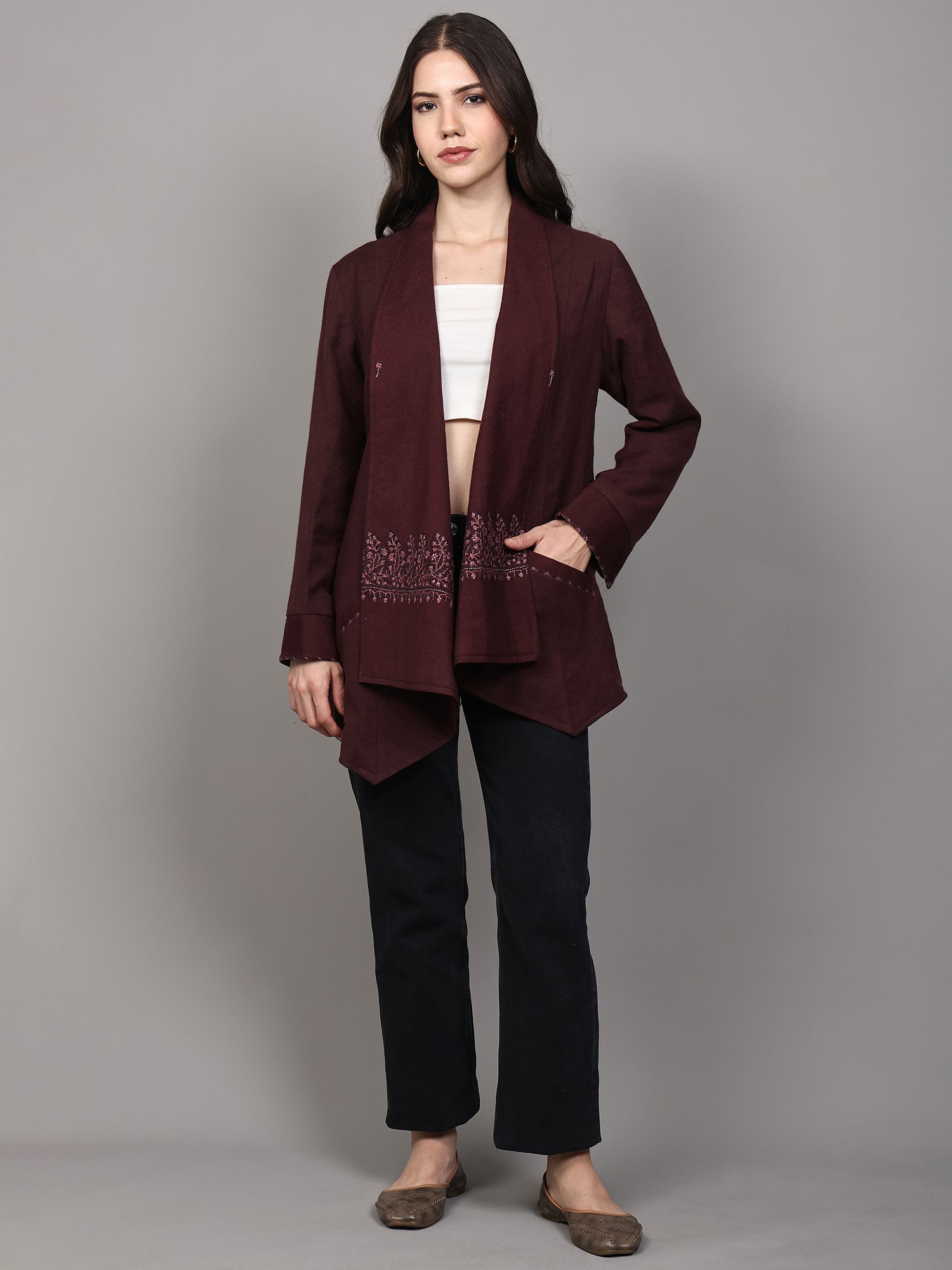 Red-Plum Kashmiri Short Jacket with Chain Stitch Aari Embroidered Floral Sprigs and Side Pockets