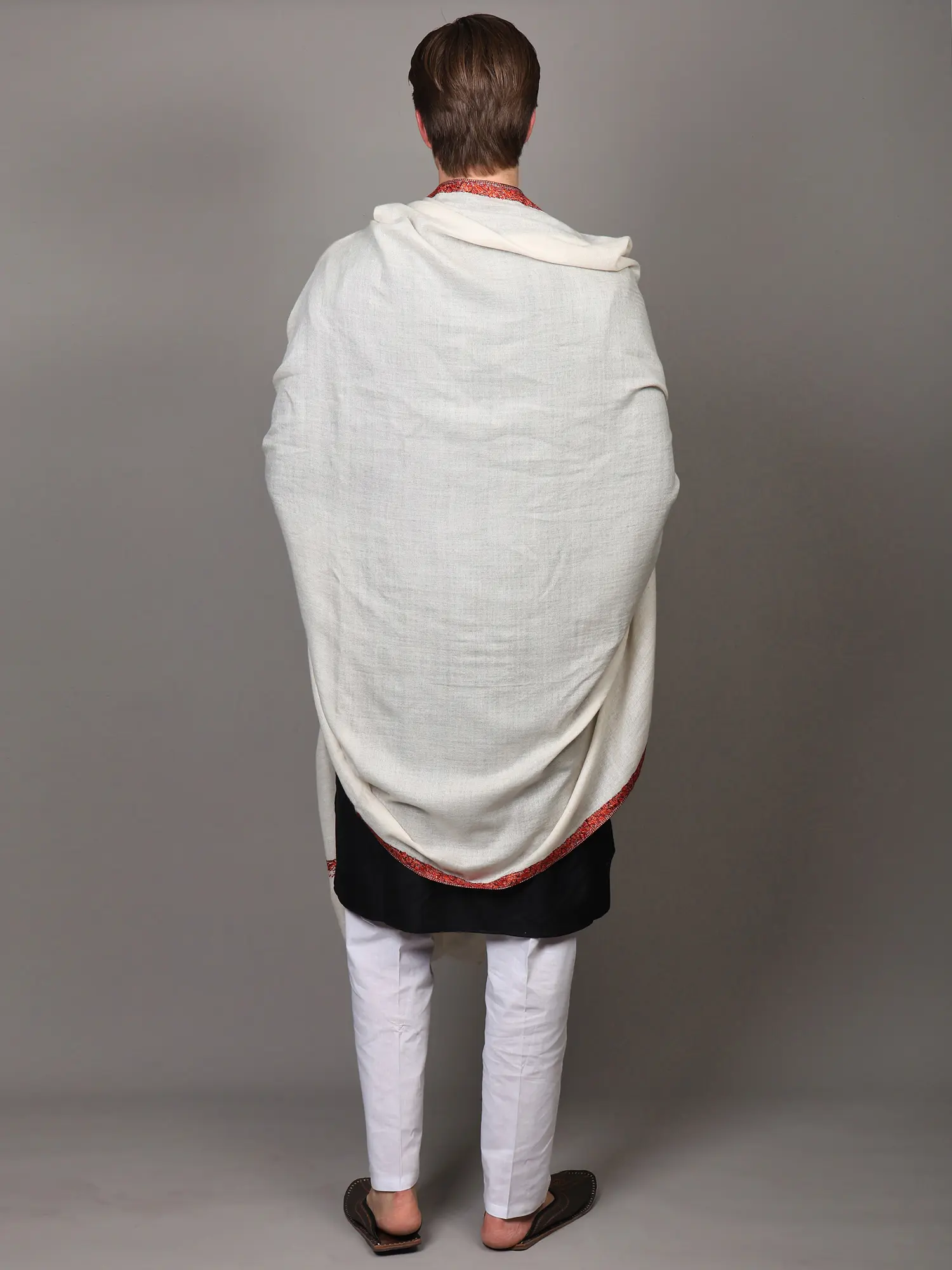Ivory Diamond Weave Pure Pashmina Shawl with All-Over Sozni Hand-Embroidered Foliage Jaal from Kashmir
