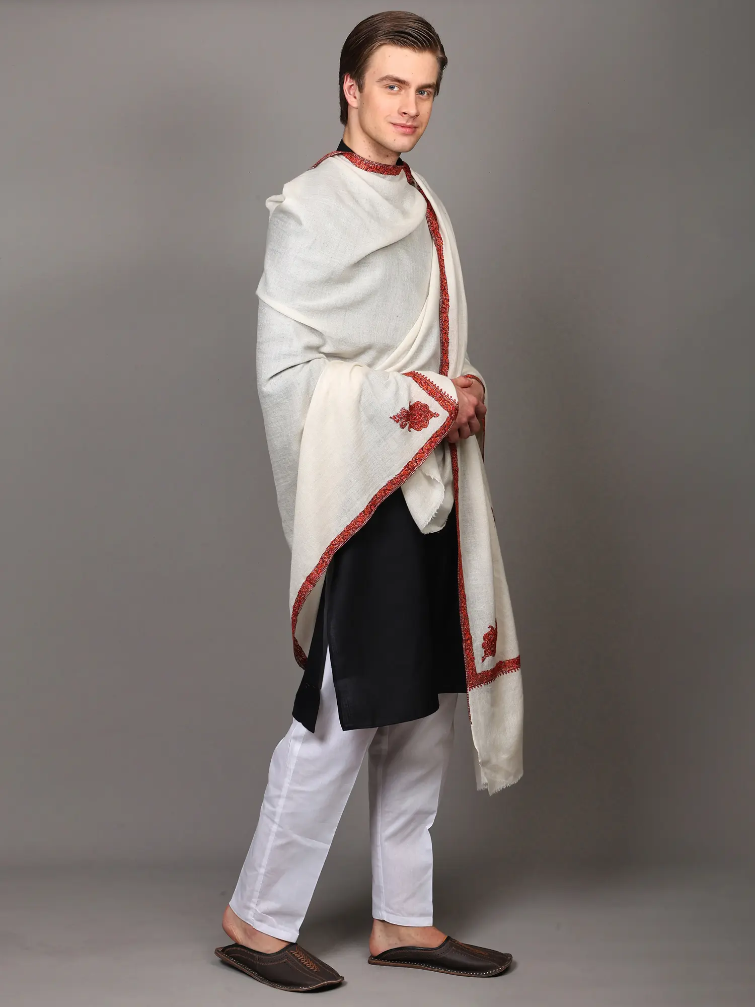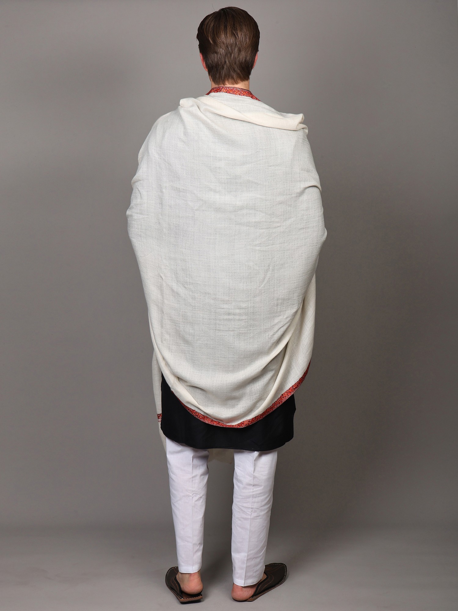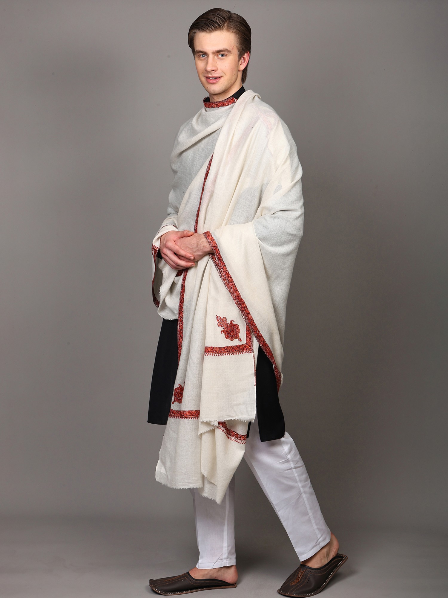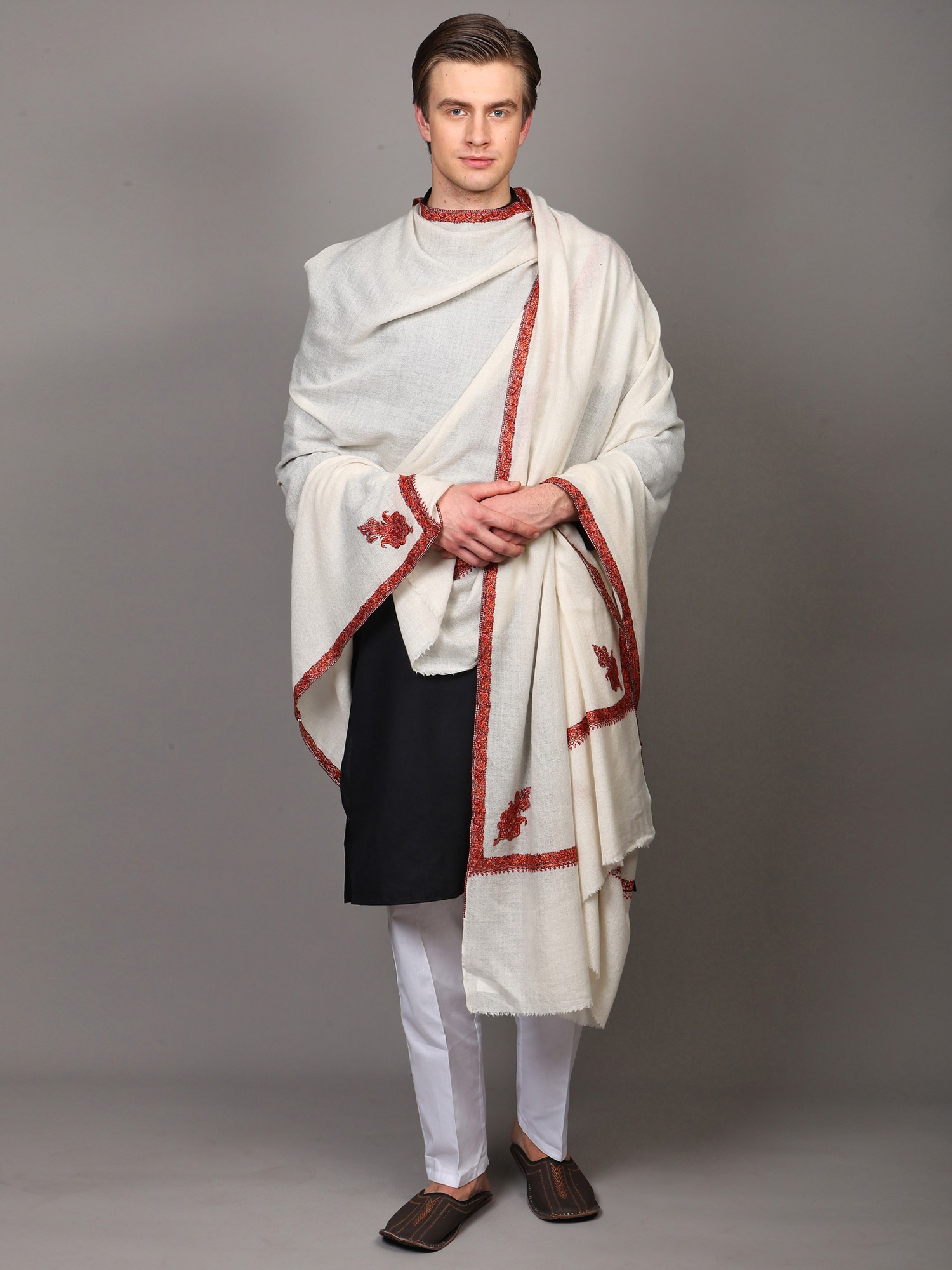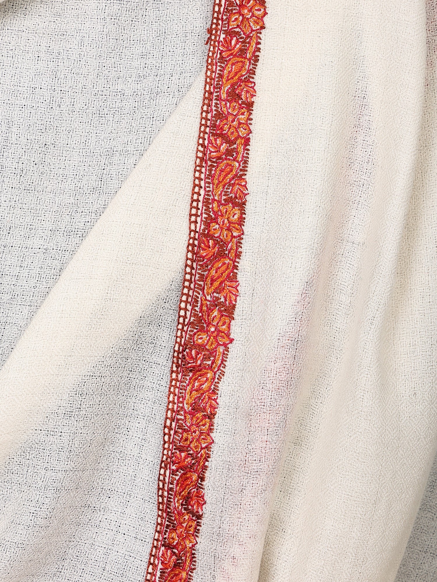 Diamond Weaved Turtle-Dove Extra Wide Shawl with Neem Dar Sozni Embroidery