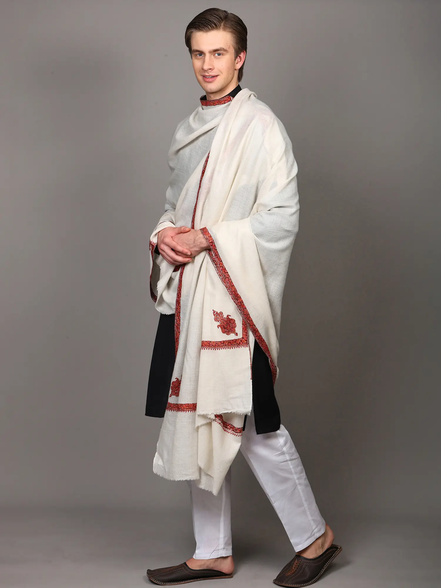 Discover the epitome of sophisticated style with this exquisite pure wool Kashmiri shawl, meticulously crafted for the discerning gentleman. This is more than just an accessory; it's a statement of heritage, artistry, and unparalleled comfort. Woven from the finest pure wool, the shawl offers a luxurious feel against the skin, providing warmth and a subtle drape that speaks of understated elegance.