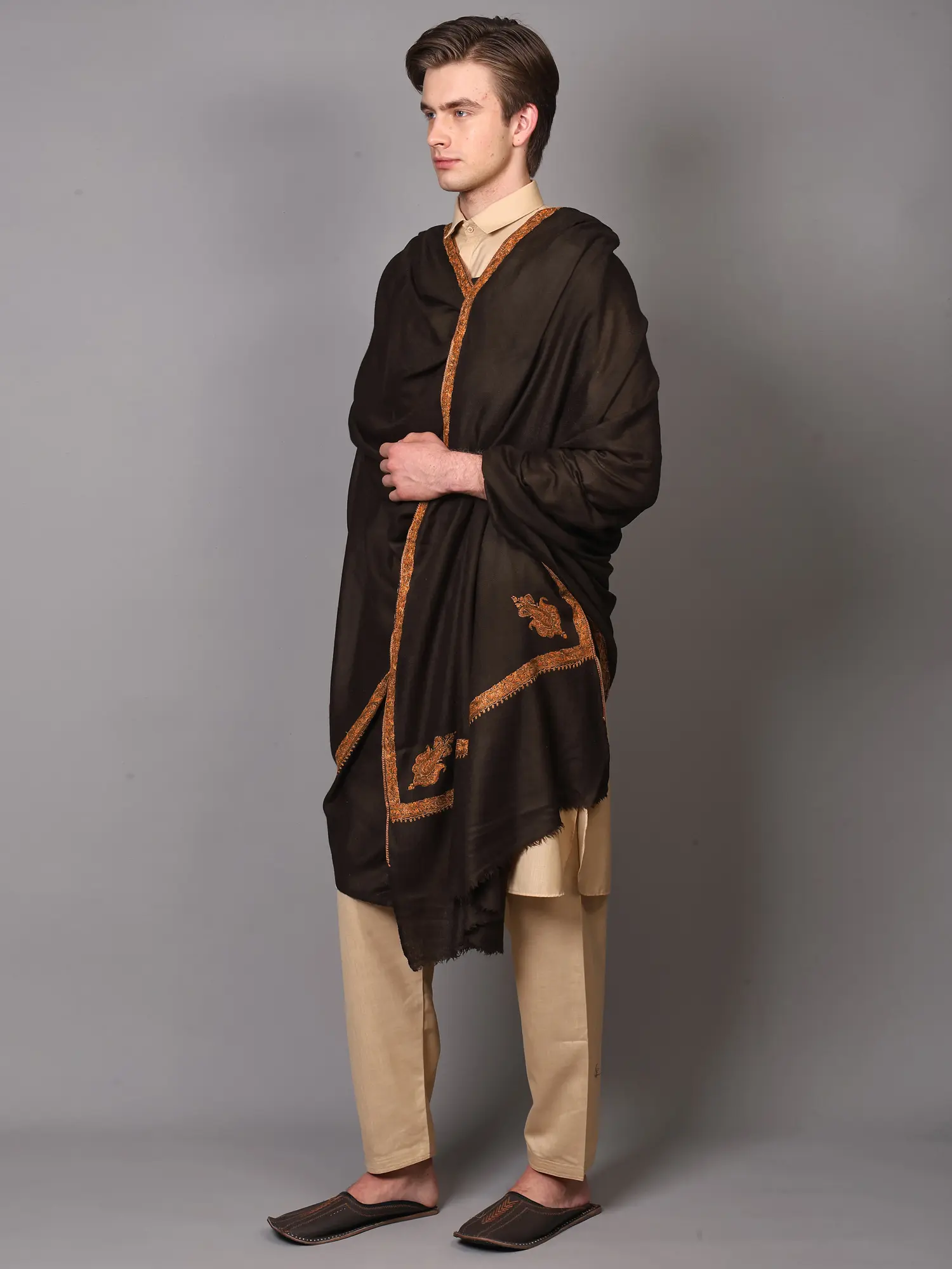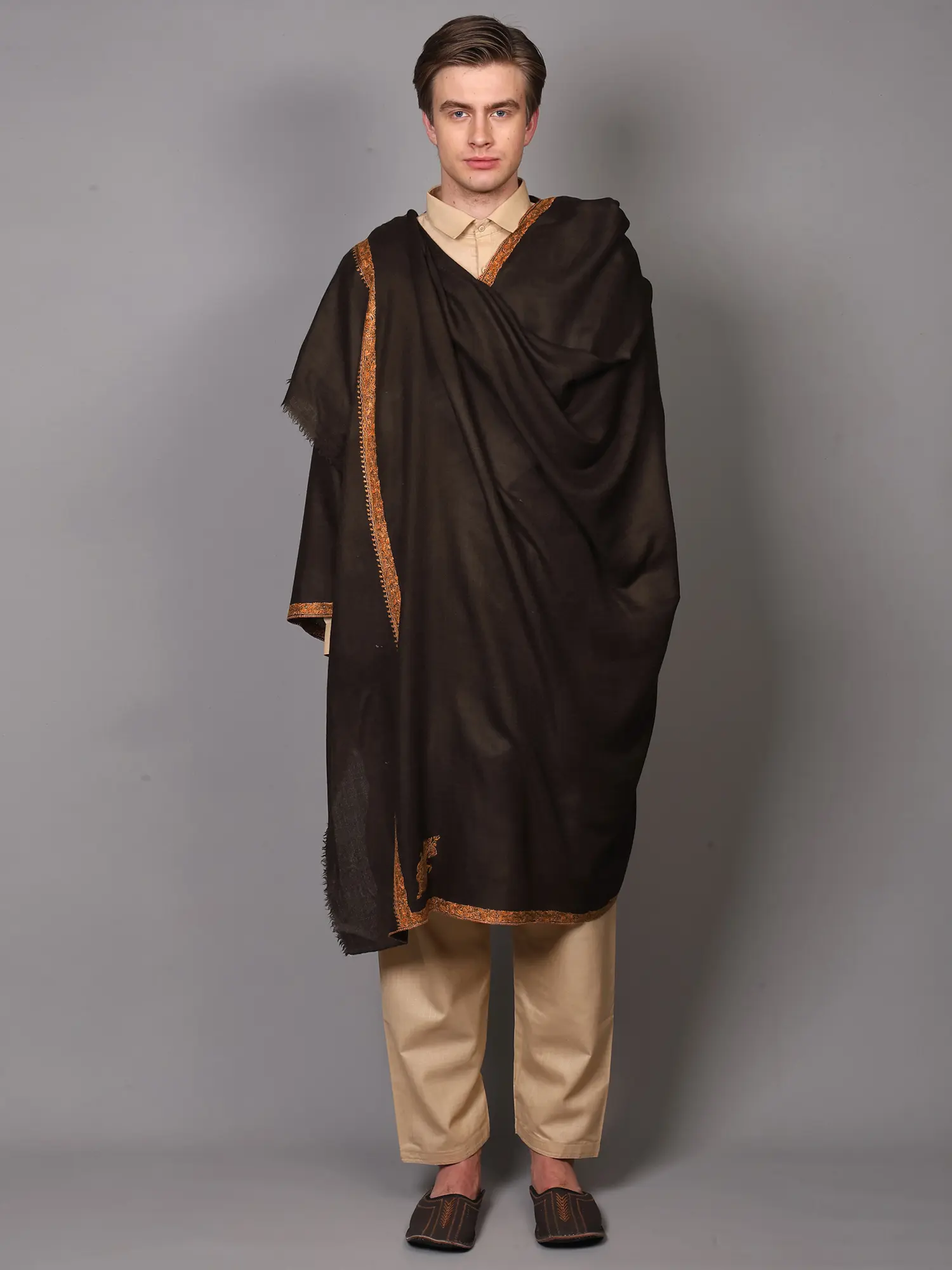 Dove-Gray Sozni Shawl with Diamond Self Weave and Hand-Embroidered Paisley Motif Broad Border