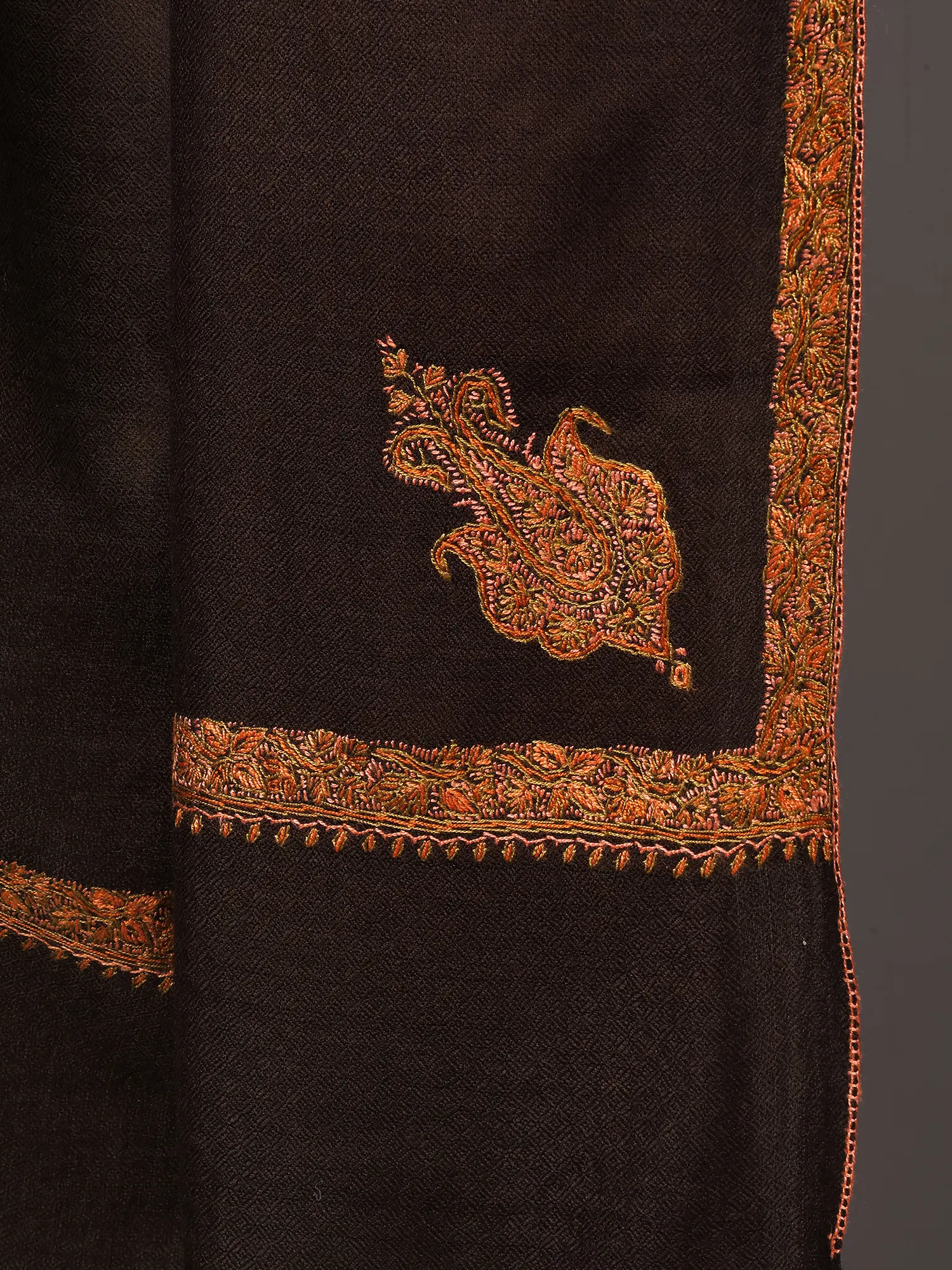 The inherent beauty of this shawl lies in its intricate all-over diamond weave. This subtle yet striking pattern adds a tactile dimension and visual depth, transforming the rich, dark fabric into a canvas of delicate geometric artistry. The weave is not just a design element; it's a testament to the traditional craftsmanship that defines Kashmiri textiles, ensuring that each shawl is unique and carries the soul of its maker.