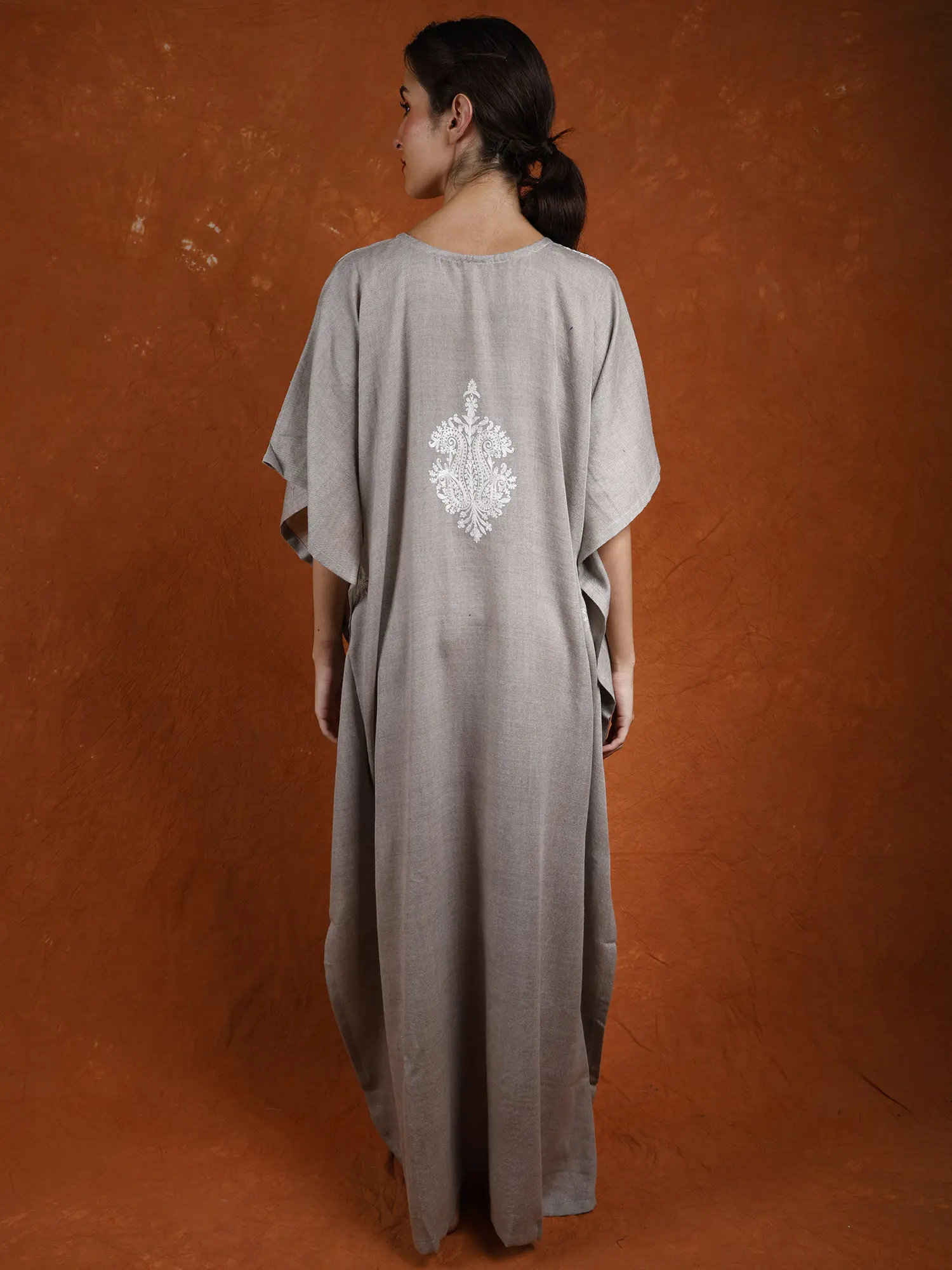 Acquire unparalleled night comfort with this Pure Wool Long Kaftan from Kashmir adorned with Tilla Embroidered Paisleys. Crafted from luxurious pure wool, it envelops you in warmth and softness, providing the ultimate cocoon of comfort for restful nights. The intricate Tilla embroidered paisleys add a touch of elegance and sophistication, elevating the kaftan into stylish sleepwear essential.