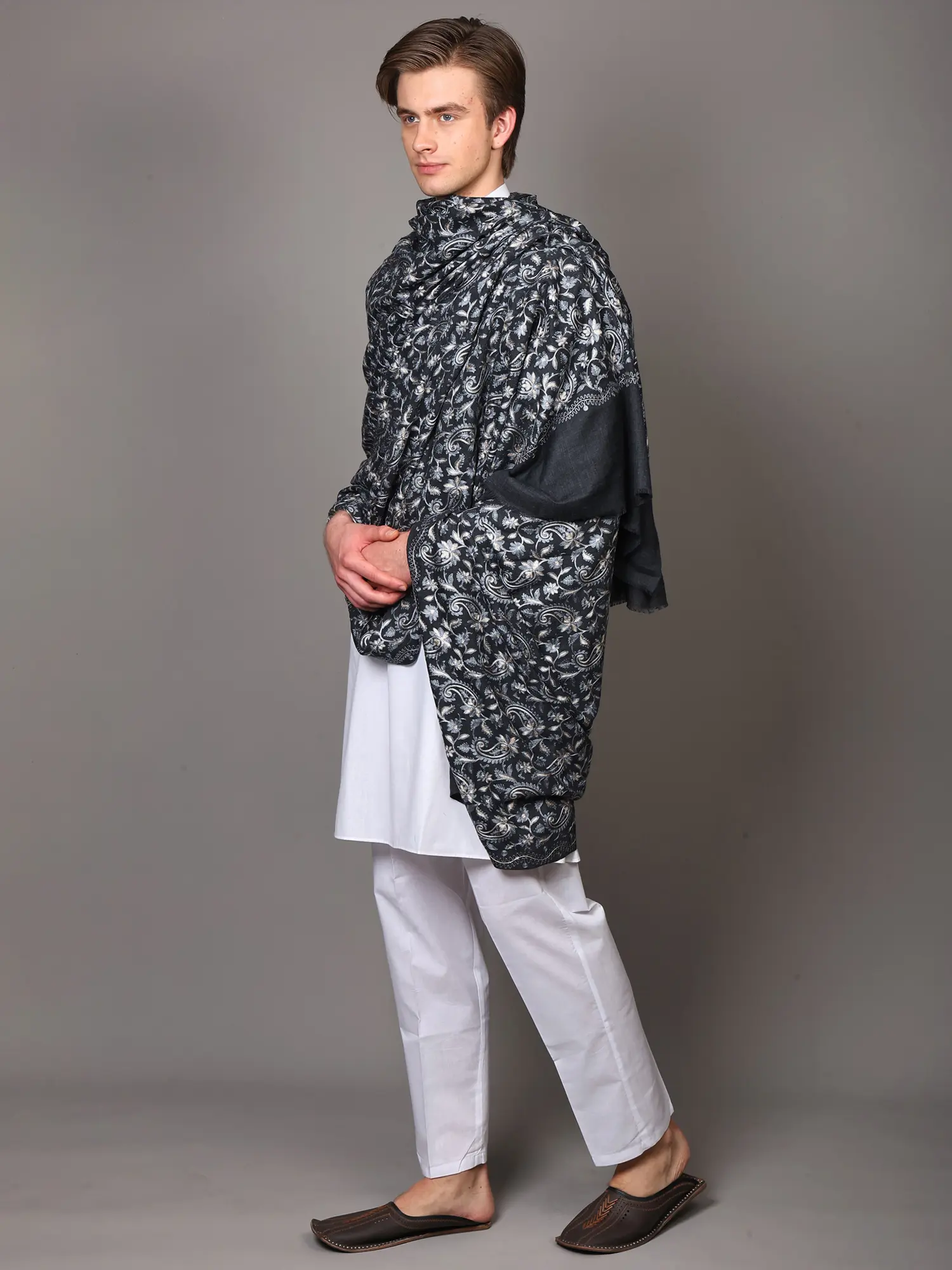 This shawl is more than just an accessory; it's a statement of refined taste. Its generous dimensions ensure it can be worn in various elegant styles, whether draped casually over the shoulders or wrapped more formally. It is an ideal complement to traditional Indian attire like a kurta pajama, or it can be used to elevate a Western outfit, adding a touch of cultural richness and artisanal luxury. Imagine this shawl adding a distinguished finish to your look for weddings, festivals, cultural events, or even a sophisticated evening out.