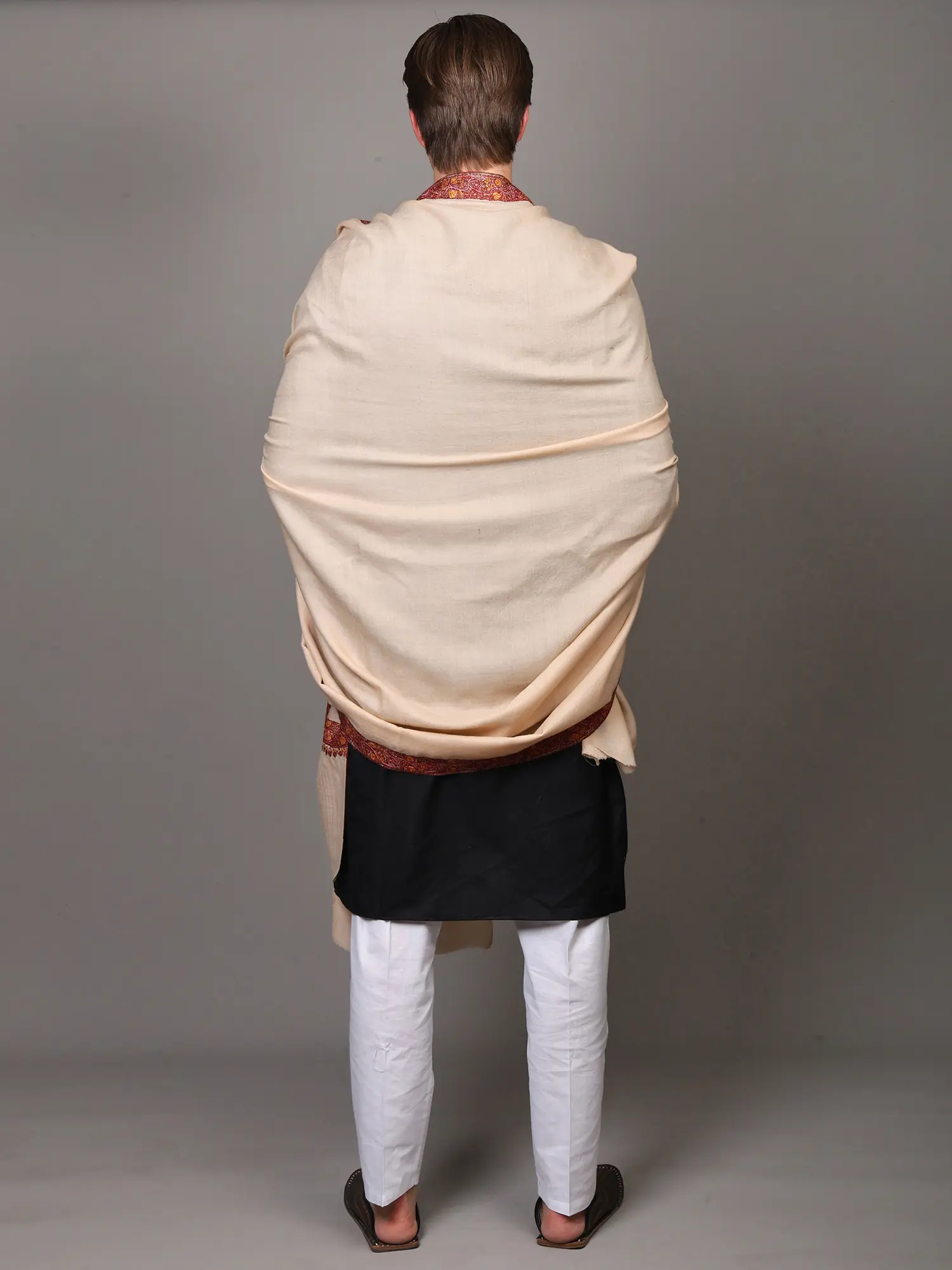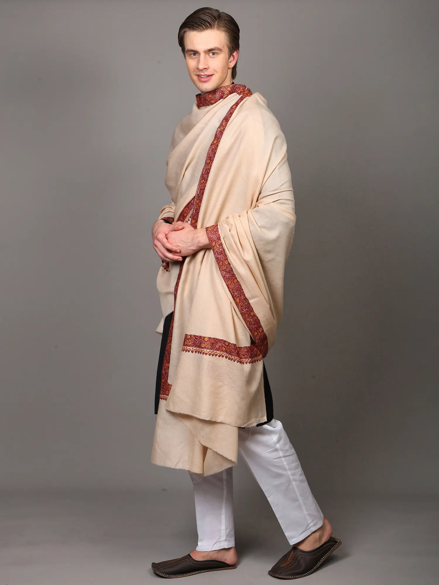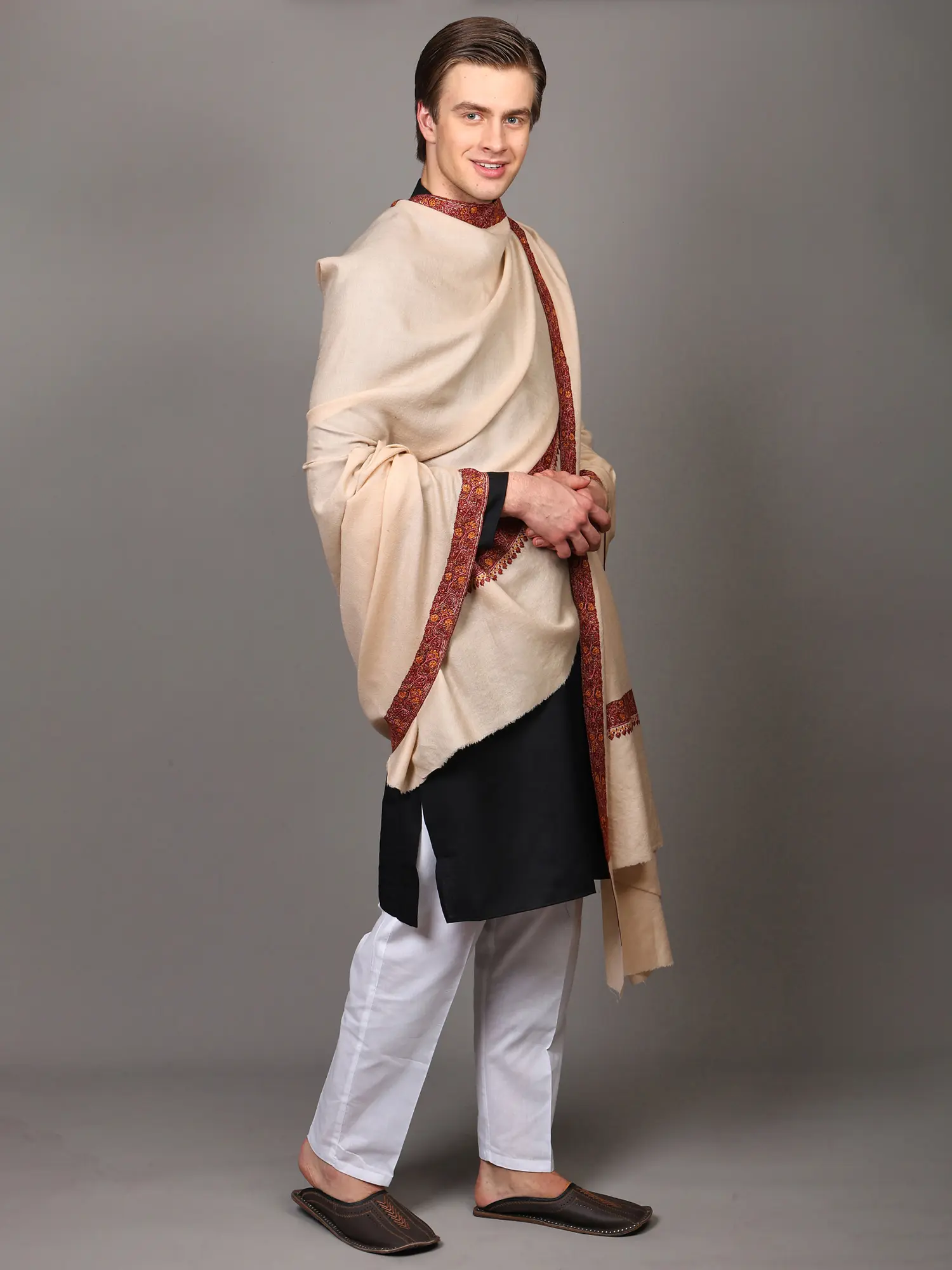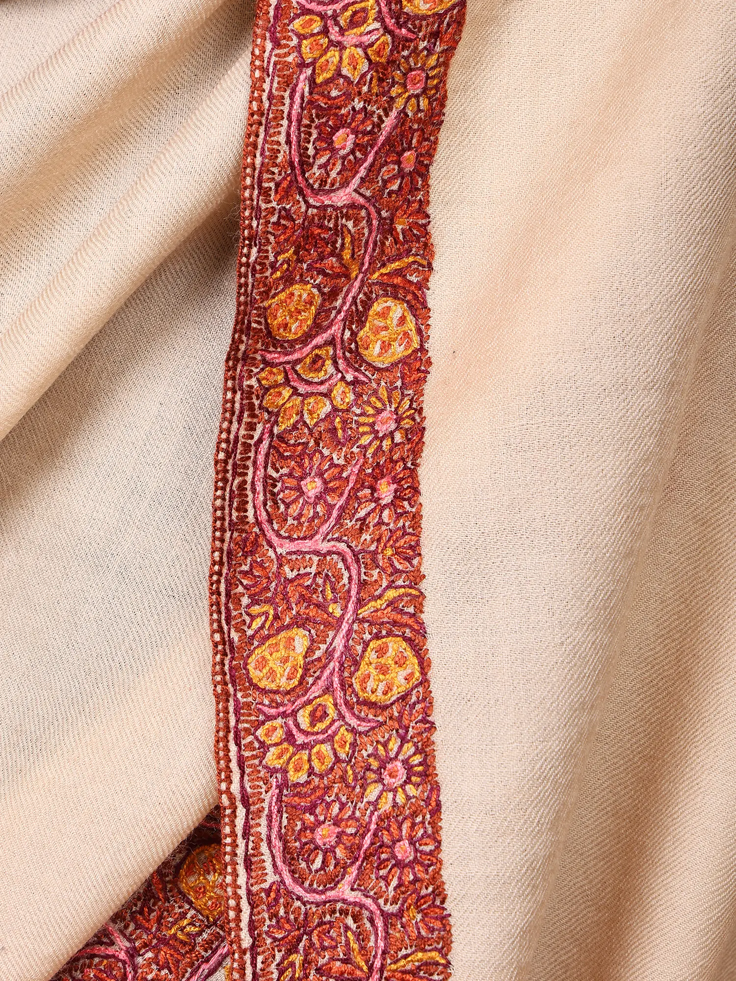 Kashmiri Shawl with Floral Sozni Hand-Embroidered Border and Paisley on Corners