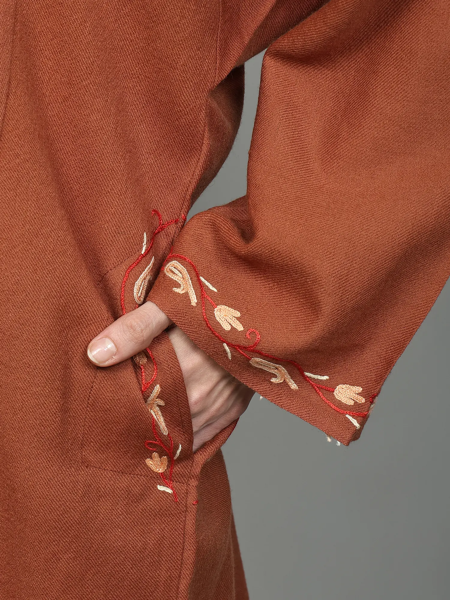 Toasted-Nut Sozni Embroidered Pure Wool Phiran with Side Pockets from Kashmir