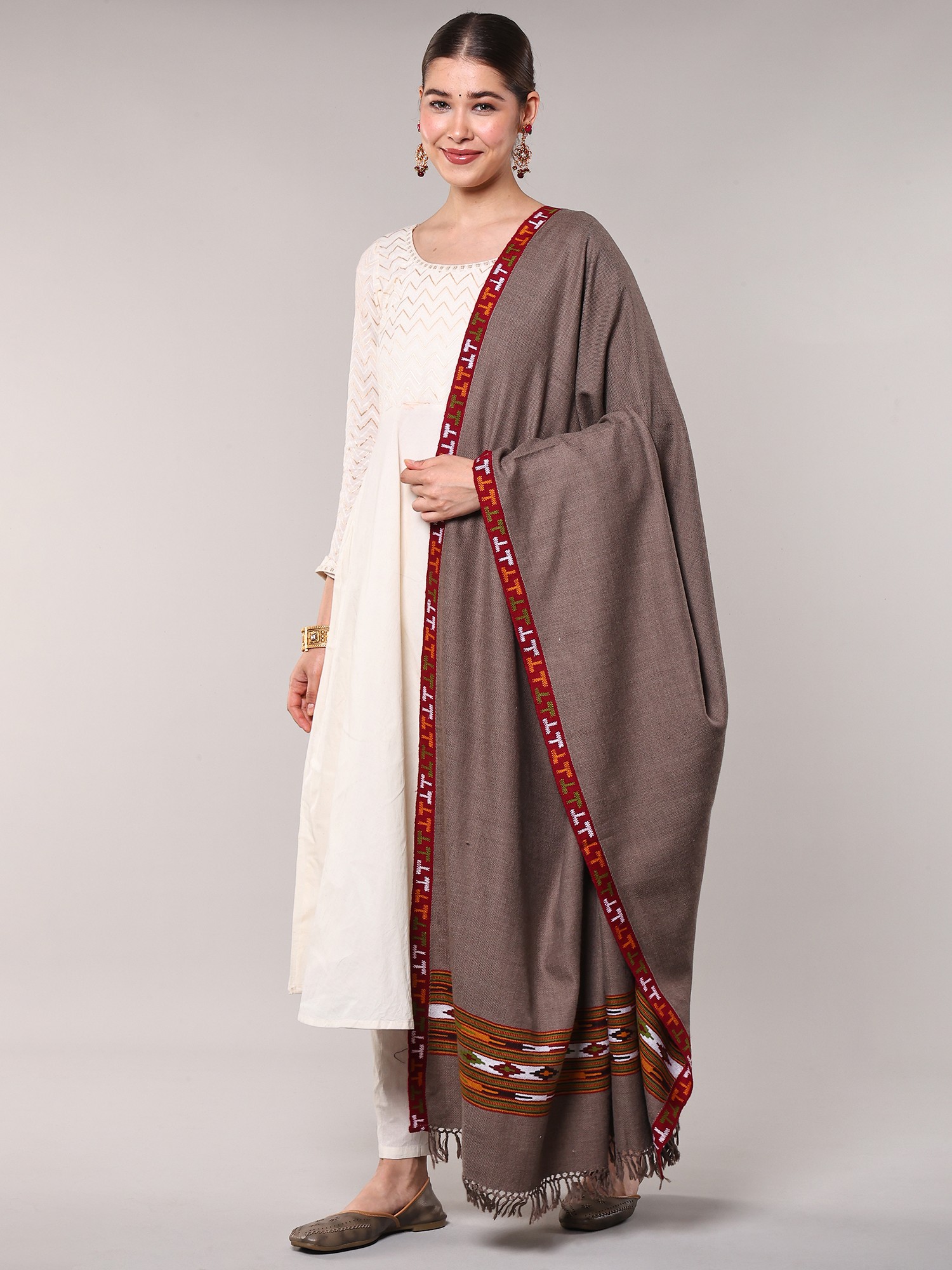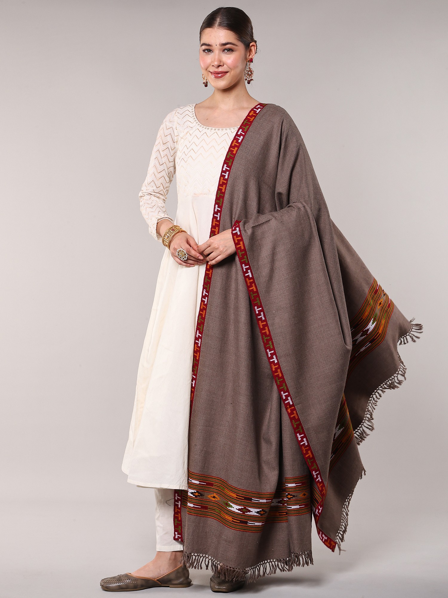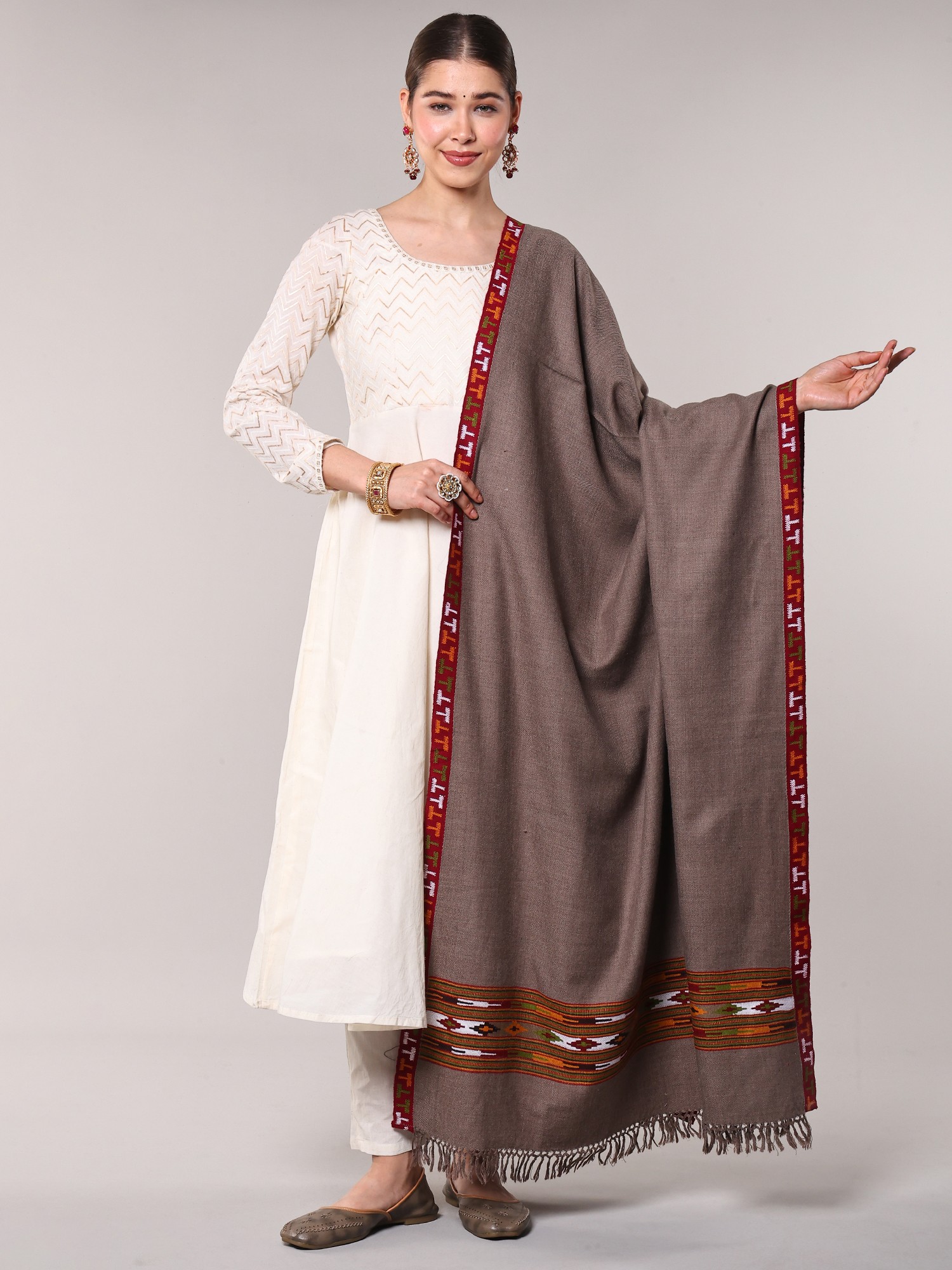 Oyster-Gray Stole from Amritsar with Woven Kullu Palla