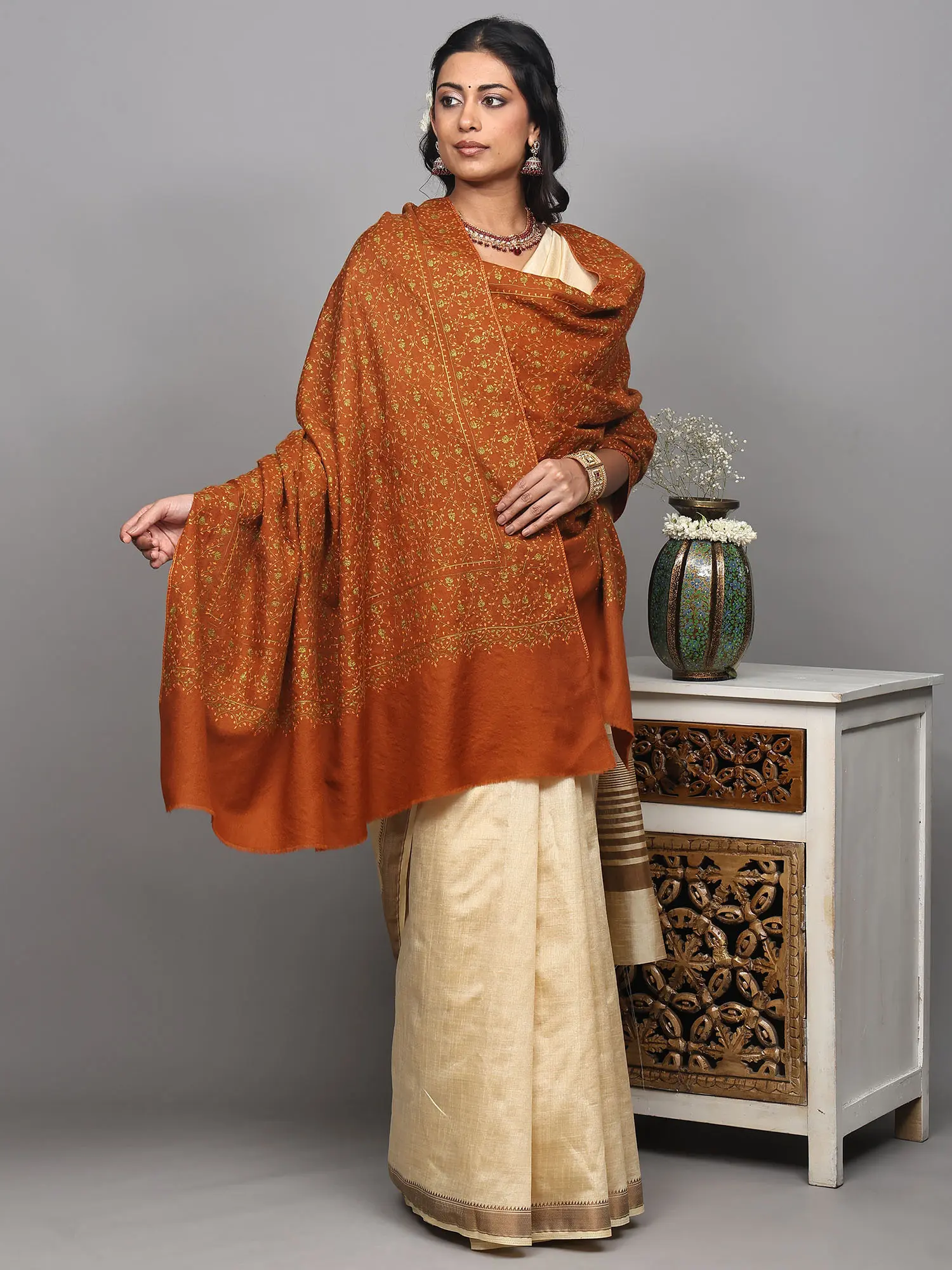 Roebuck Pure Pashmina Shawl from Kashmir with Sozni-Embroidery by Hand