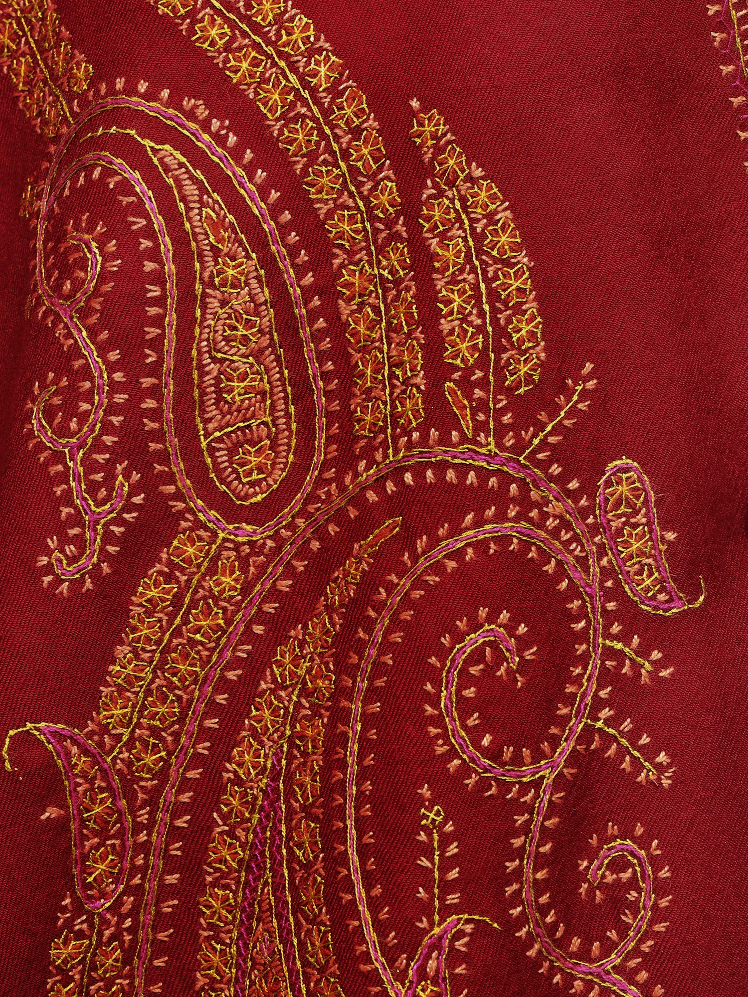 Experience the epitome of artisanal craftsmanship with this exquisite pure wool shawl, meticulously crafted in the picturesque valleys of Kashmir. This is more than just an accessory; it's a wearable piece of art, designed to elevate any ensemble with its rich history and unparalleled beauty. The deep, luxurious maroon hue serves as a perfect canvas for the intricate Sozni hand-embroidery, a traditional Kashmiri needlework technique renowned for its delicate precision and vibrant artistry.