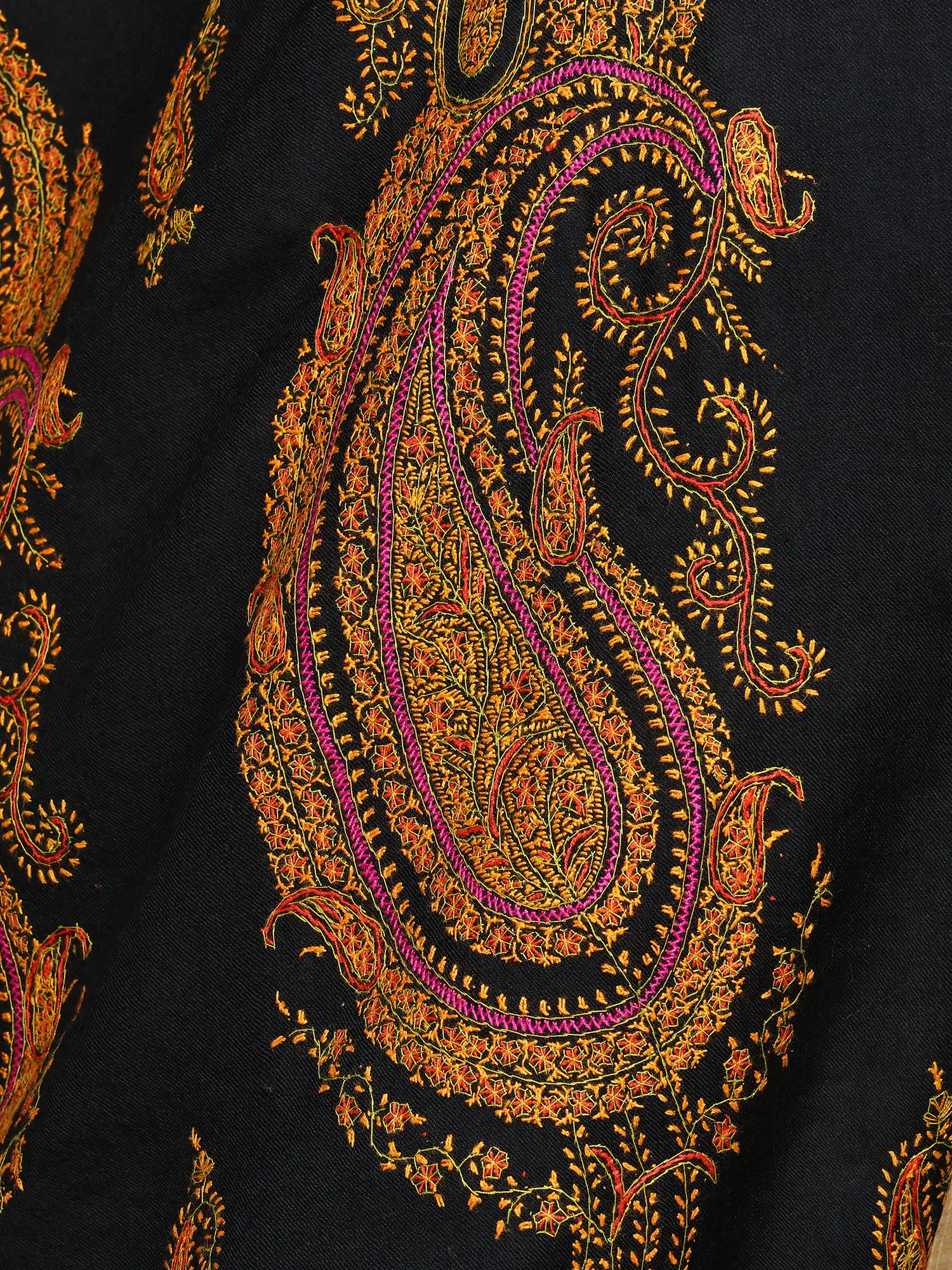 The shawl is adorned with a breathtaking pattern of "giant paisleys," a motif deeply rooted in the cultural heritage of the region. Each paisley, rendered in luminous gold and complementary shades, is a testament to the skill and dedication of the artisans. The embroidery is so fine and detailed that it appears almost painted onto the soft wool. The swirling curves and delicate inner patterns of the paisleys create a mesmerizing visual flow, drawing the eye and captivating the admirer. This grand design is strategically placed, lending a regal and opulent feel to the entire piece, making it a truly statement-making accessory.