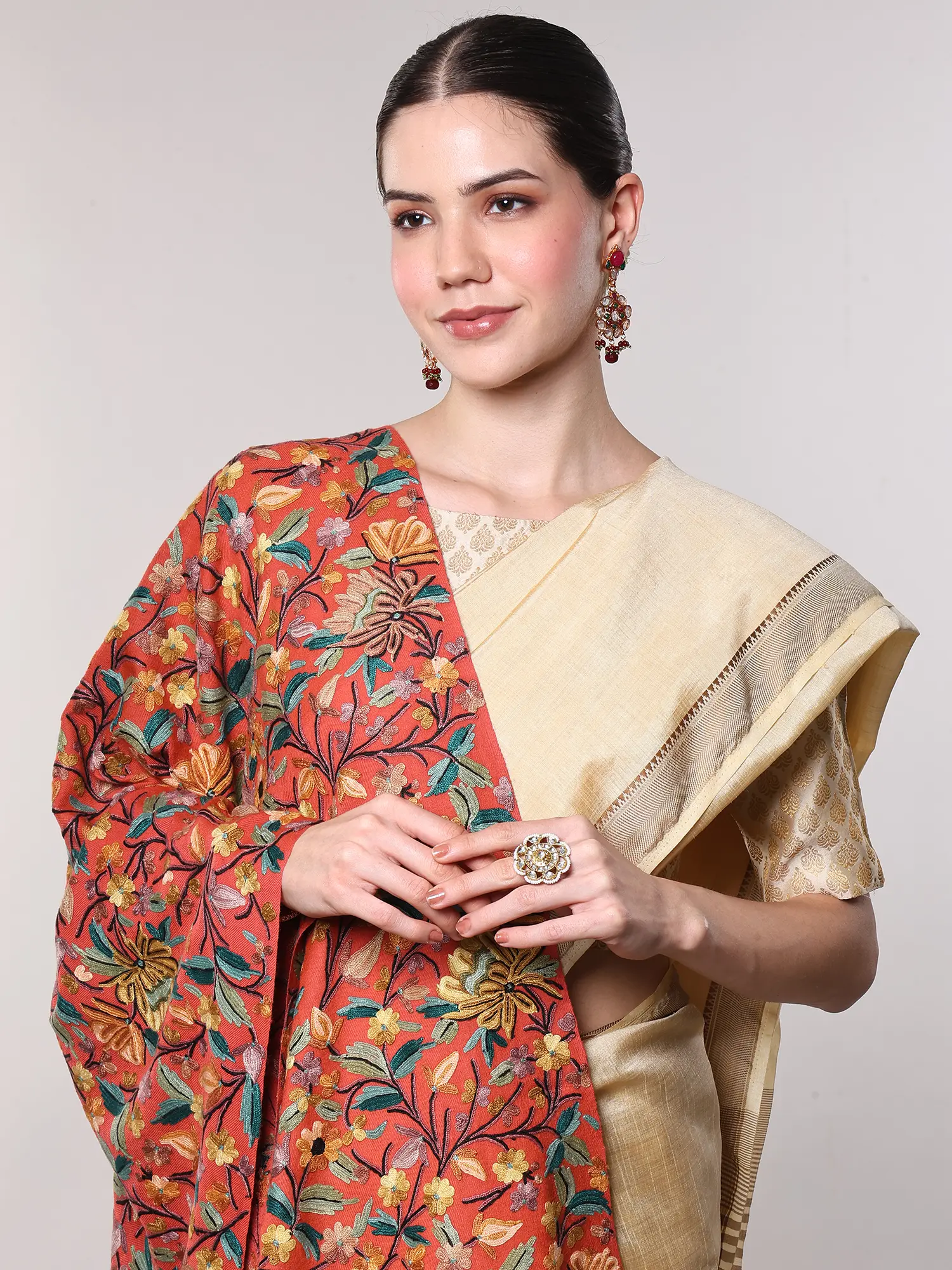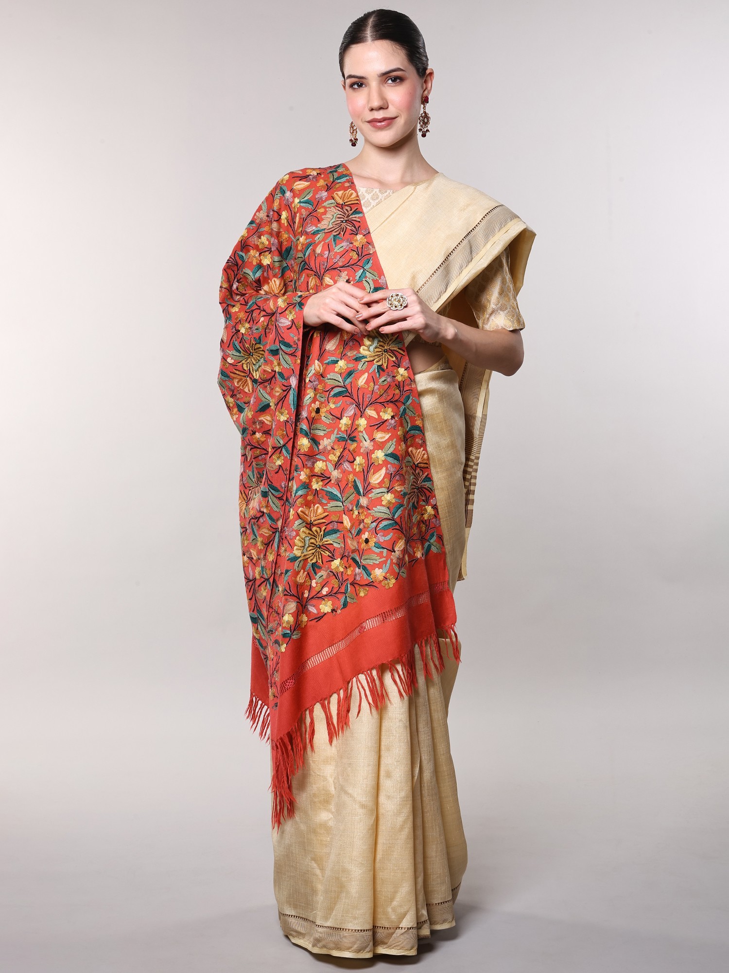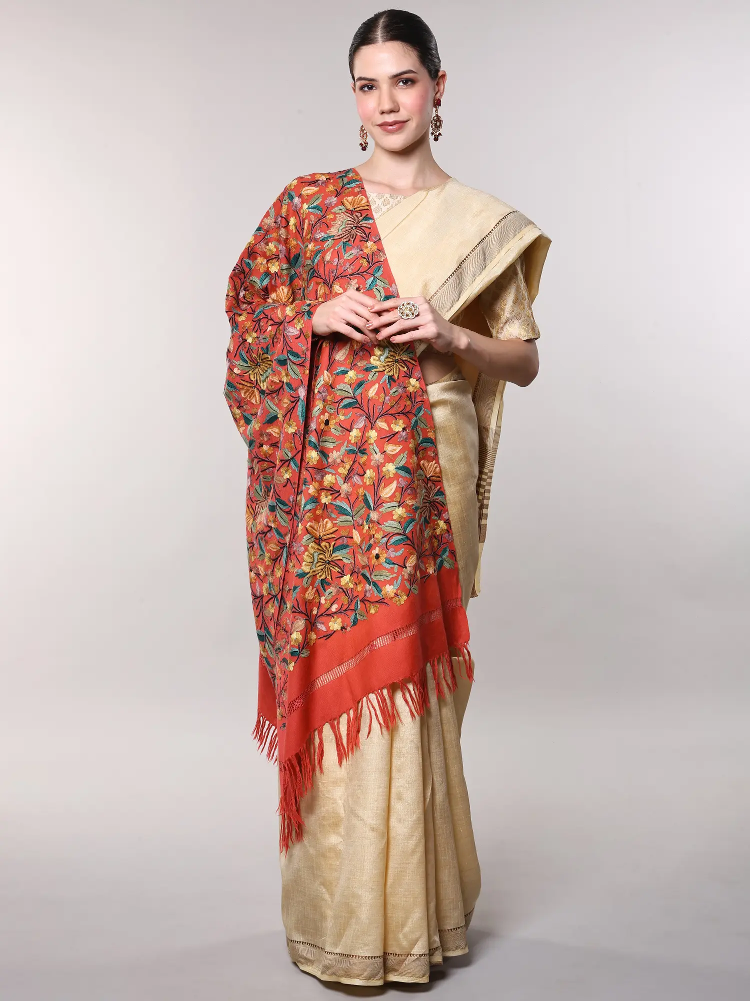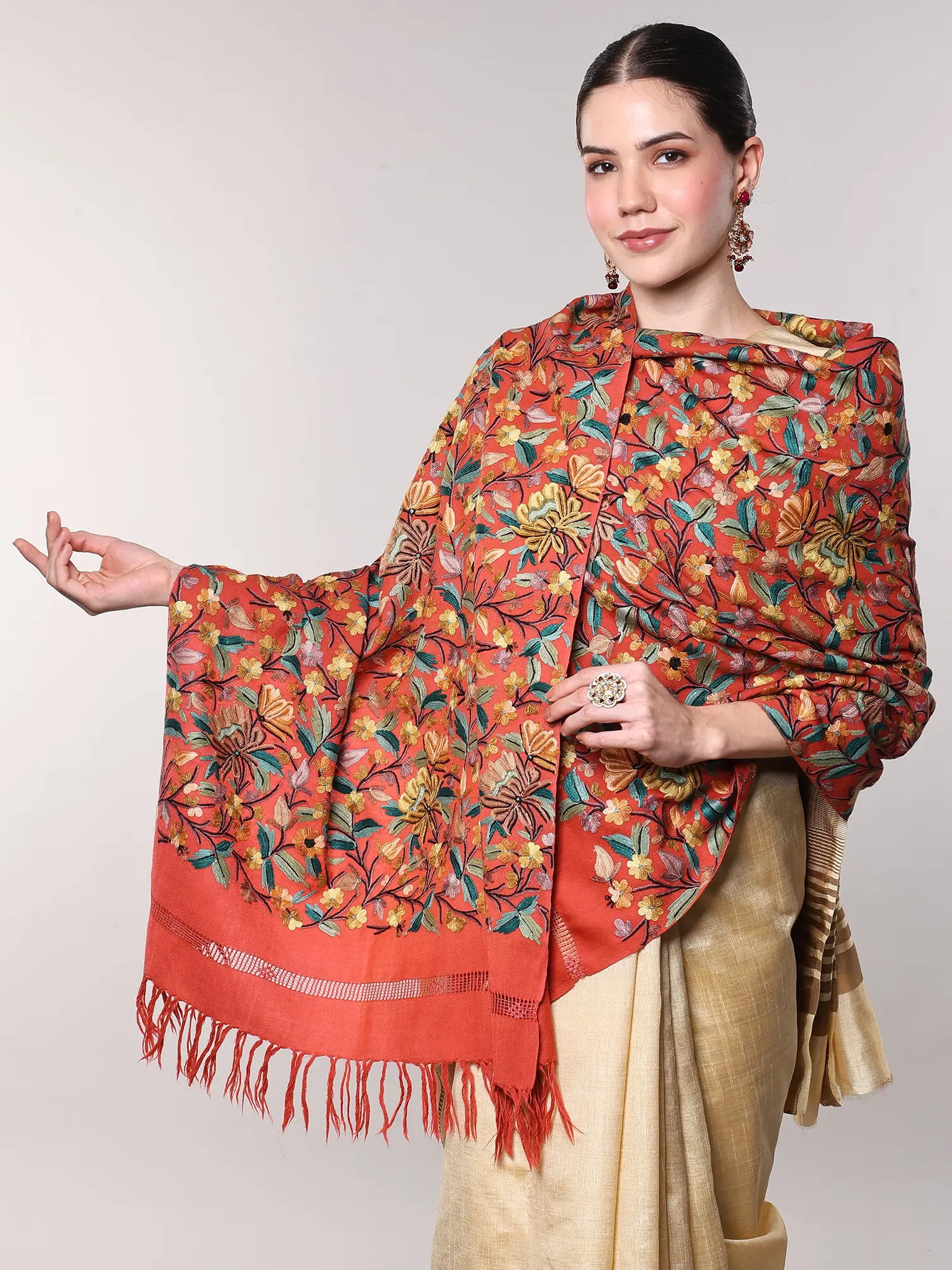 Pure Wool Shawl with Aari Embroidered Floral Jaal from Kashmir