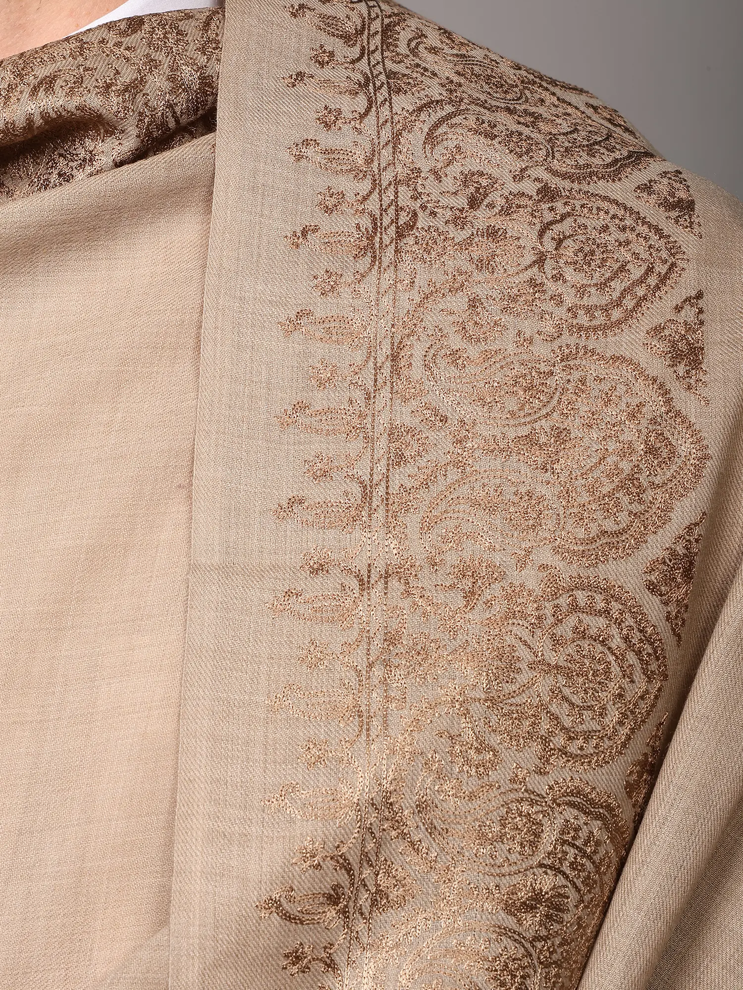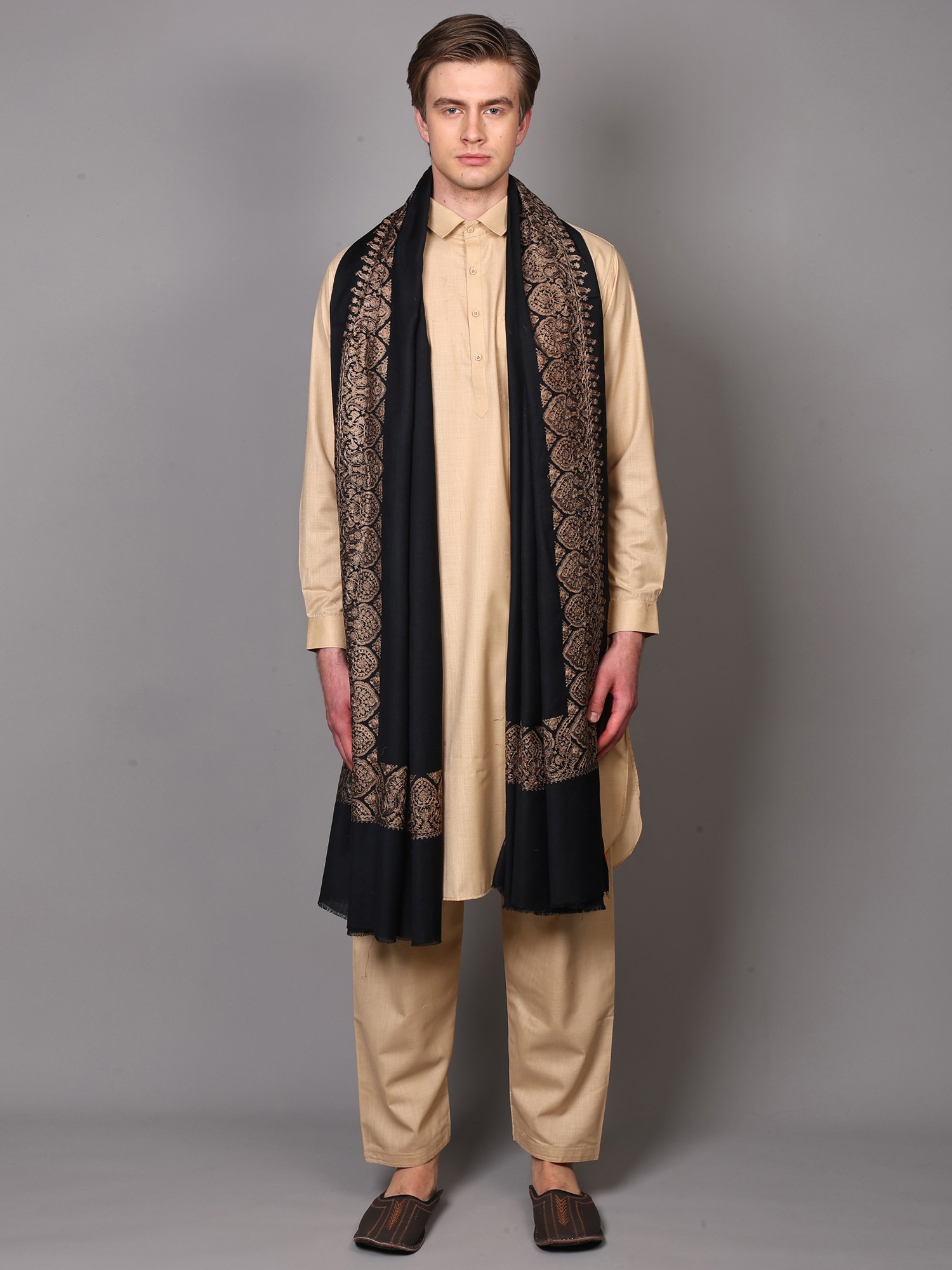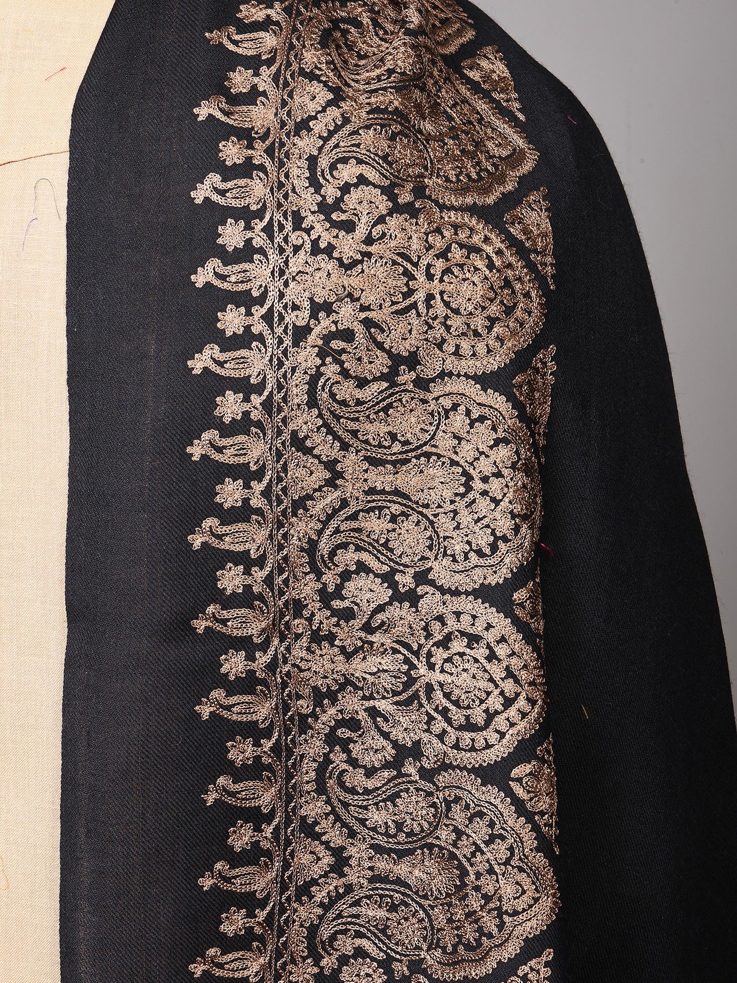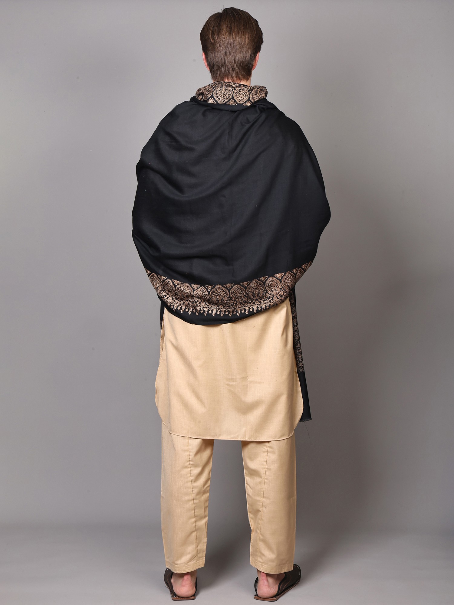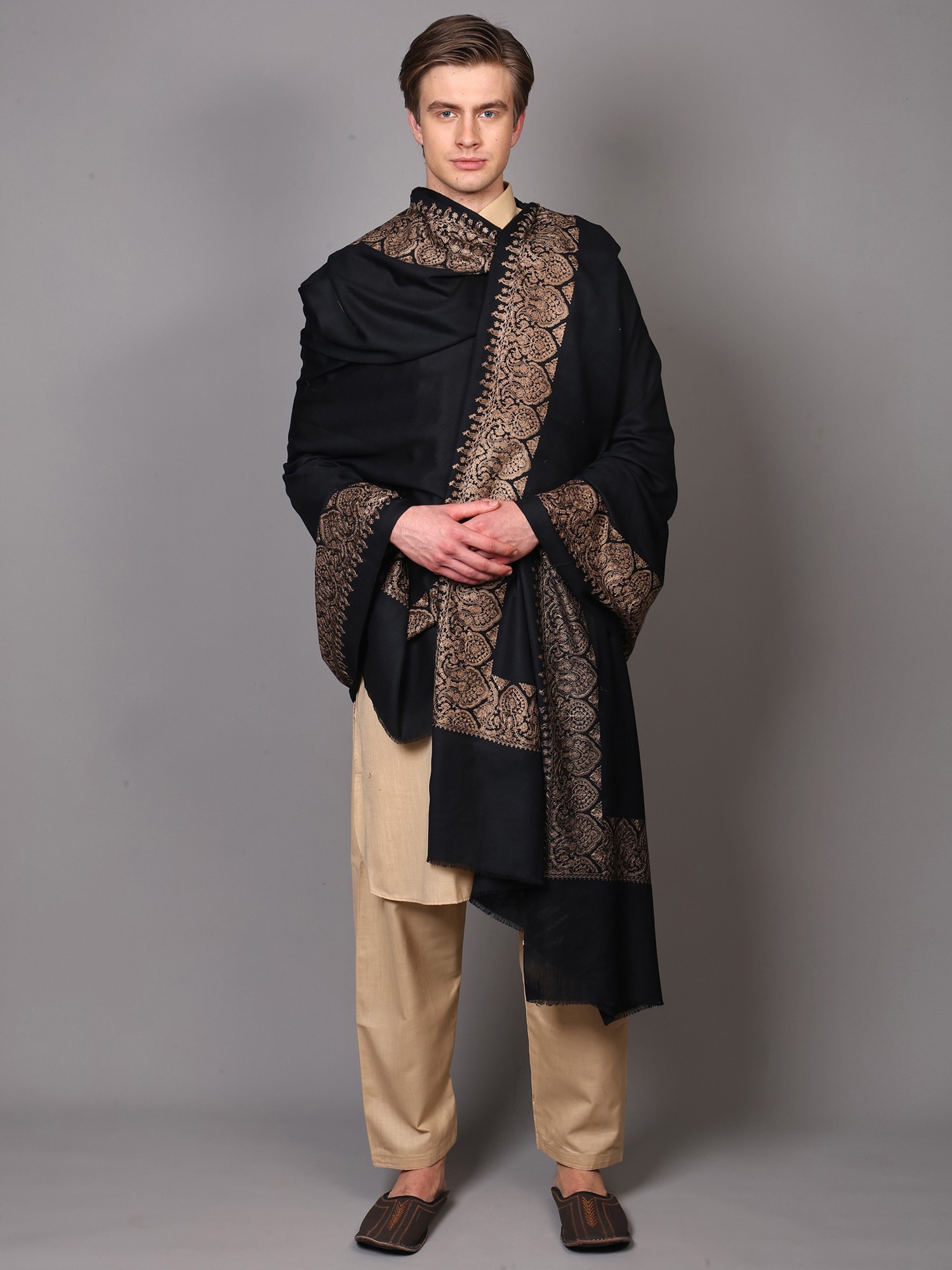 Pure Wool Men's Shawl from Amritsar with Aari Embroidered Paisley Jaal on All-Over