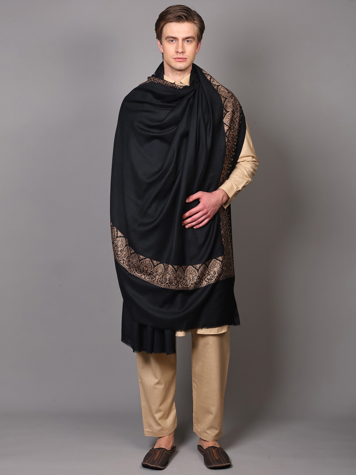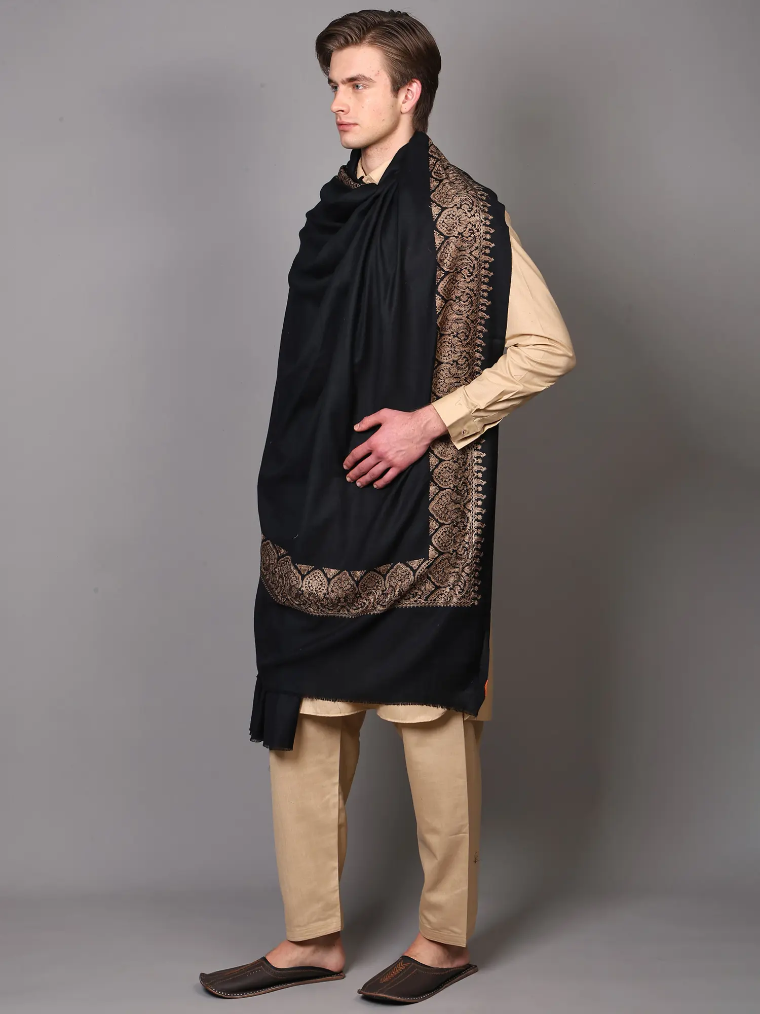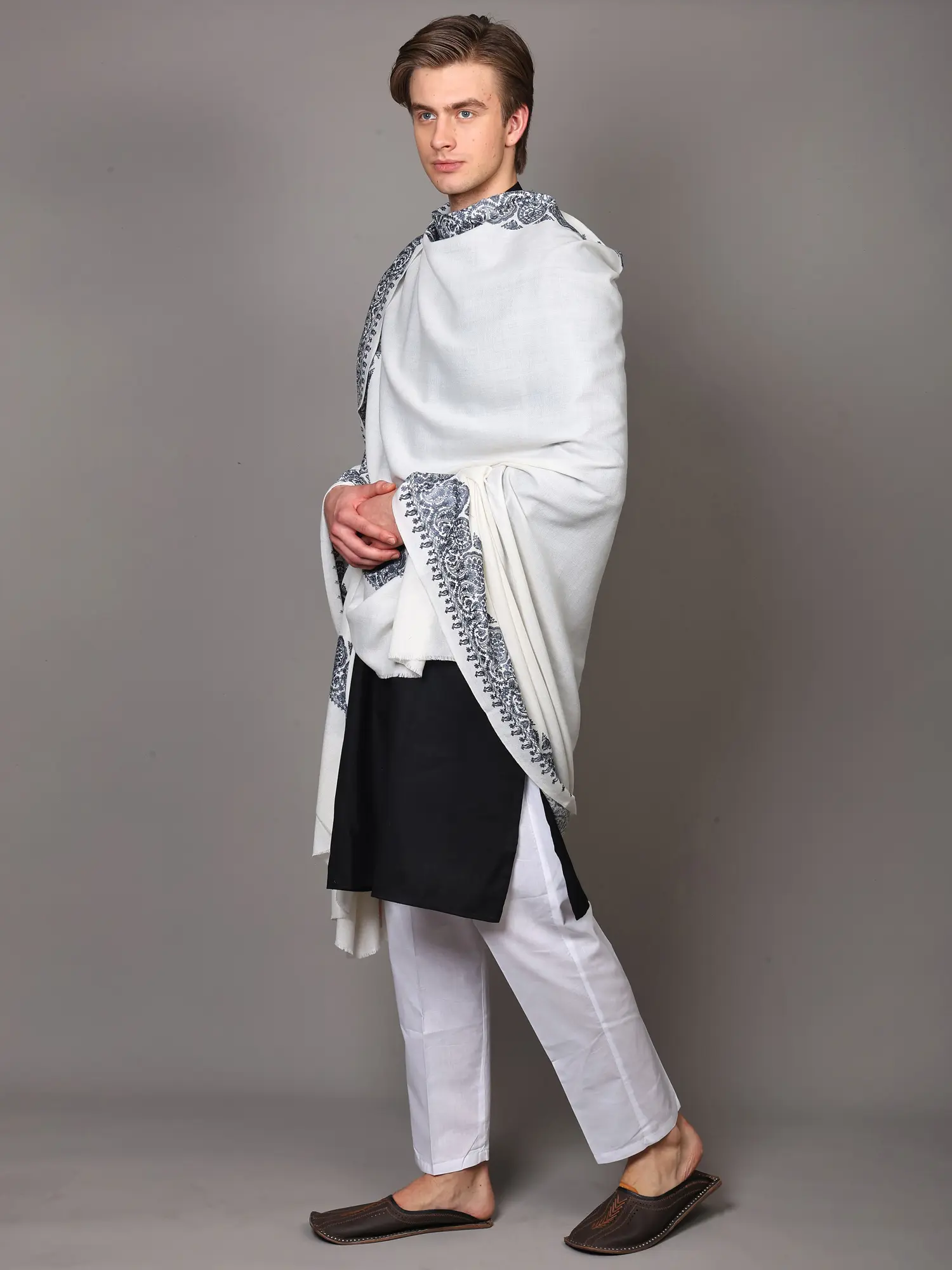 Pure Pashmina Shawl for Men with Sozni Hand-Embroidered Border and Paisley on Corners from Srinagar