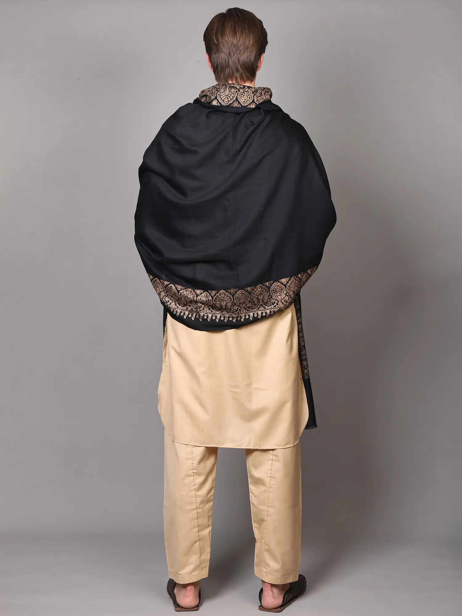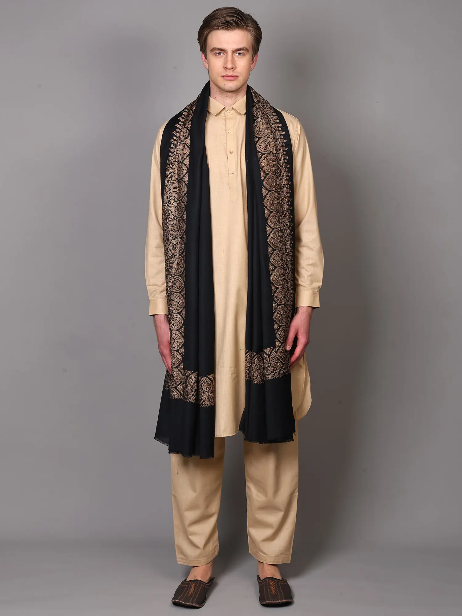 This pure wool shawl offers unparalleled versatility for the modern man. Its generous size allows for various styling options, whether draped elegantly over the shoulders for a formal occasion or worn more casually to add a layer of warmth and sophistication to everyday attire. The natural warmth and softness of pure wool make it an ideal companion for cooler weather, providing comfort without compromising on style. The classic black color ensures it can be seamlessly integrated into any wardrobe, complementing a wide range of outfits, from traditional kurtas and pajamas to more contemporary ensembles.
