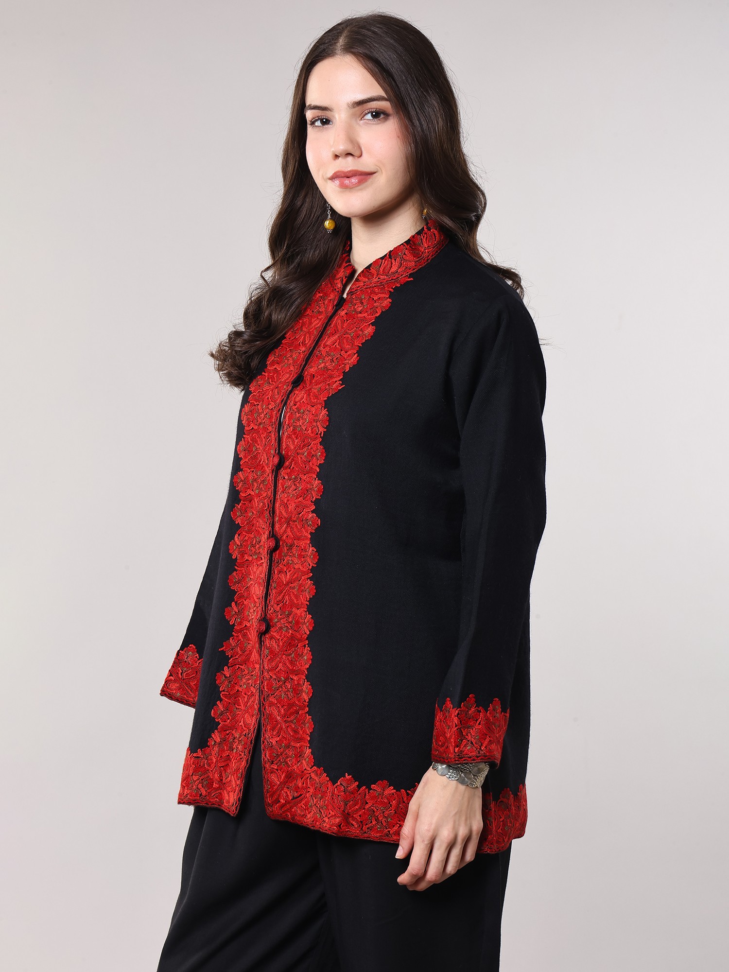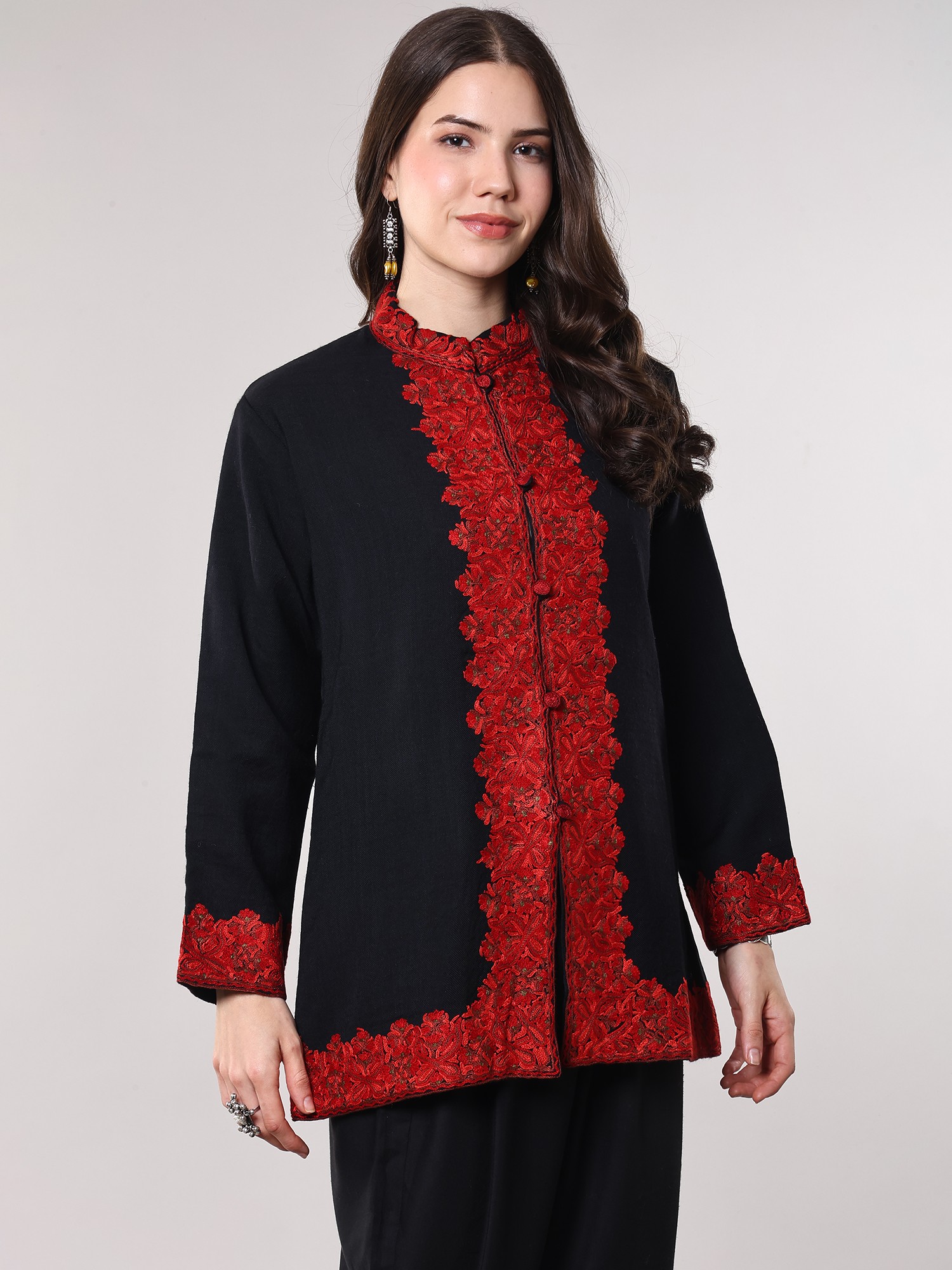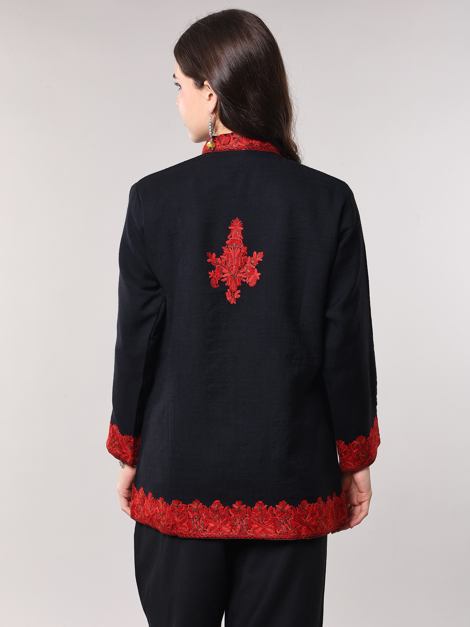 Wool Short Jacket with Aari Embroidered Floral Vines and Side Pockets from Kashmir