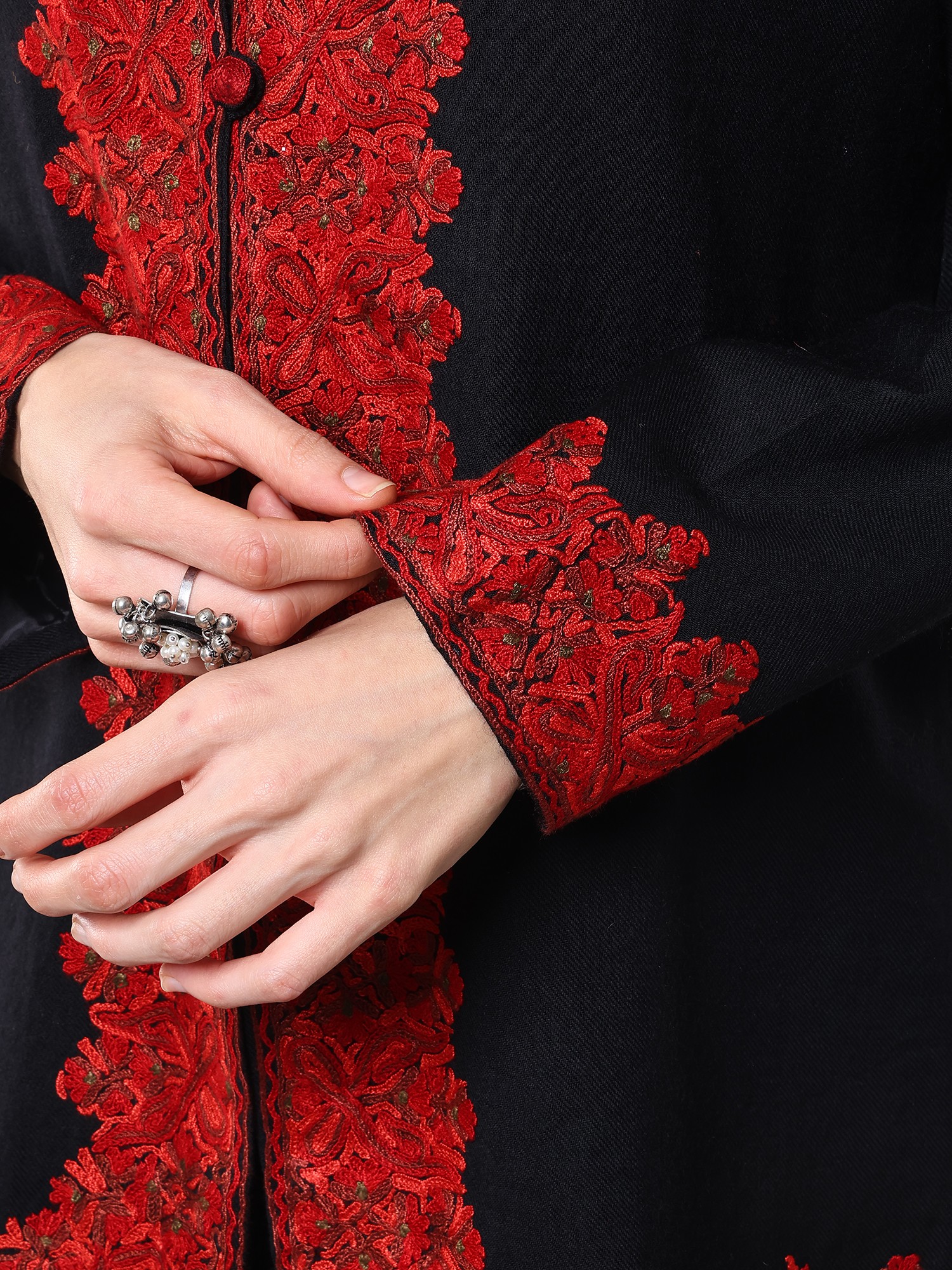 Woolen Charcoal Black with White Detailed Aari Embroidered Long Jacket from Kashmir