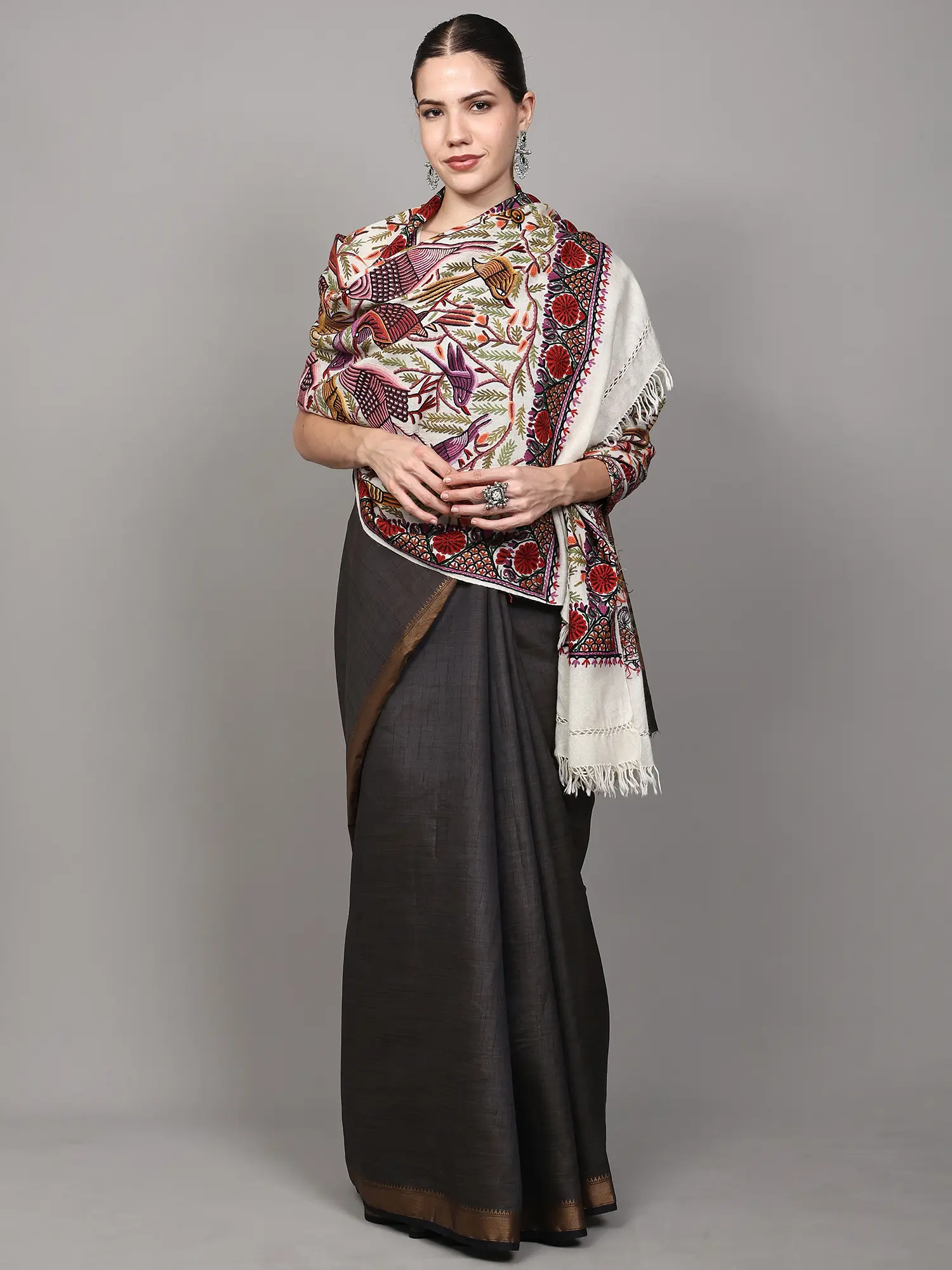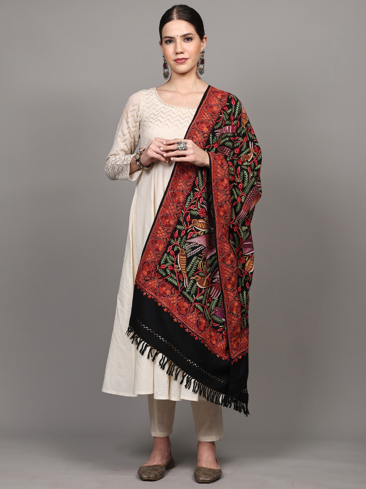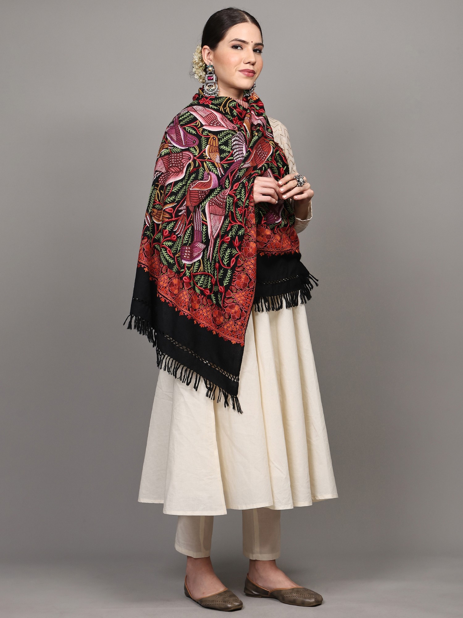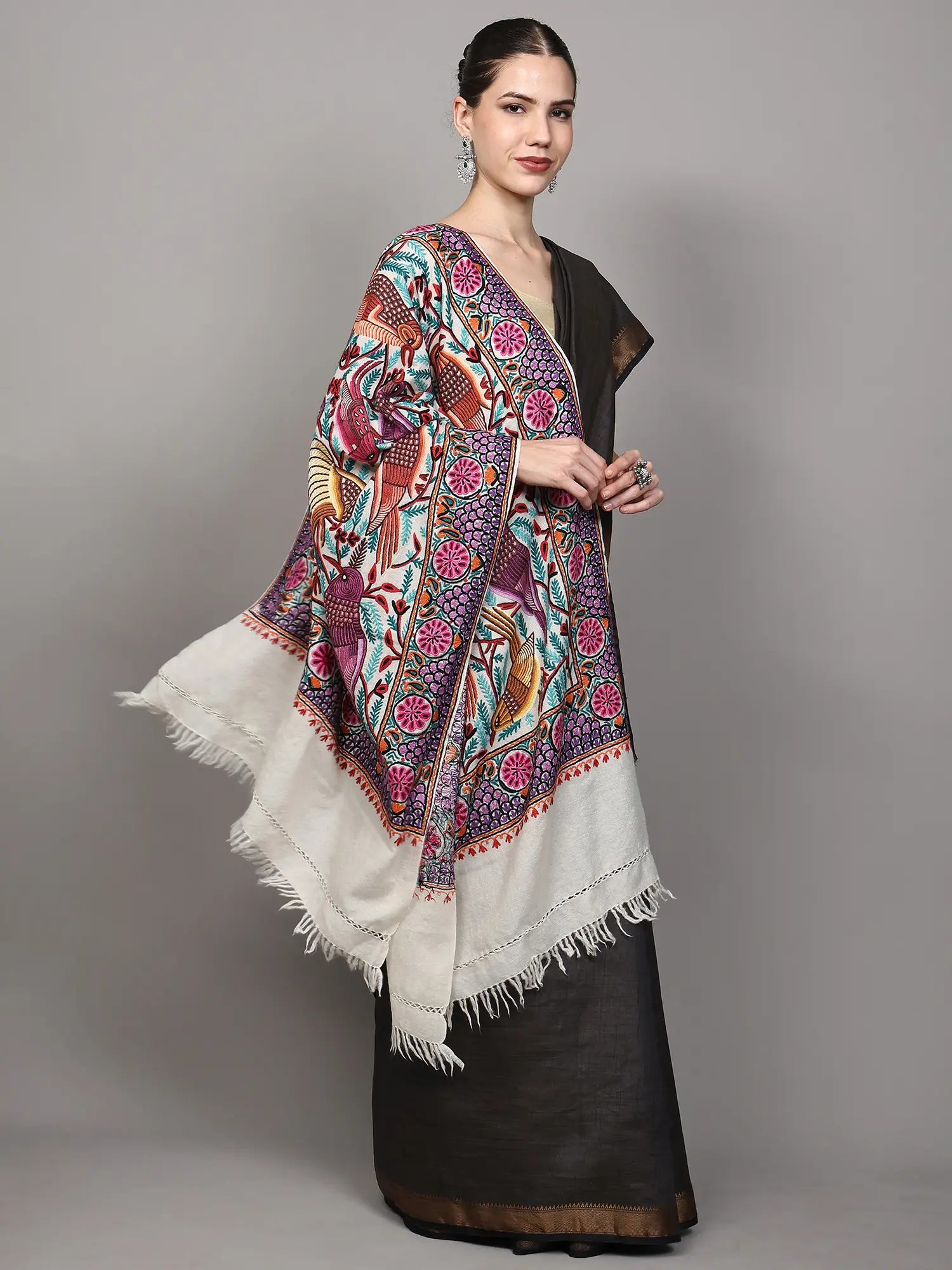 Pure Wool Stole from Kashmir with Aari Hand-Embroidered Butterflies