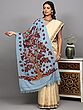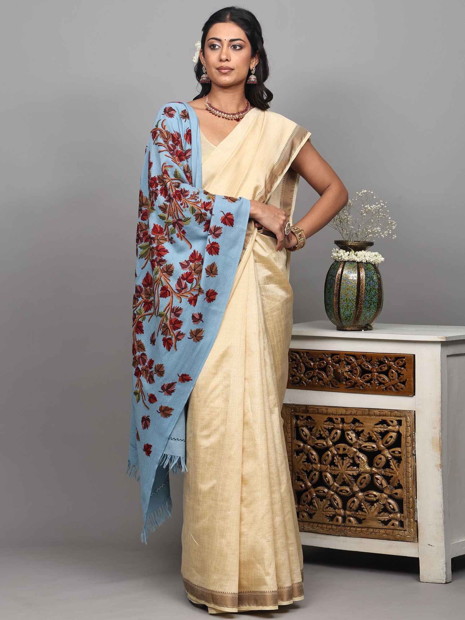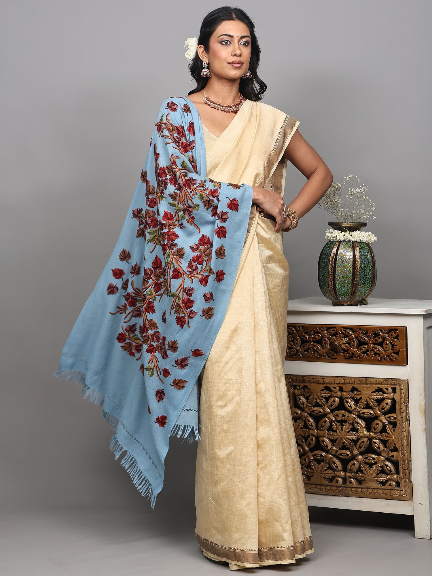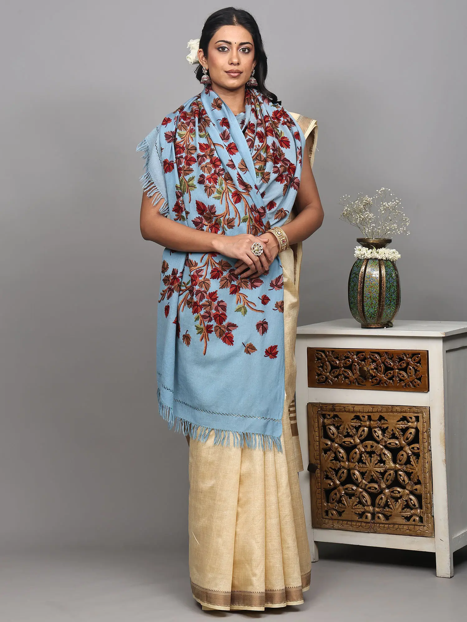 River-Blue Pure Wool Stole with Sozni Hand-Embroidered Paisleys on Border