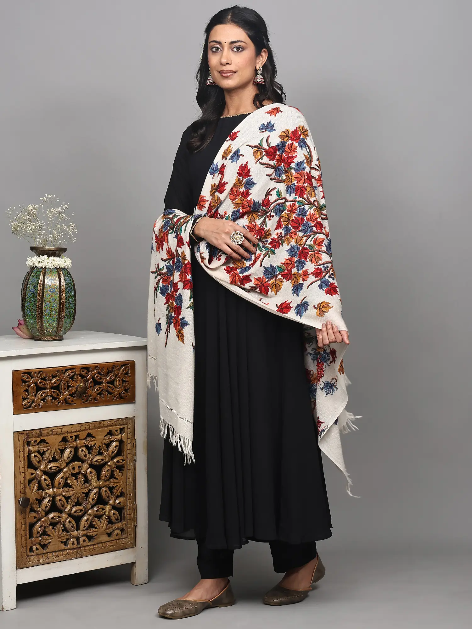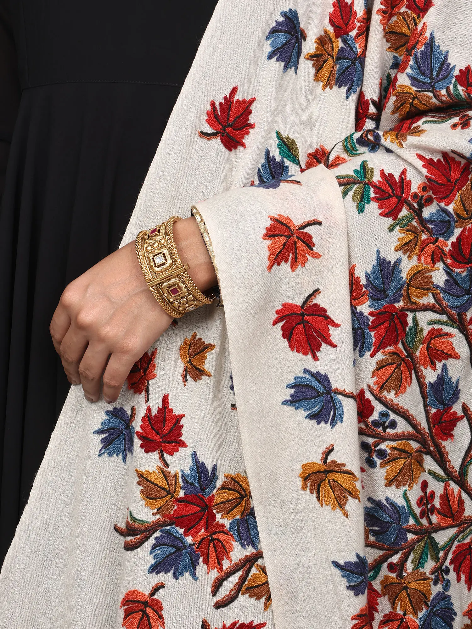 Moonless-Night Pure Wool Stole from Srinagar with Birds and Flowers Aari Embroidery by Hand