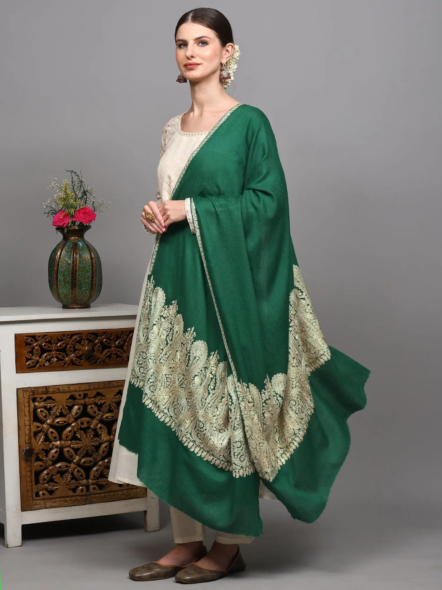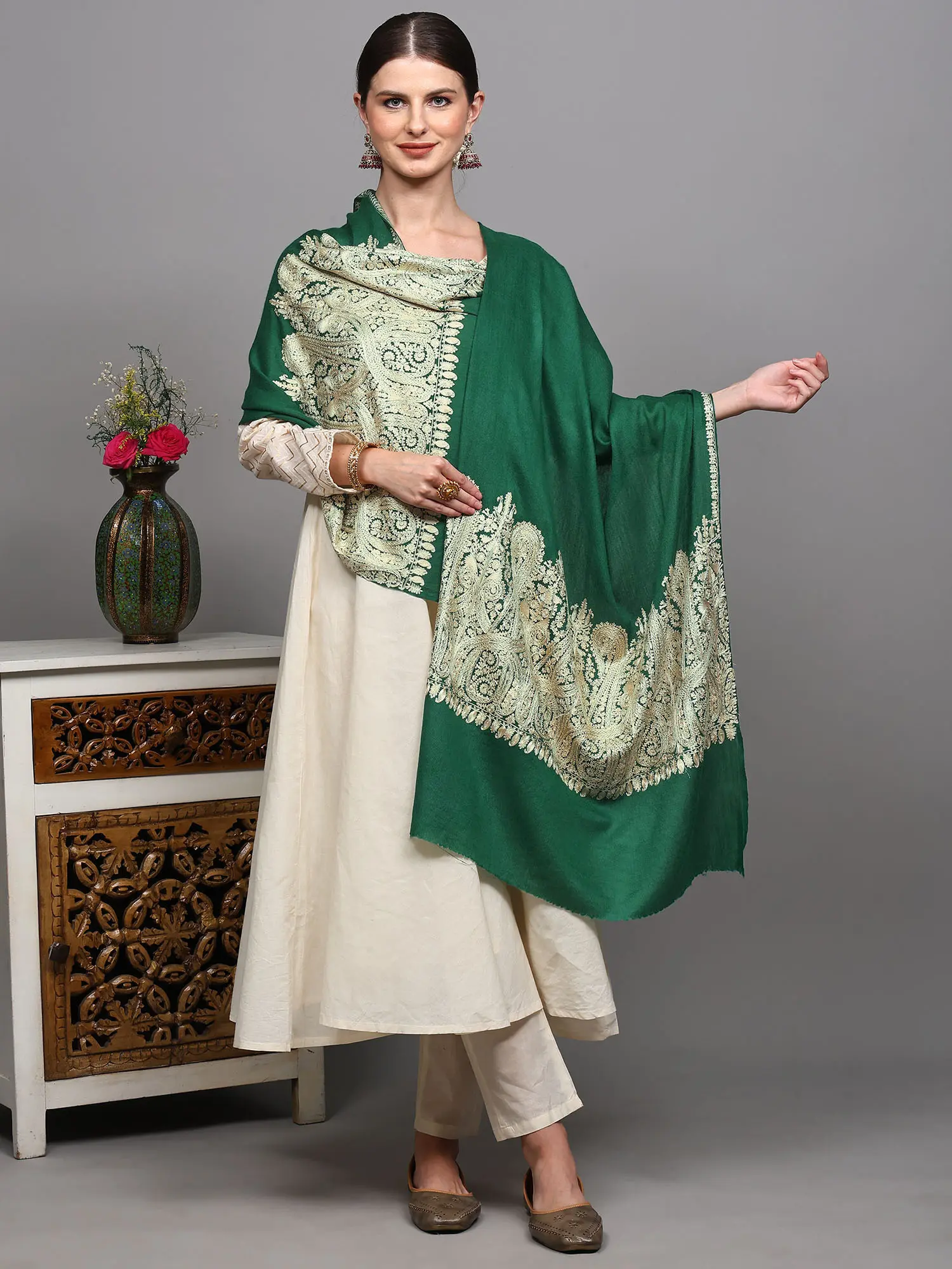 Jolly-Green Kashmiri Short Jacket with Aari Embroidered Paisleys Border