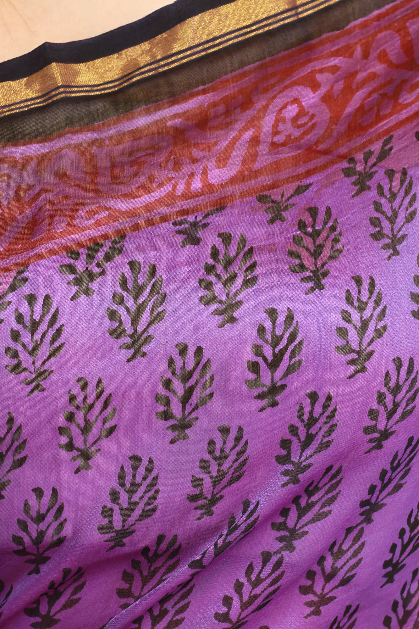 Mulberry-Purple Block-printed Chanderi Salwar Kameez Fabric with Golden Zari Border