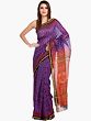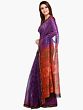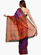 The dominant shade of rich, regal purple forms the foundation of this stunning piece, evoking a sense of royalty and grace. This captivating hue is beautifully complemented by the striking accents of fiery orange that appear in the intricate Kalamkari print adorning the border and pallu. The contrast between the deep purple and the warm orange creates a visual spectacle that is both eye-catching and harmonious, ensuring you stand out with understated sophistication.