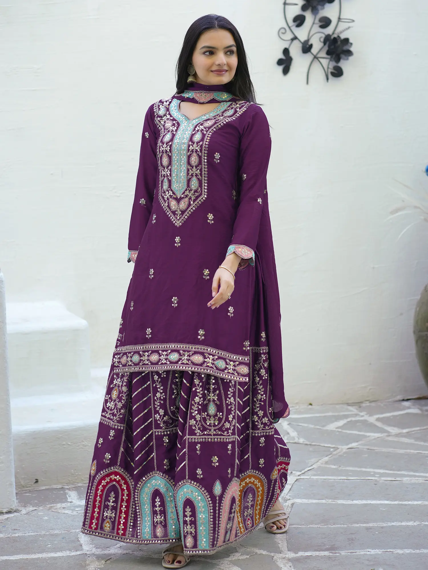 Step into a world of unparalleled sophistication with this breathtaking Chinon Kurti Palazzo set, a true testament to intricate craftsmanship and festive allure. Designed for the discerning individual who appreciates the finer details, this ensemble promises to make you the cynosure of every occasion. The rich, deep purple hue of the Chinon fabric serves as a perfect canvas for the elaborate embroidery and dazzling sequins that adorn every inch of this creation.