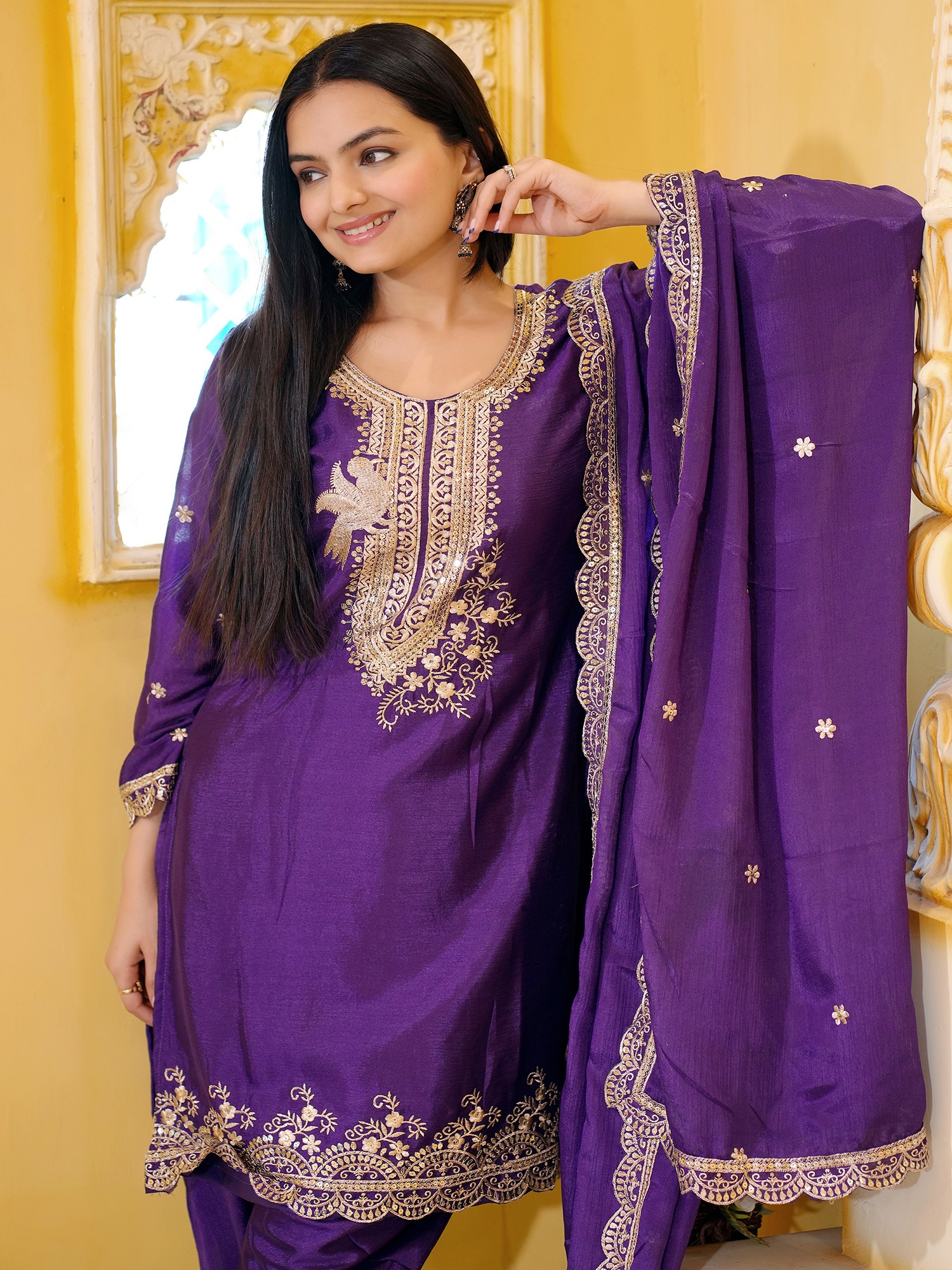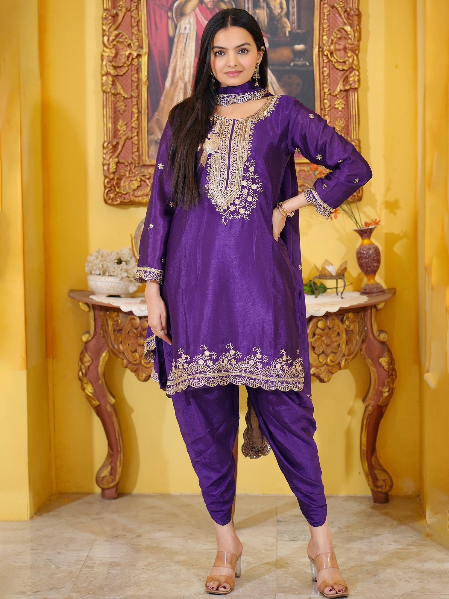Completing this captivating set is the classic Patiala salwar. Known for its comfortable and flattering pleated design, the Patiala adds a traditional yet stylish dimension to the outfit. The voluminous pleats gather at the waist and fall gracefully to the ankles, offering a relaxed fit without compromising on elegance. The rich purple fabric of the salwar mirrors the kameez, creating a harmonious and striking ensemble.