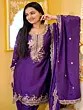 Immerse yourself in the rich allure of this exquisite Purple-Iris Chinon Patiala Salwar Suit. Crafted from luxurious Chinon fabric, this ensemble drapes beautifully, offering both comfort and a sophisticated sheen that captures the light with every movement. The deep, vibrant purple hue evokes a sense of royalty and confidence, making it a perfect choice for special occasions, festive gatherings, or any moment you wish to feel truly special.