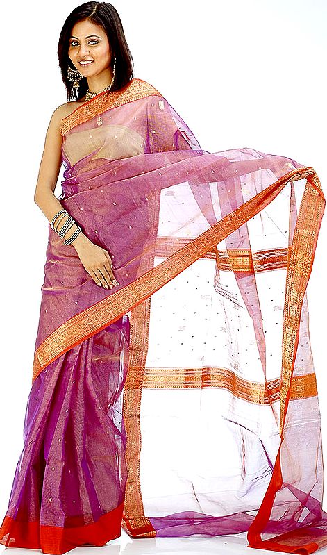 The captivating shade of purple is both regal and contemporary, offering a fresh take on traditional saree colors. Purple is often associated with royalty, wisdom, and creativity, making it an ideal choice for women who embody these qualities. The gentle hue complements a variety of skin tones, adding a touch of vibrancy and sophistication to your look. The shade exudes a sense of calm and composure, making it perfect for both daytime and evening events. The golden thread work adds a touch of opulence, creating a harmonious balance between the subtle base color and the shimmering accents.