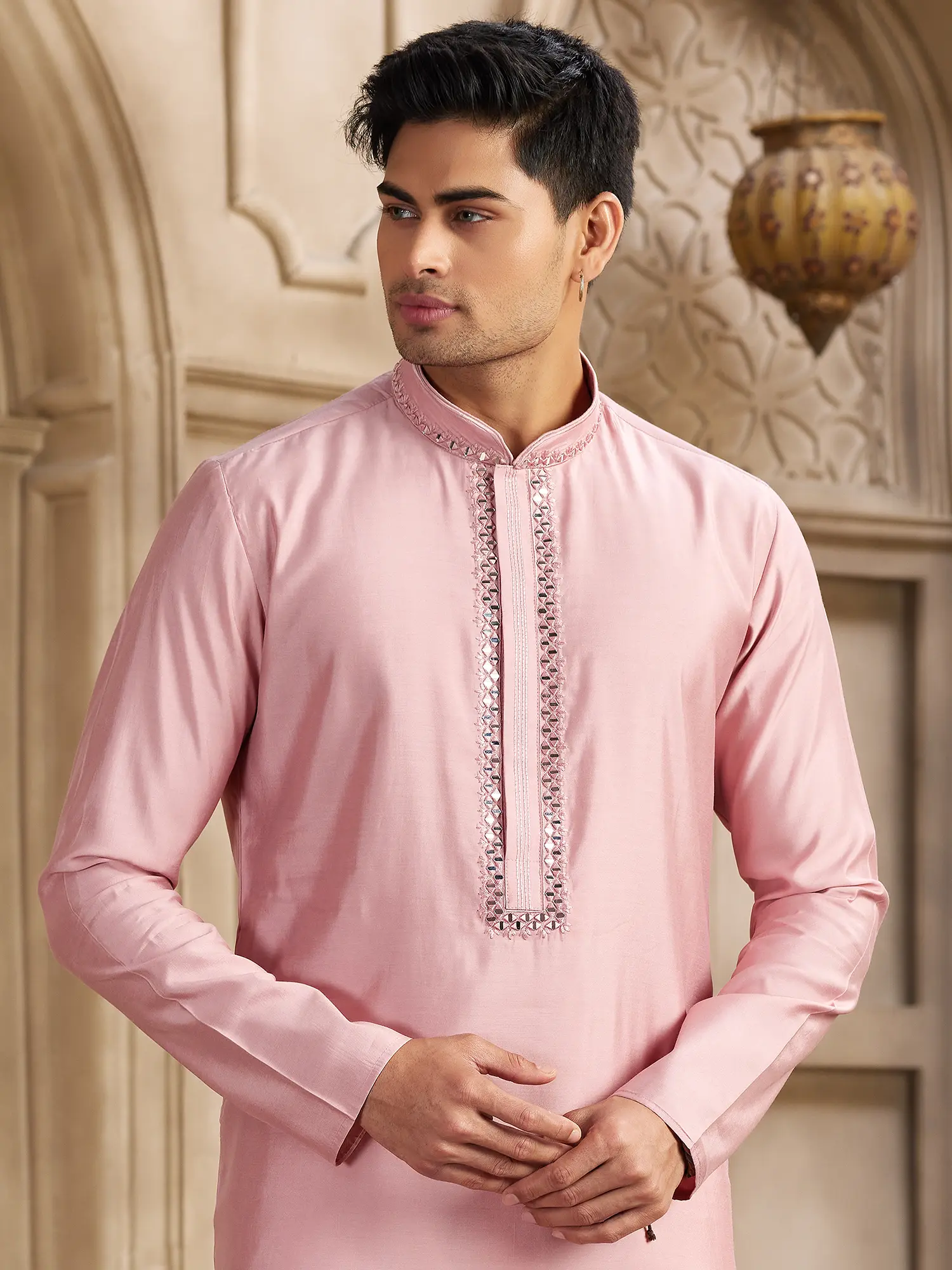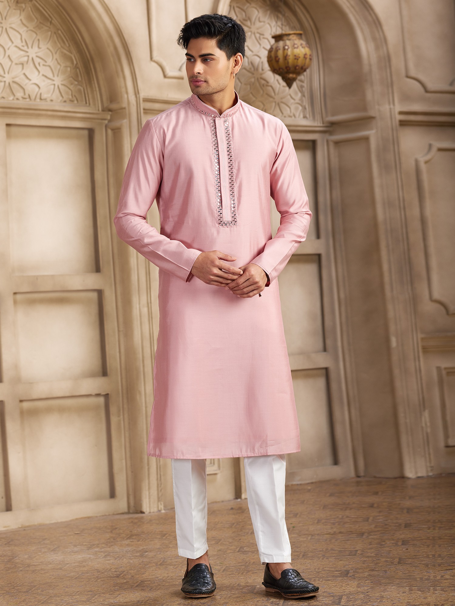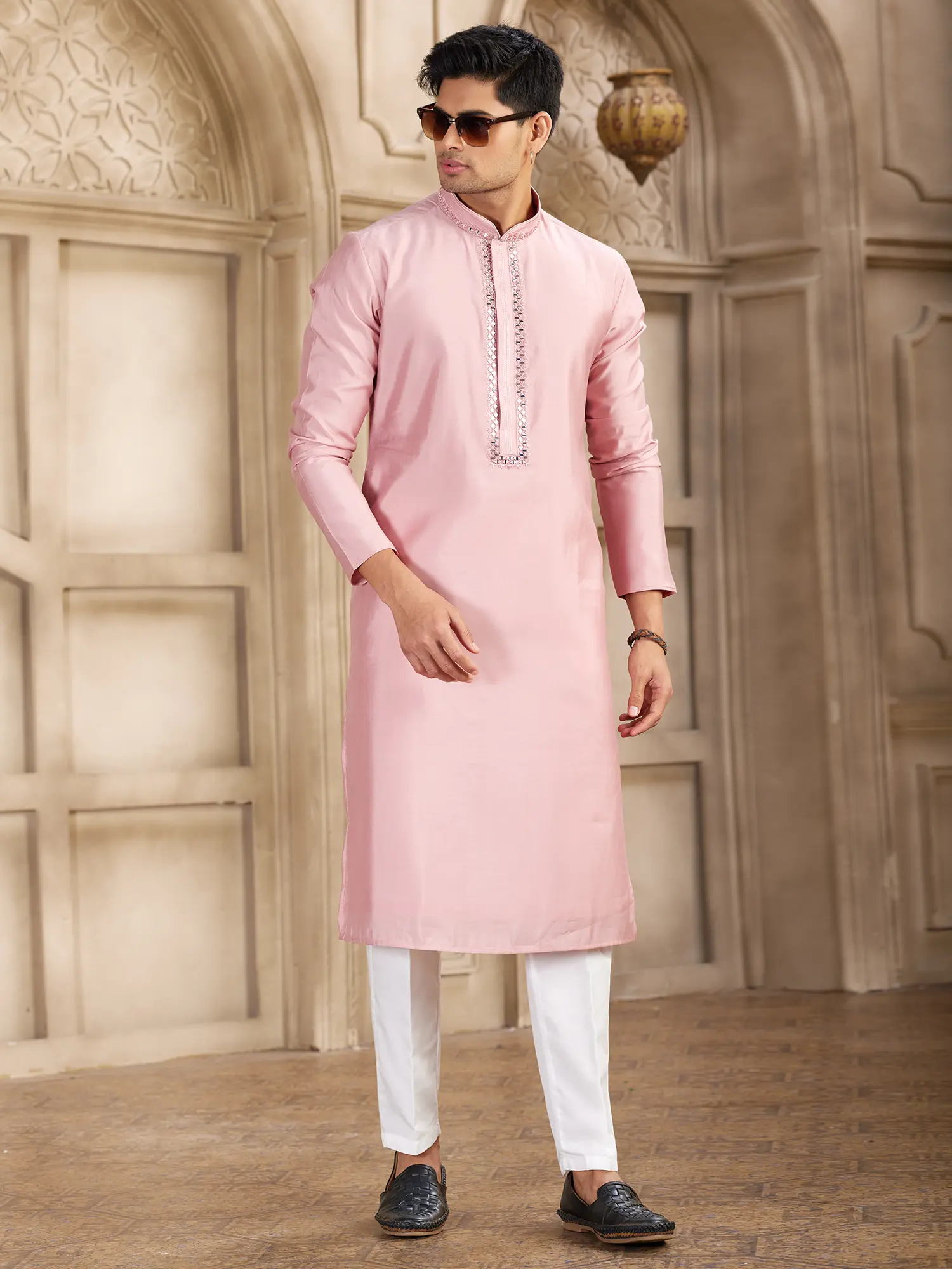 This Banarasi Art Silk Kurta Pajama set is tailor-made for those special moments that call for an extra touch of grandeur. Whether you are attending a wedding ceremony, a festive gathering, or an elegant party, this ensemble is guaranteed to make you stand out. The understated elegance of the pink hue, combined with the sparkling mirror work and the comfortable fit, creates a harmonious blend of tradition and modern fashion. Pair it with classic Juttis or mojaris to complete a look that is both timeless and undeniably stylish. Embrace the spirit of celebration with an outfit that truly reflects your impeccable taste.