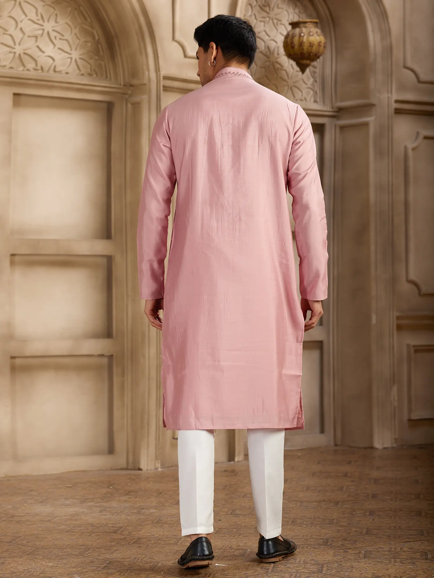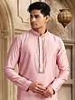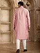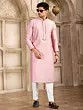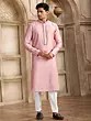 Step into a world of refined sophistication with this exquisite Banarasi Art Silk Kurta Pajama set. Designed for the discerning gentleman, this ensemble embodies a perfect fusion of traditional craftsmanship and contemporary style, making it an indispensable addition to your festive and celebratory wardrobe. The subtle yet captivating shade of pink exudes a gentle charm, promising to make you the center of attention at any occasion.
