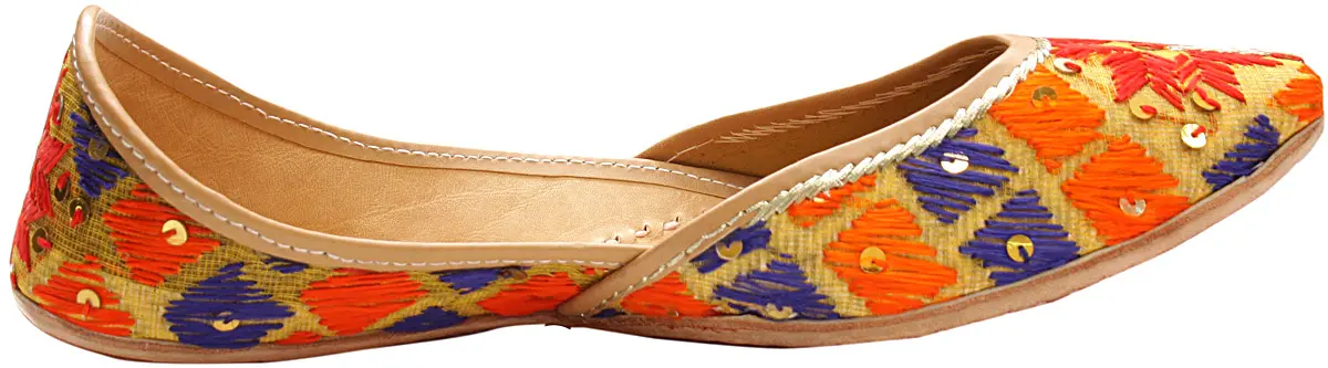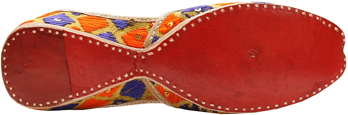 The radiant orange and blue hues symbolize vitality, creativity, and enthusiasm, igniting your spirit with every stride. Adorned with delicate thread embroidered flowers and glistening sequins, these jootis captivate with their unparalleled beauty. Embrace the fusion of tradition and style, and let your feet dazzle in the enchanting allure of this pair of Jooti.
