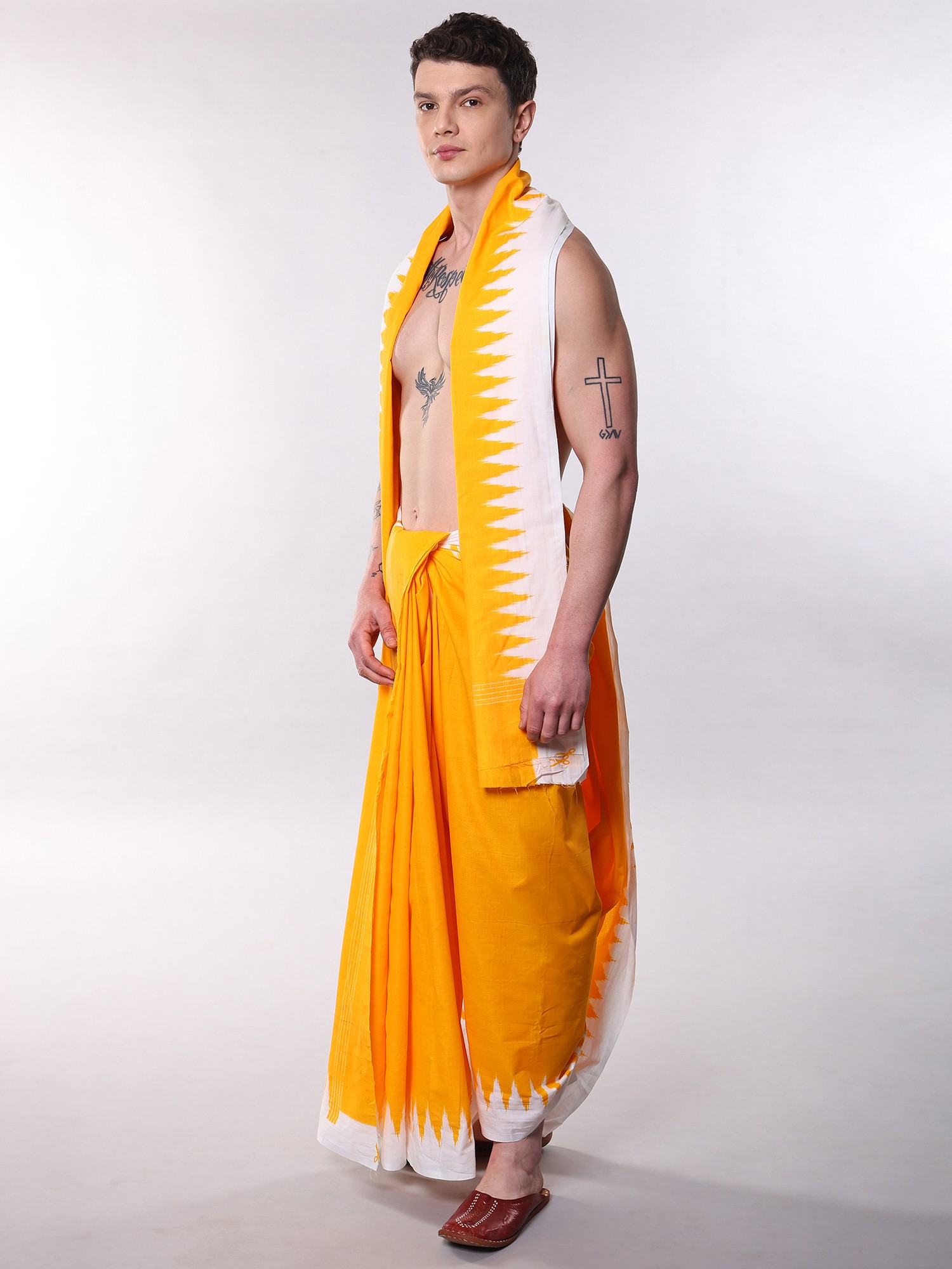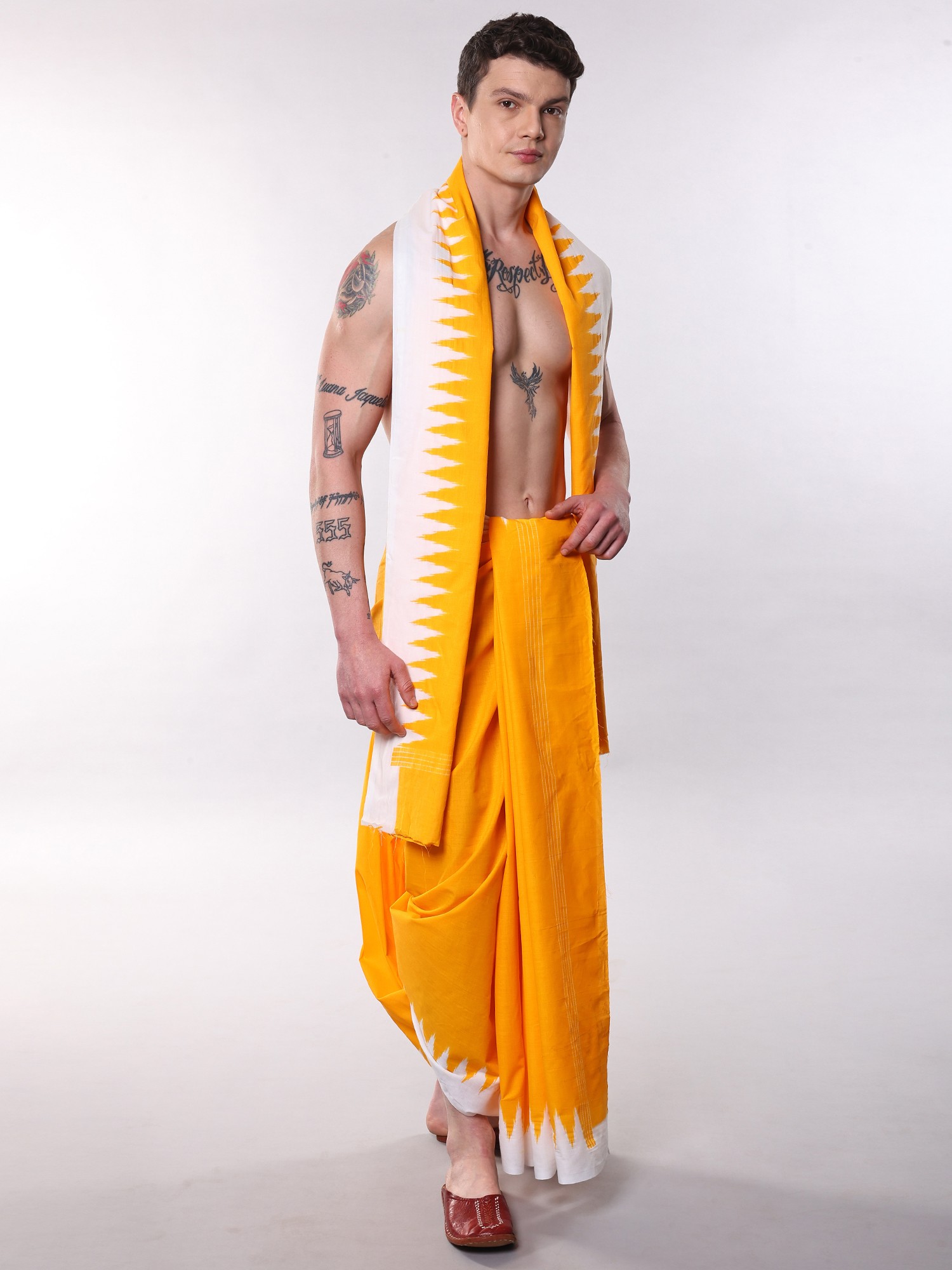 You'll be captivated by the vibrant, sun-kissed hue that defines the dhoti, a shade that speaks of warmth and festivity. This richness is beautifully complemented by the accompanying angavastram, which features a striking temple border print. The interplay of the radiant yellow and the crisp white, accented by the geometric motifs, creates a visually arresting and sophisticated statement. The generous dimensions of both pieces allow for graceful draping, ensuring a comfortable and flattering fit for any wearer.
