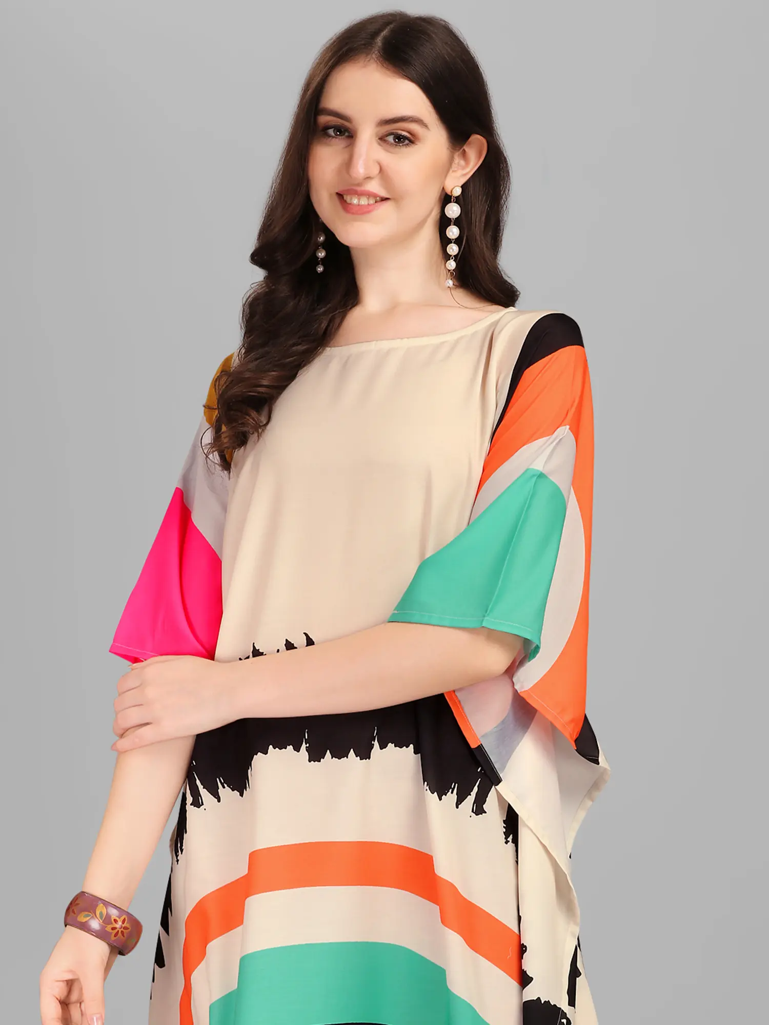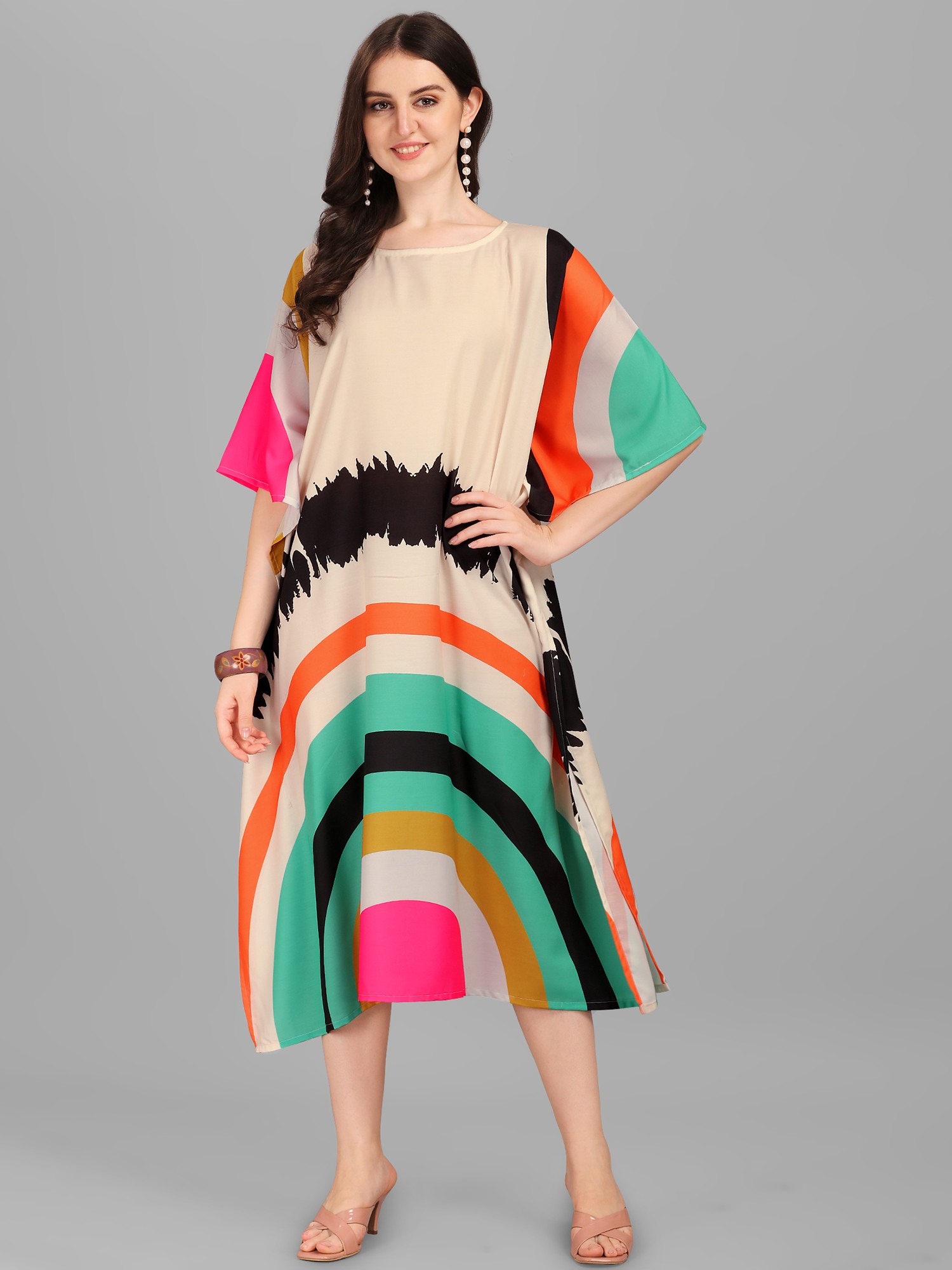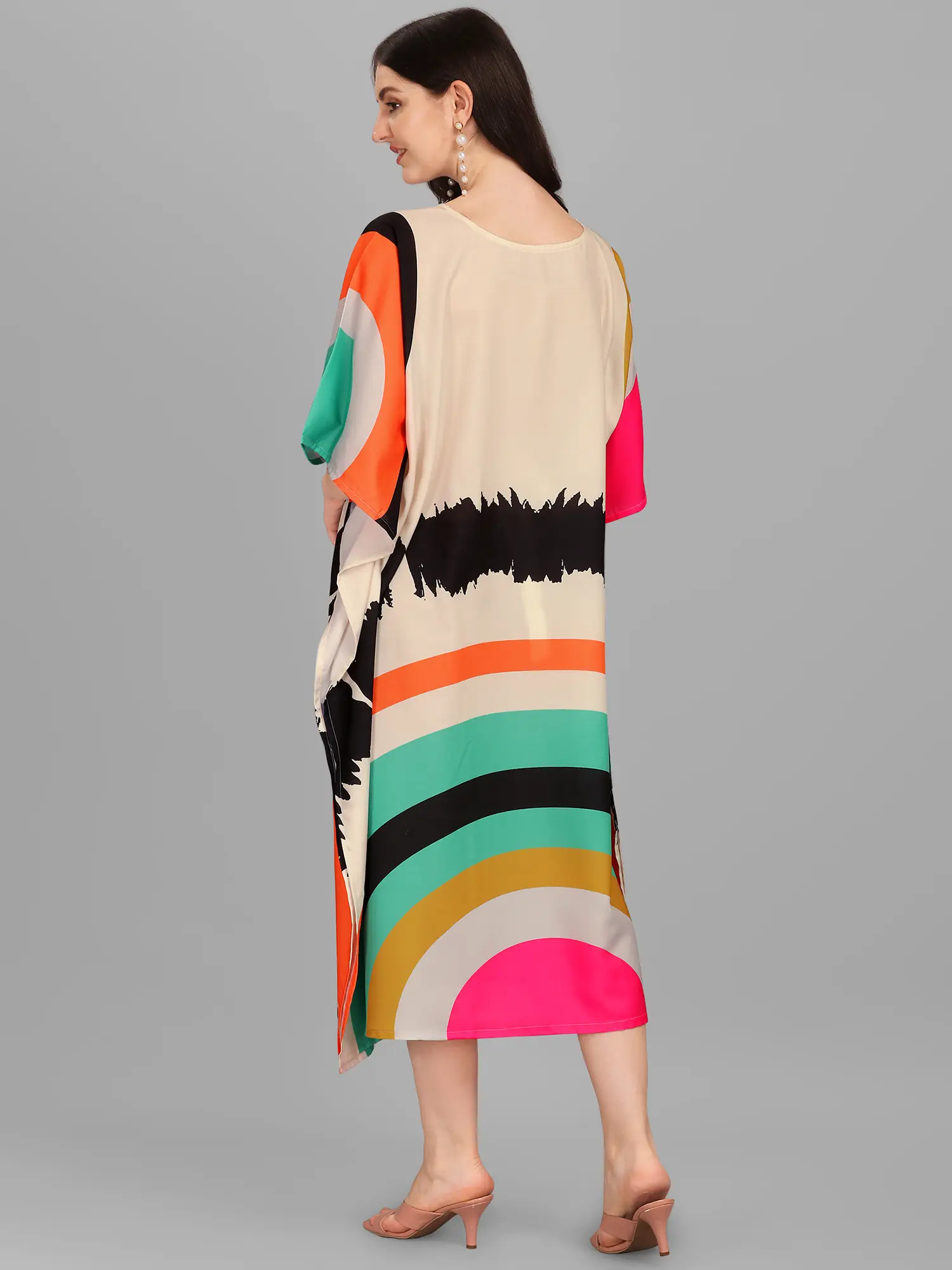 Multicolor Printed Rayon Boat Neck Midi Kaftan