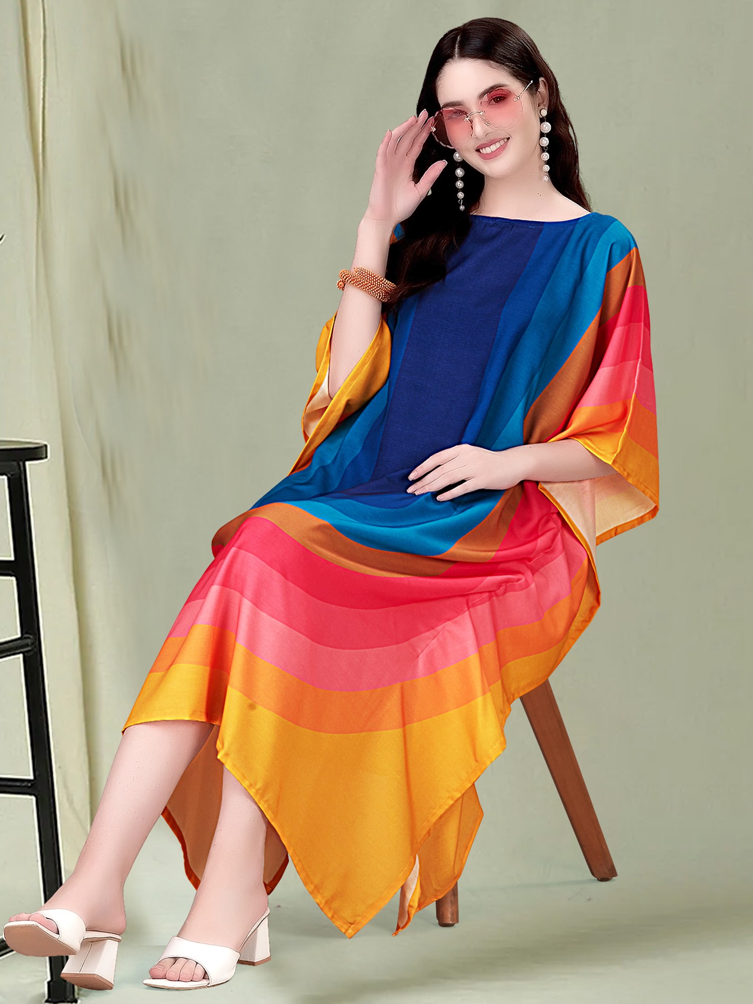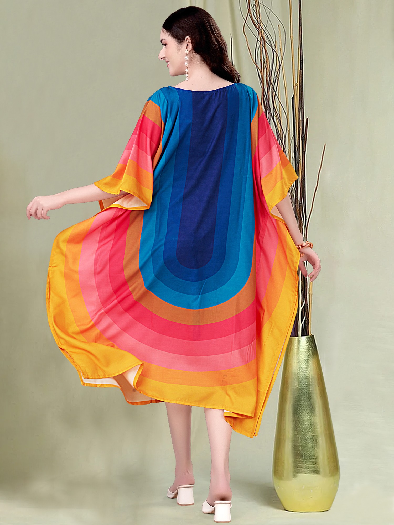 Multicolor Printed Rayon Boat Neck Midi Kaftan