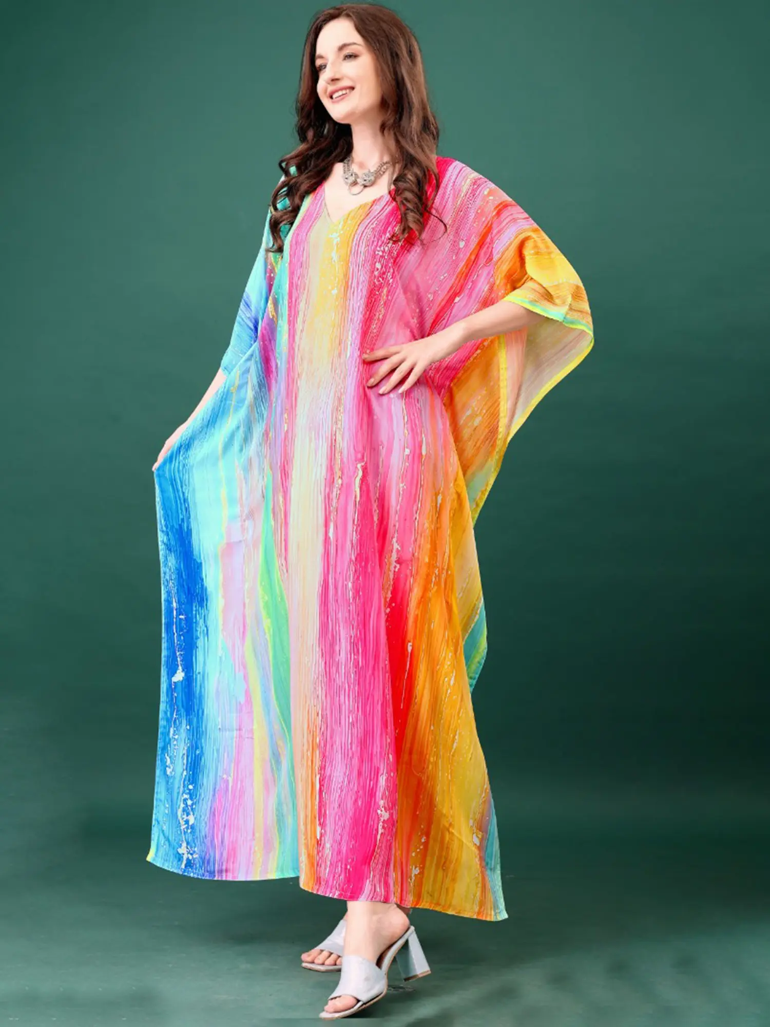 Multicolor Art Silk Stone work Short Kaftan with Internal Drawstring and Printed Motifs